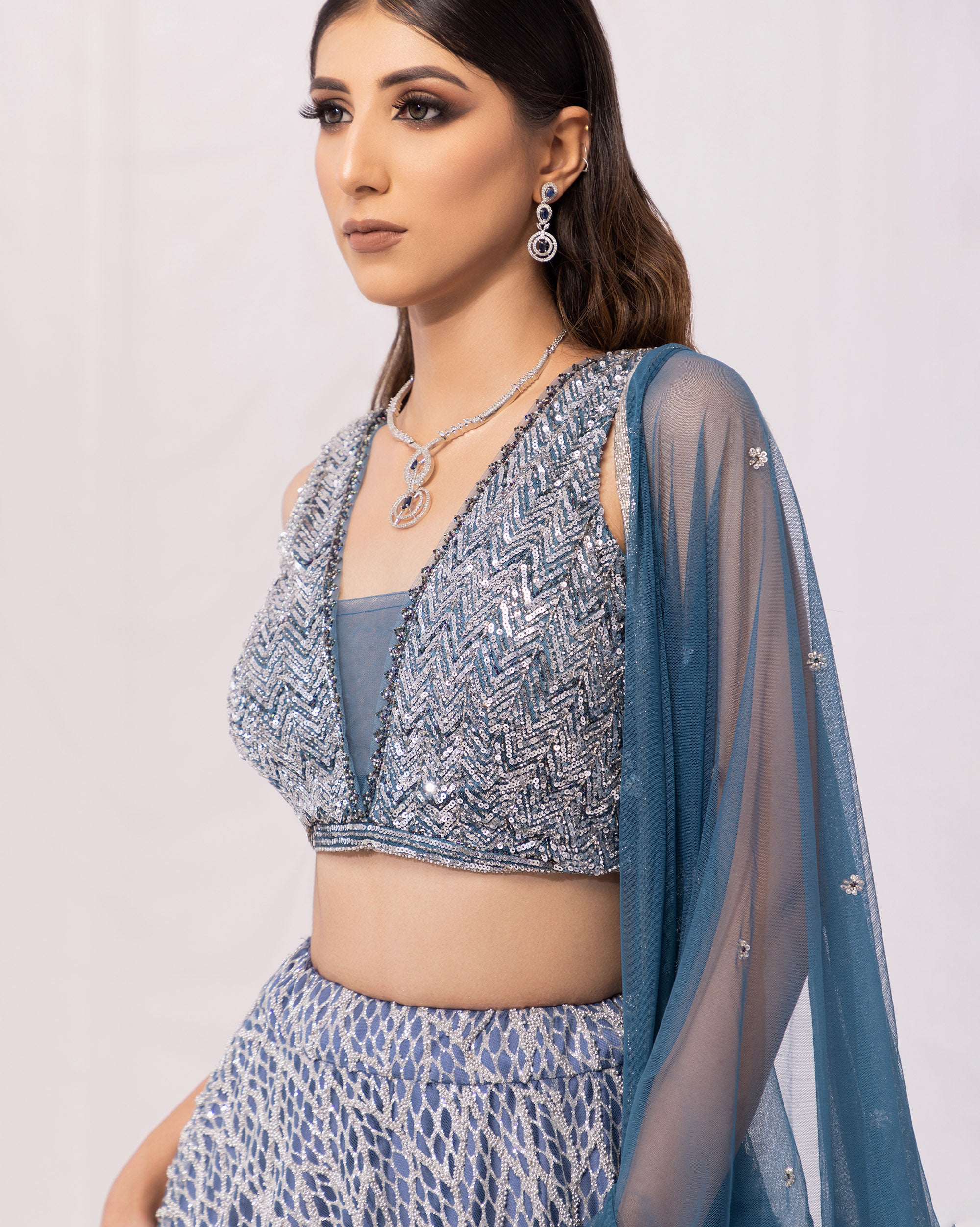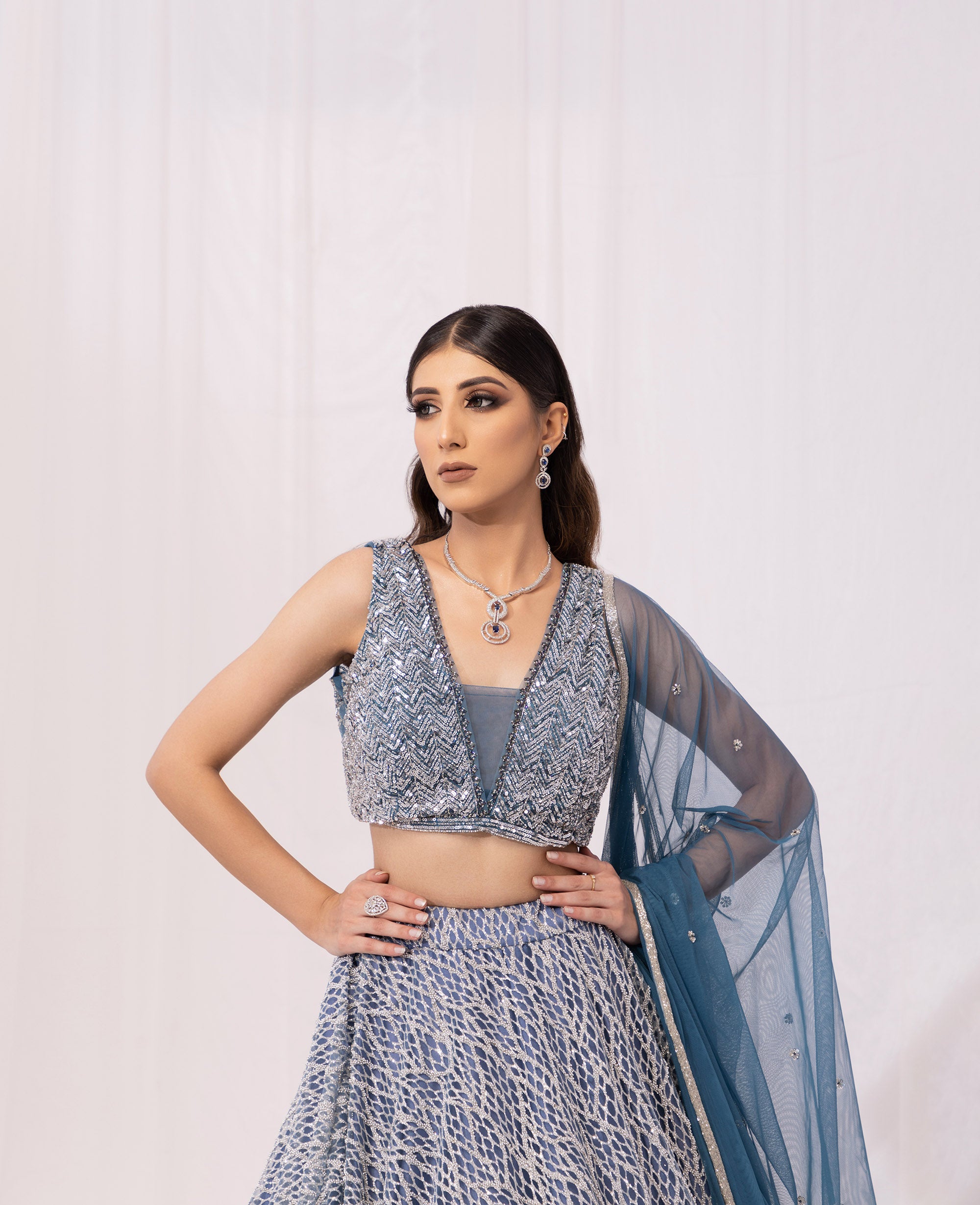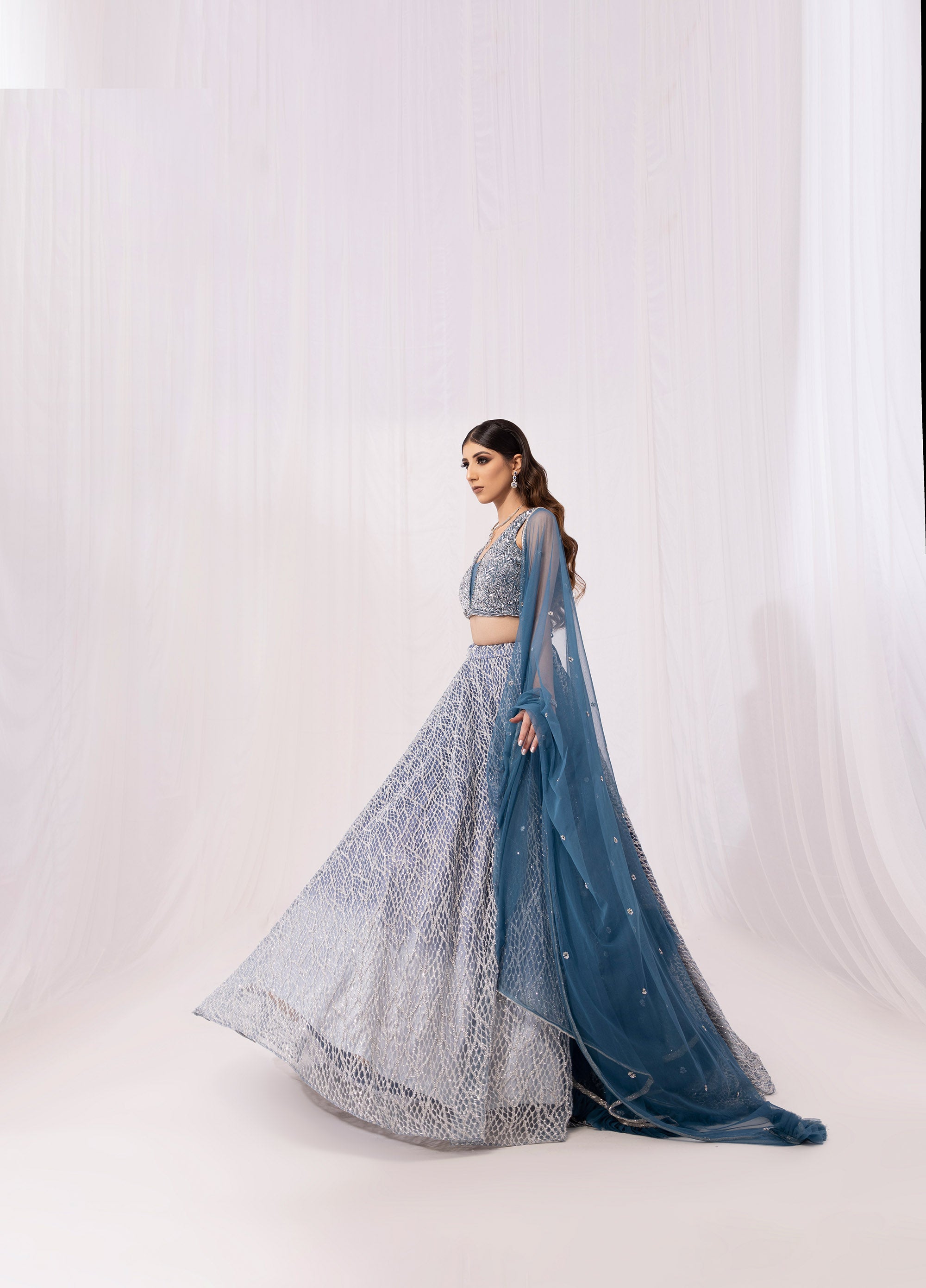 Blue Sequins Embroidery Net Bridesmaid Lehenga