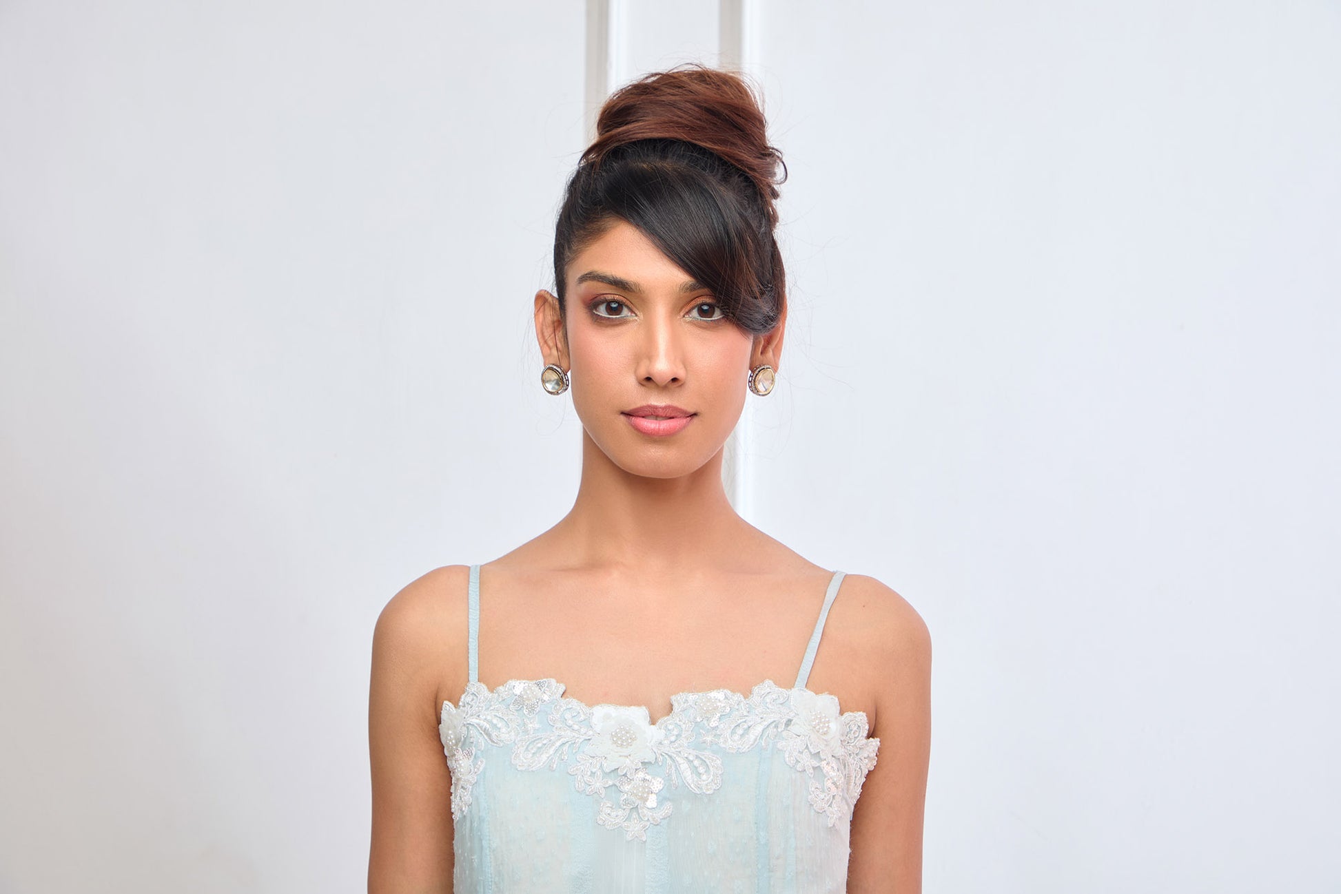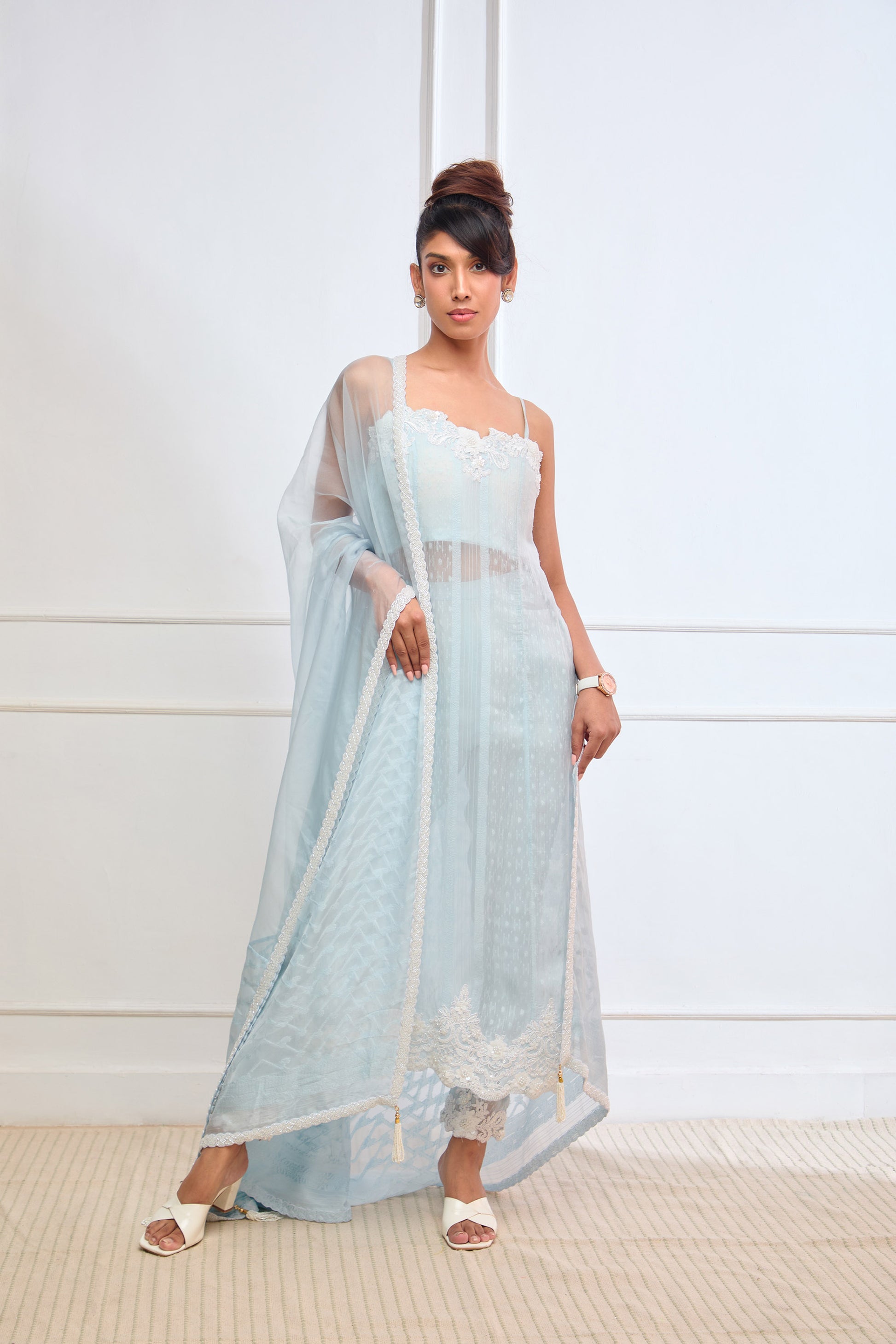 Straightfit noodle strap kurta with an embellished sweetheart neckline paired with trousers and embellished organza and jamdani dupatta.