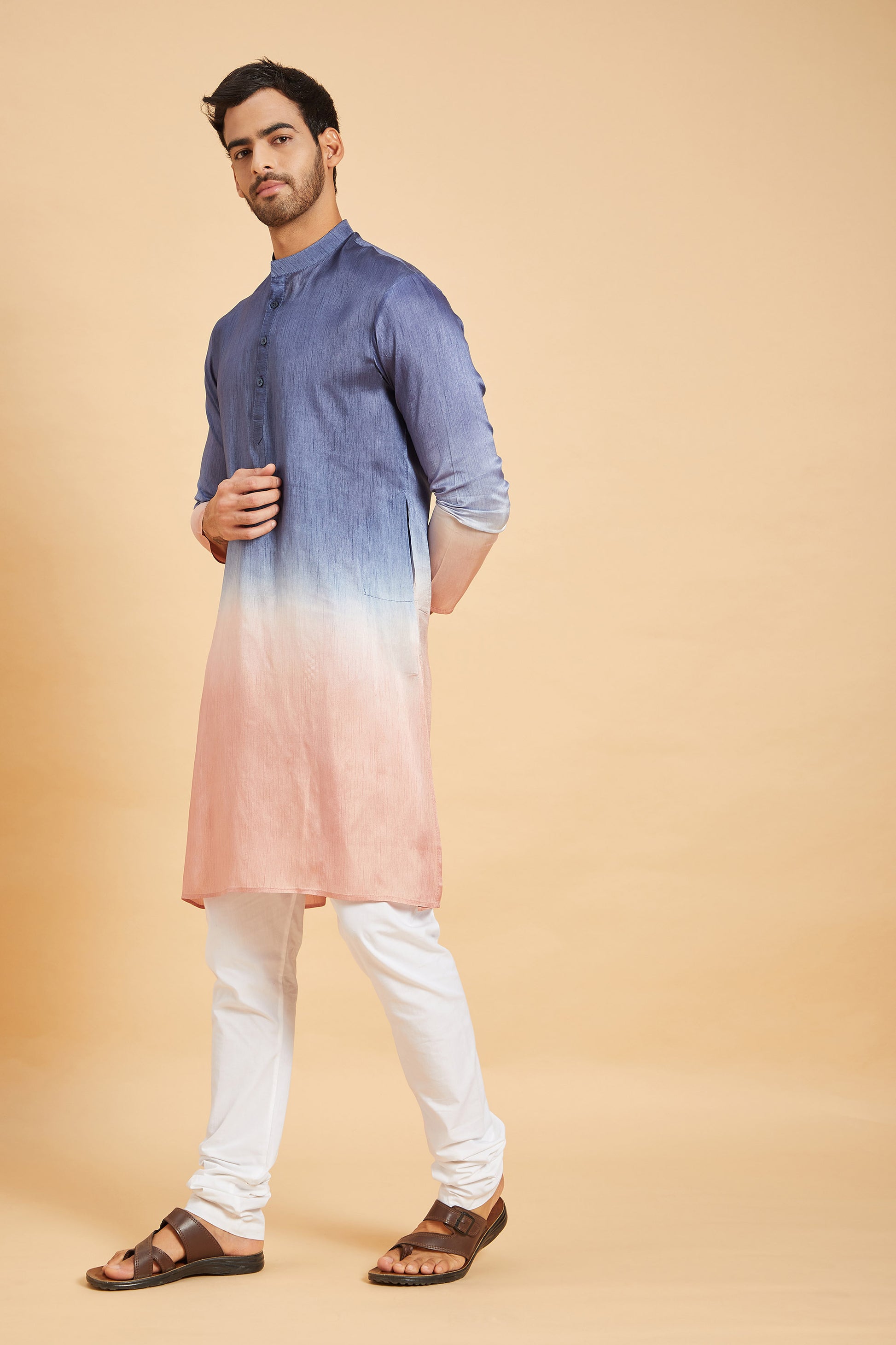 This piece is crafted from fallen raw silk and features a stunning ombre effect of light teal blue and a soft peach pastel. The color combination is pleasing to the eye and creates a sophisticated look. To complete the ensemble, pair this kurta with white or light pink pants or trousers.