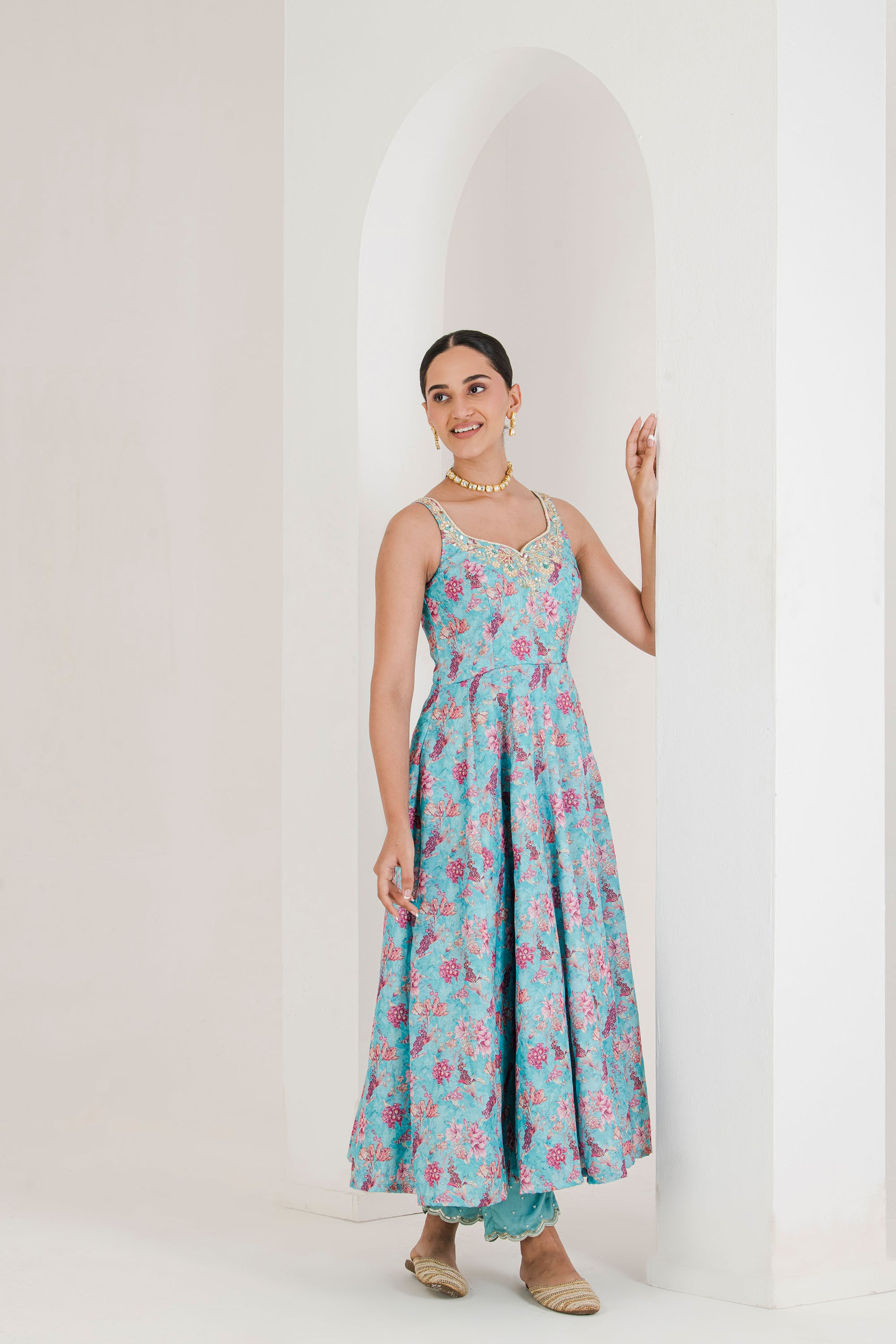 Showcase your elegance with our blue floral print anarkali set ideal for engagements and sangeets.