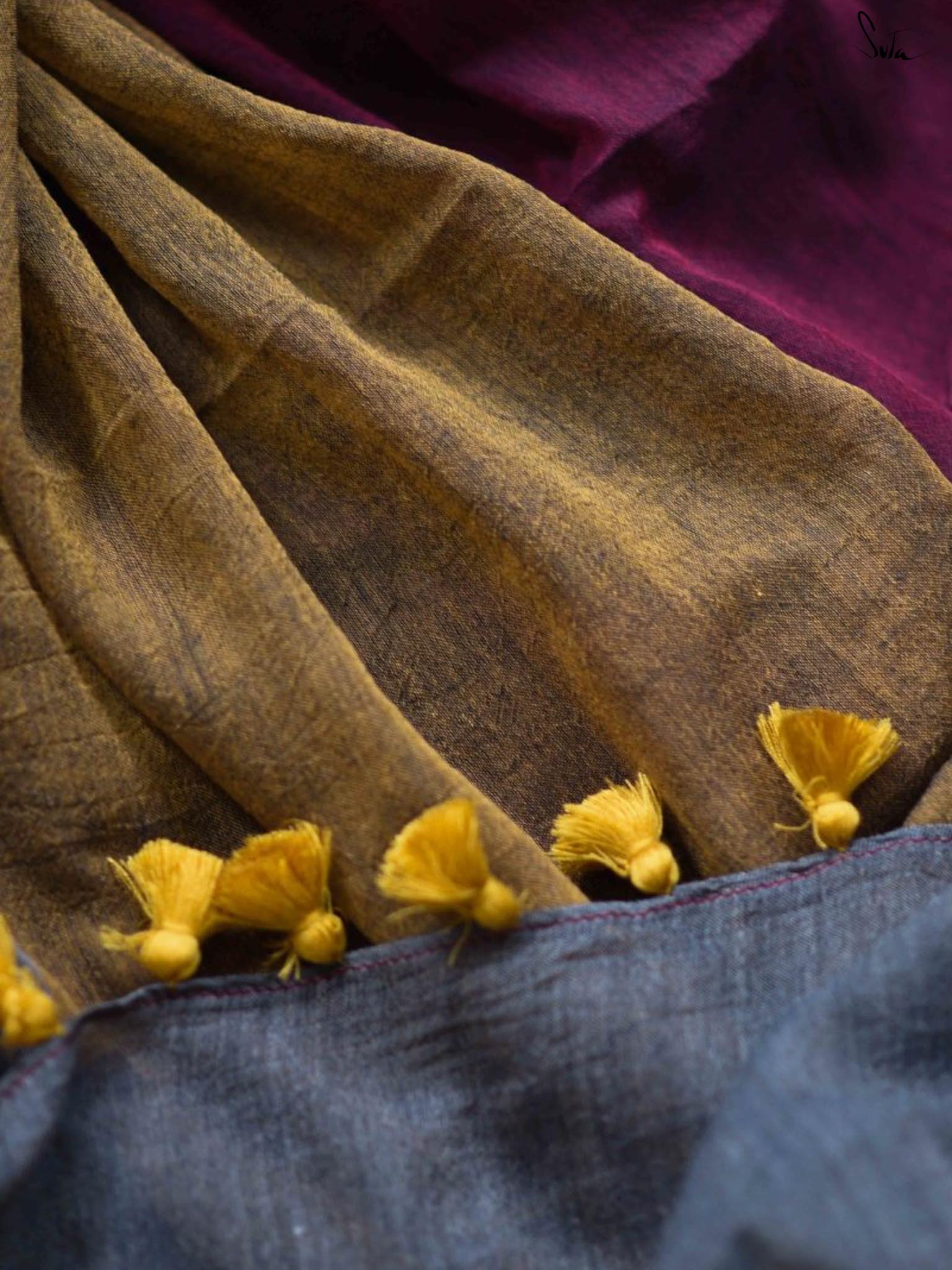 This uniquely beautiful grey, mustard and maroon made in heaven mul saree is truly a sight to behold!