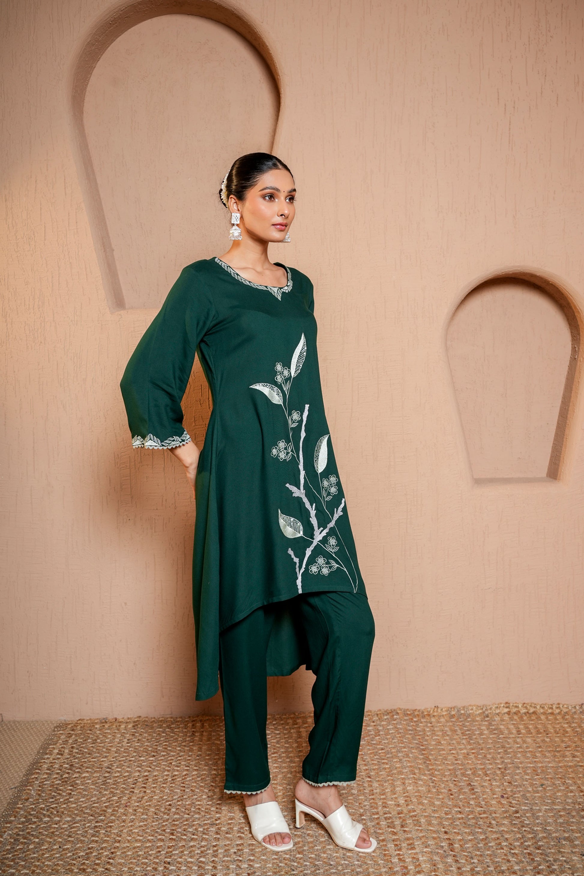 Bottle Green Rayon C-cut Kurta Pant With Machine Embroidery