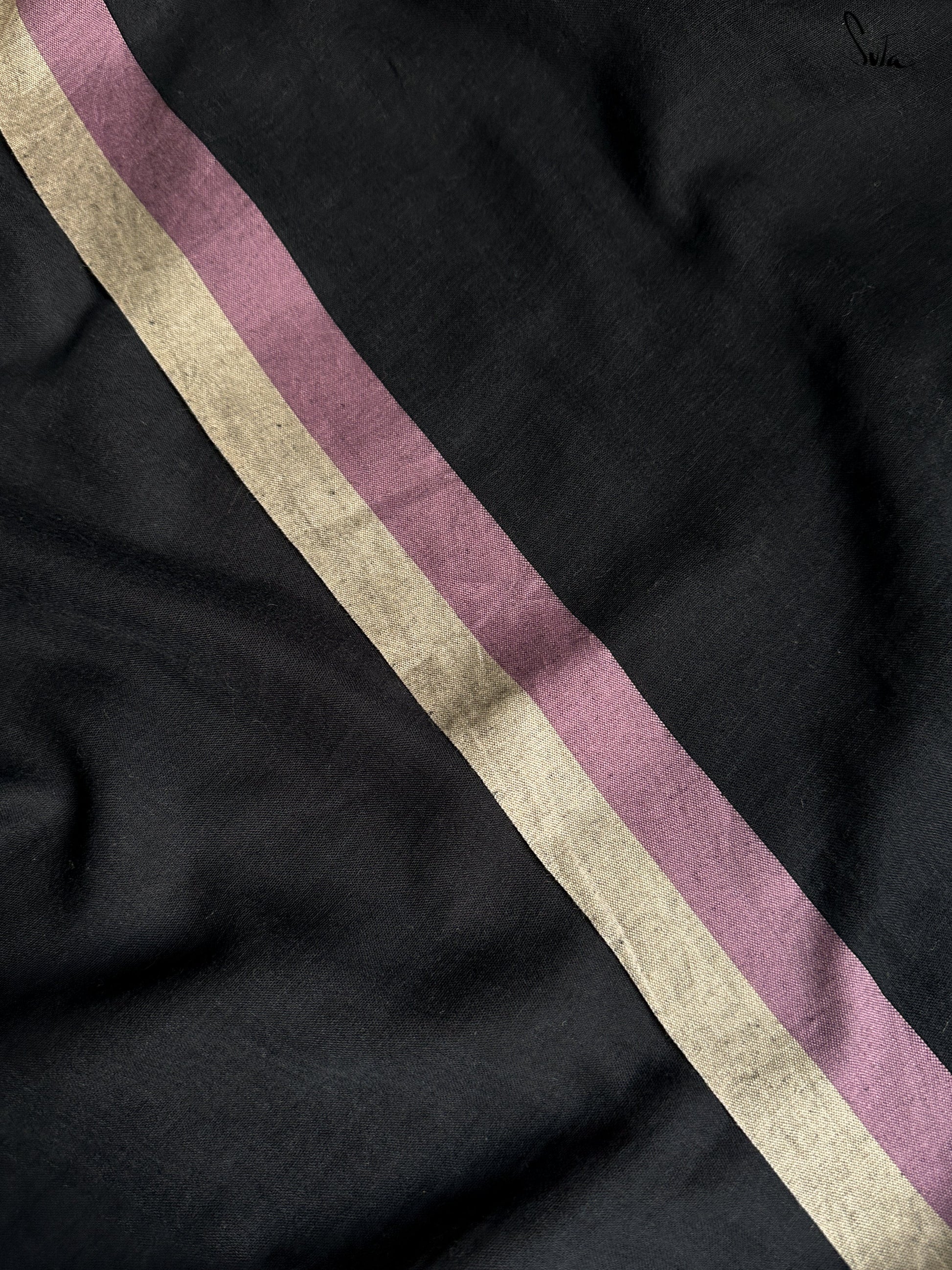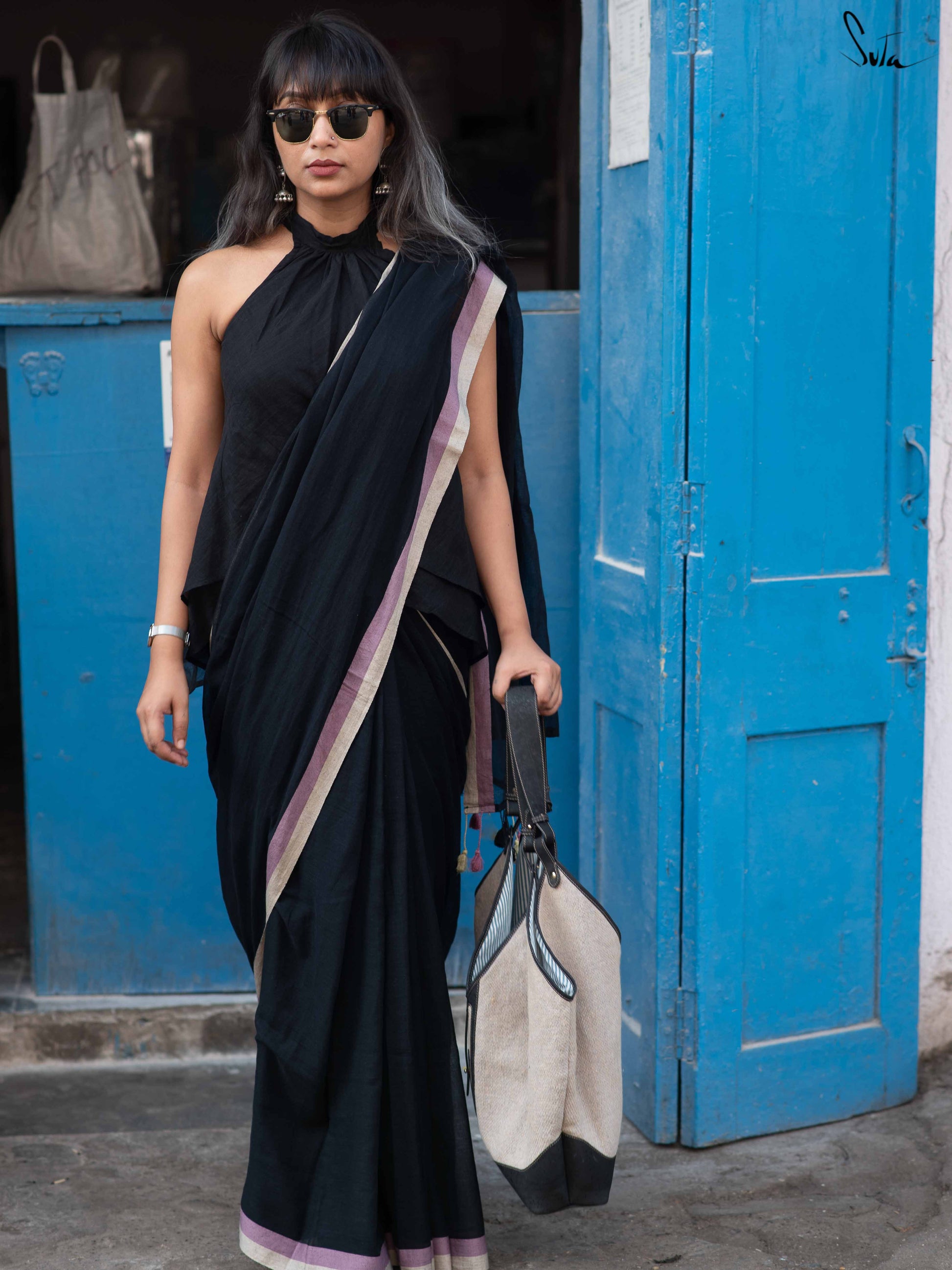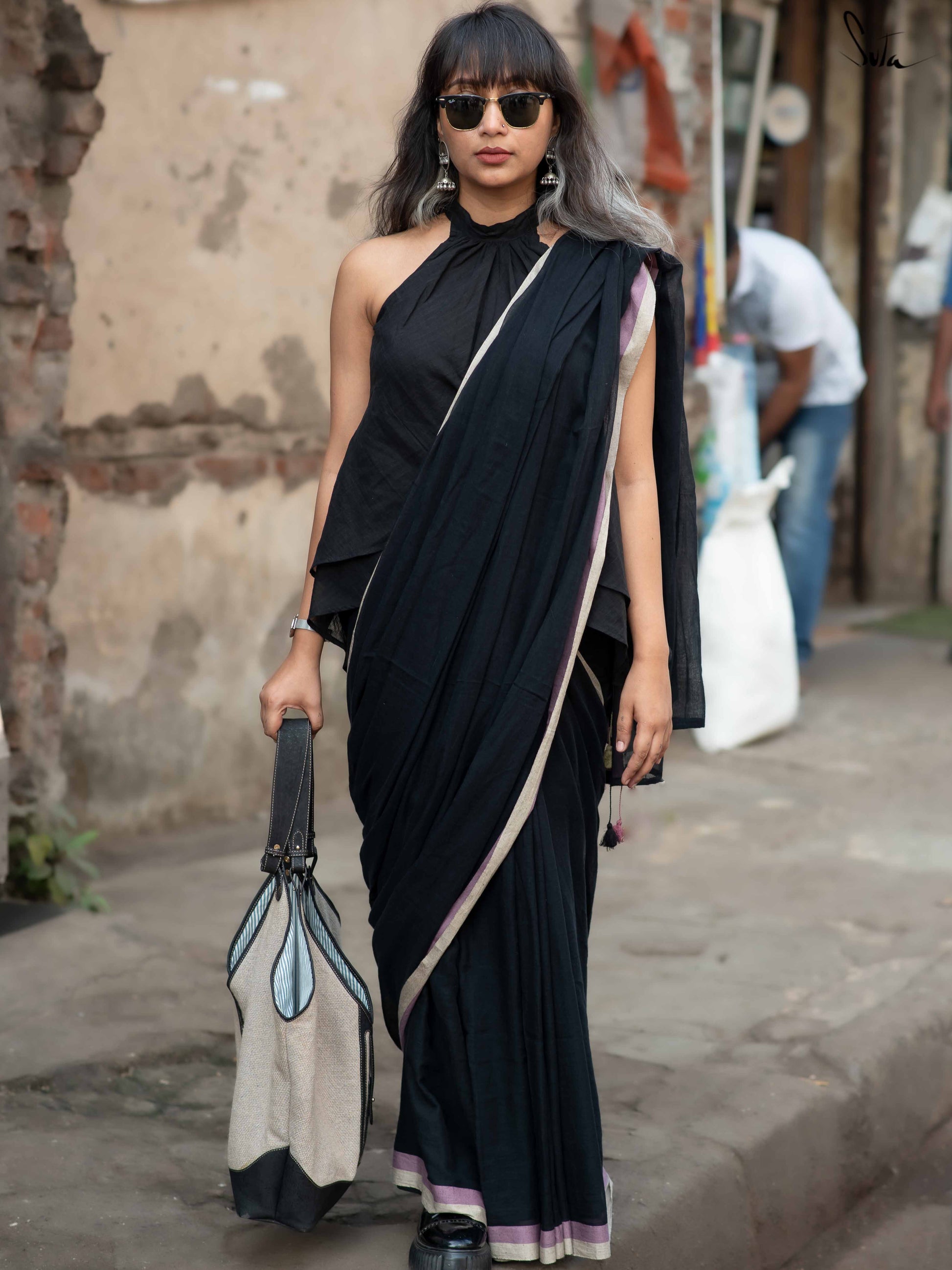 Look bold and beautiful in our classic black mul cotton saree with a thin beige and lavender border.