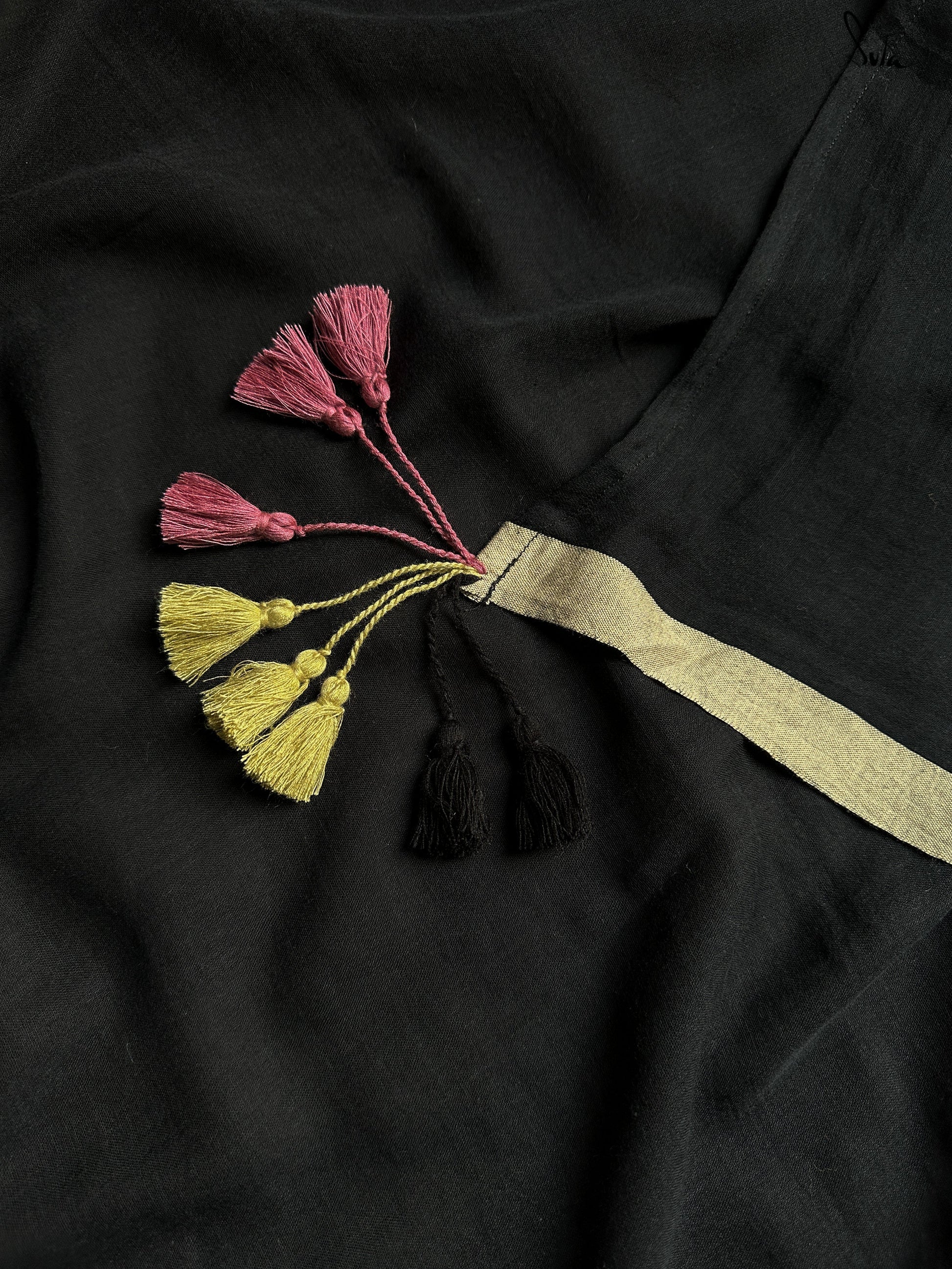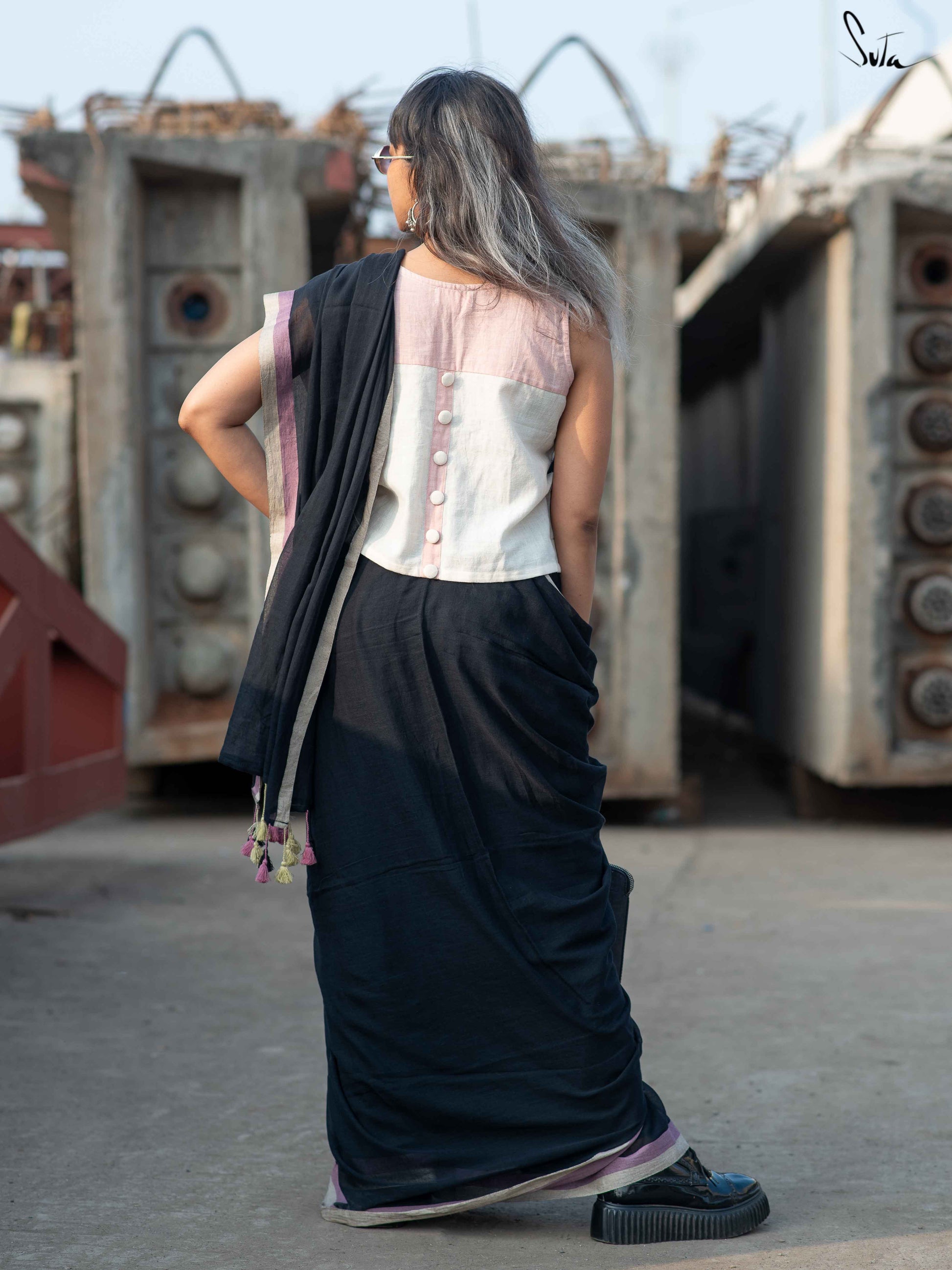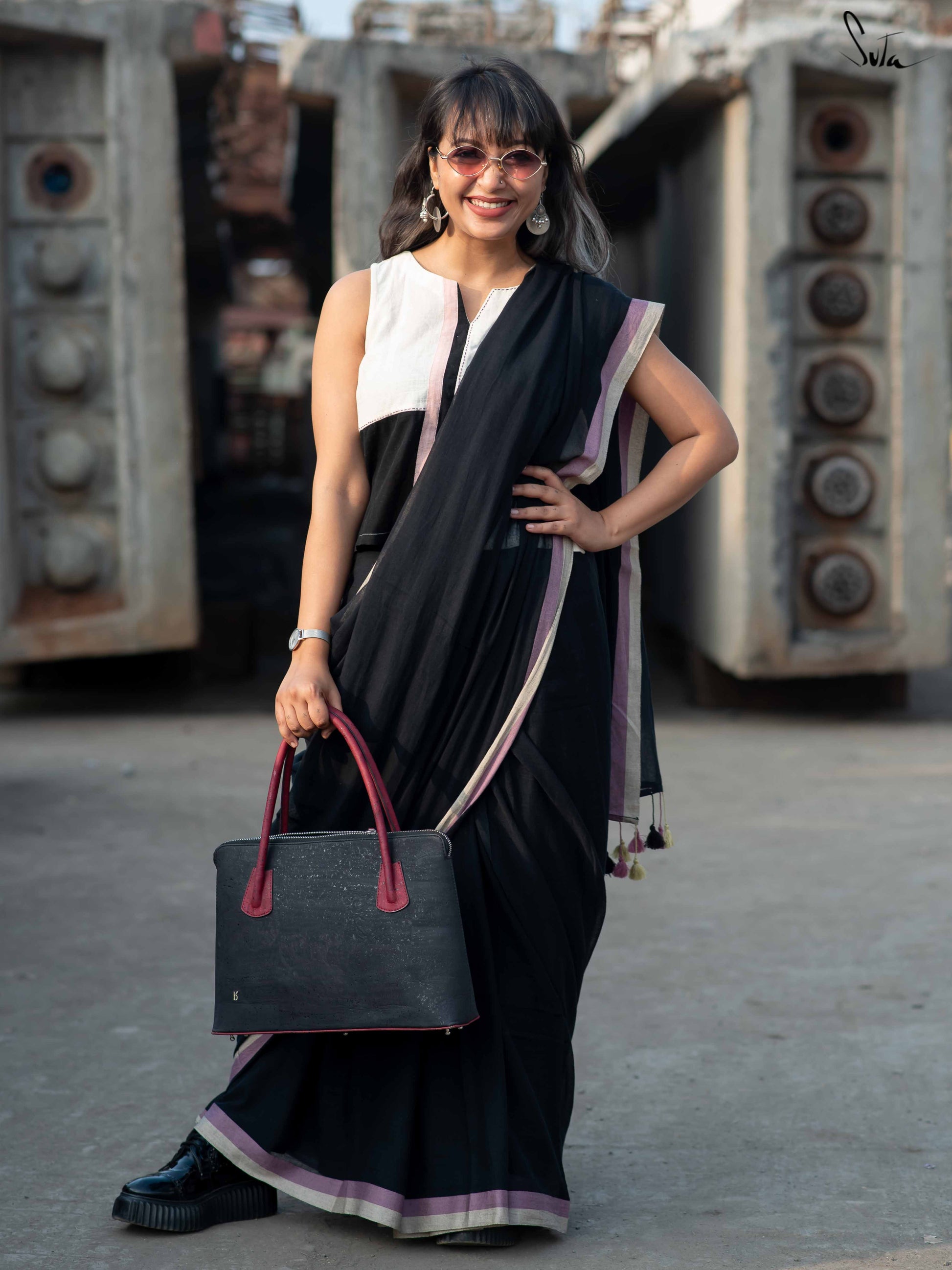 Look bold and beautiful in our classic black mul cotton saree with a thin beige and lavender border.