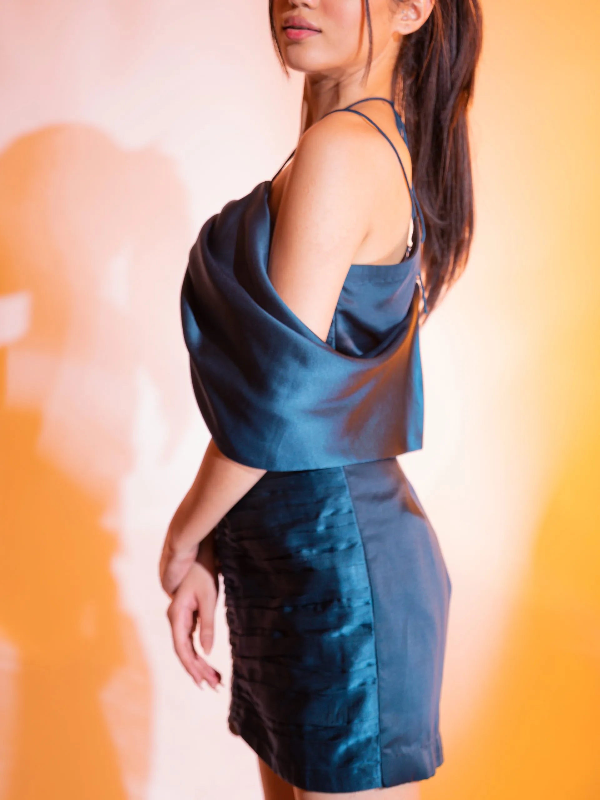 DETAIL- Satin ruched short dress with a draped bow to be worn upon shoulders. Padded and back zip