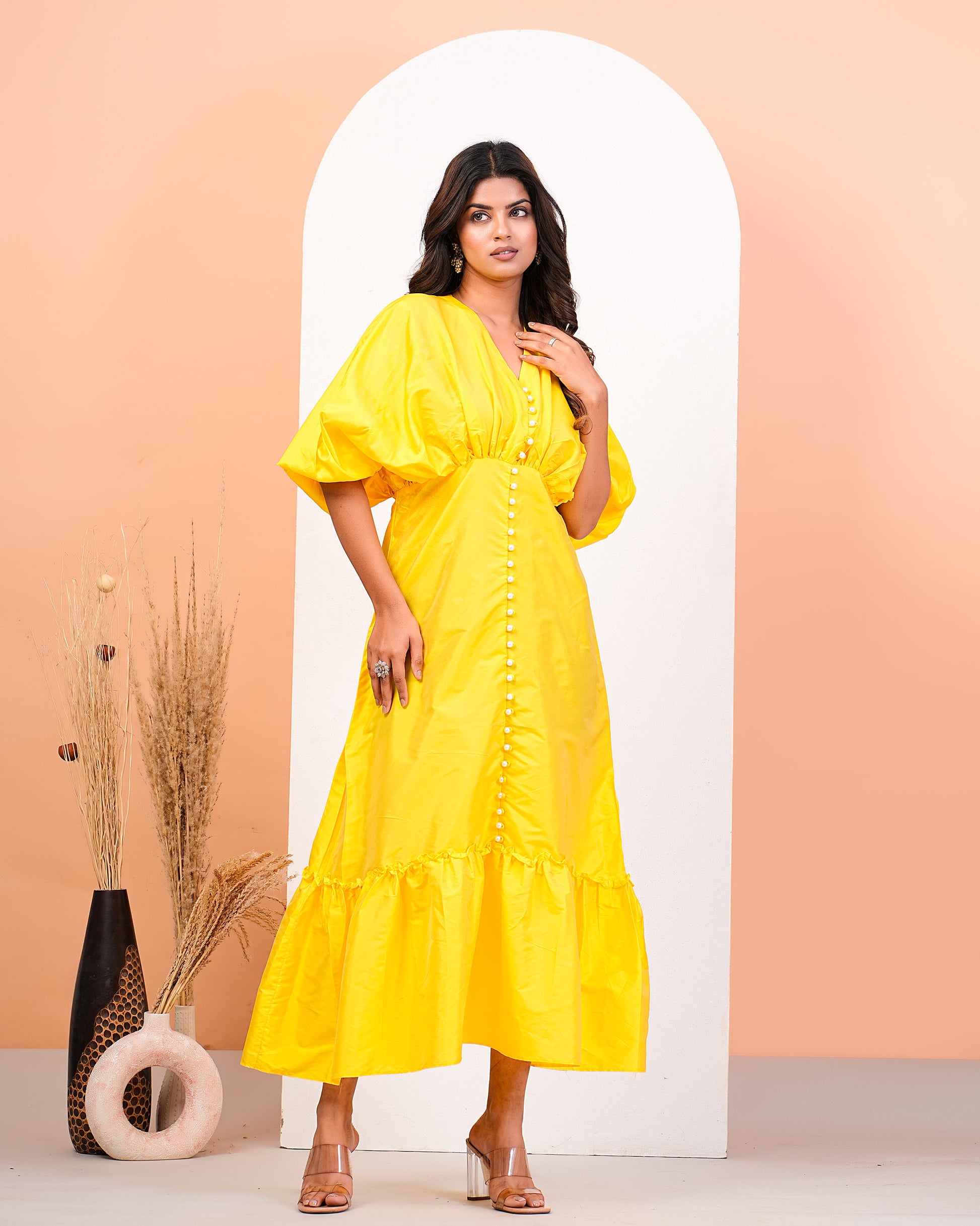 Bright Yellow Gathered Calf Length Dress With Pearl Buttons