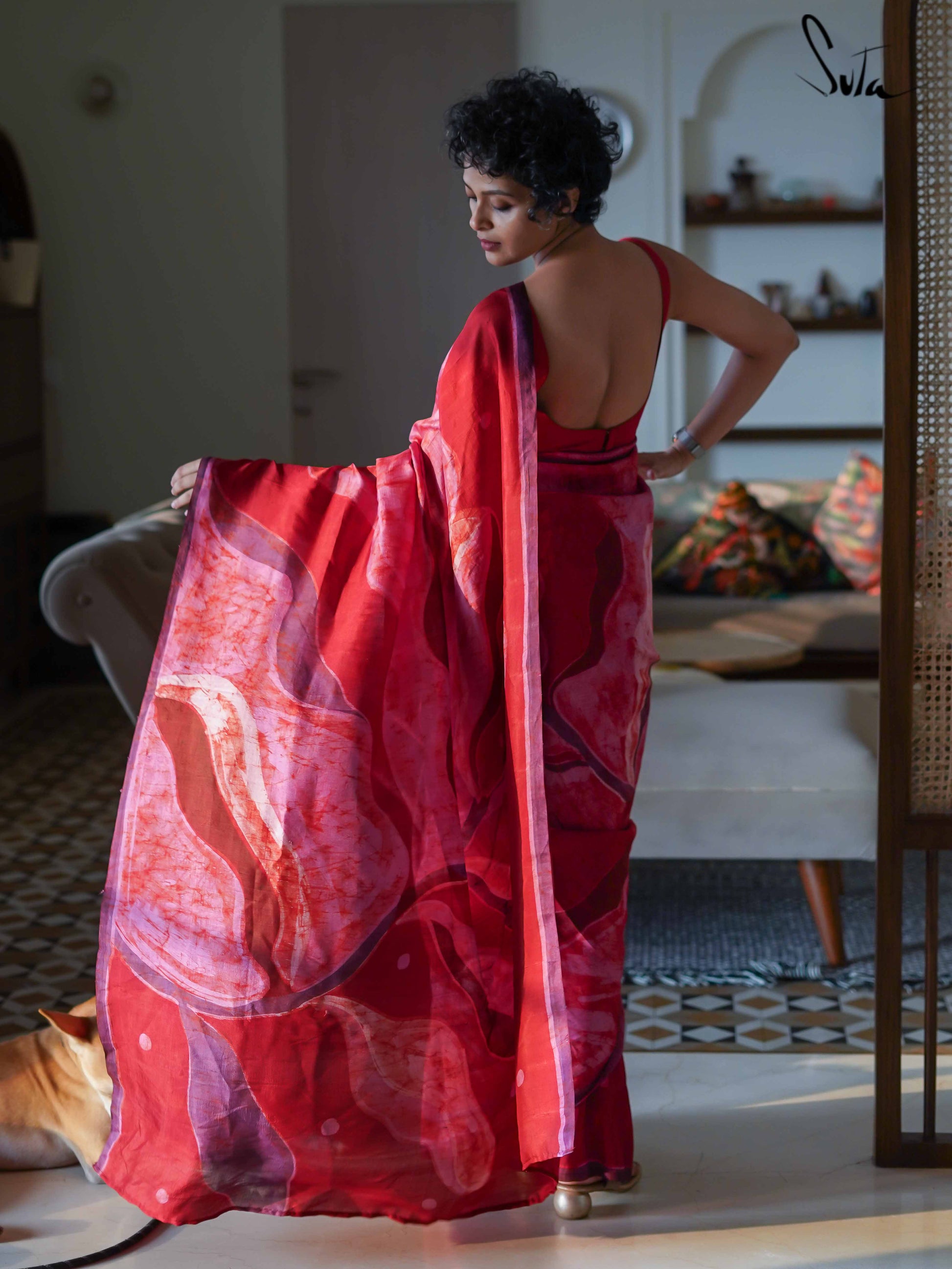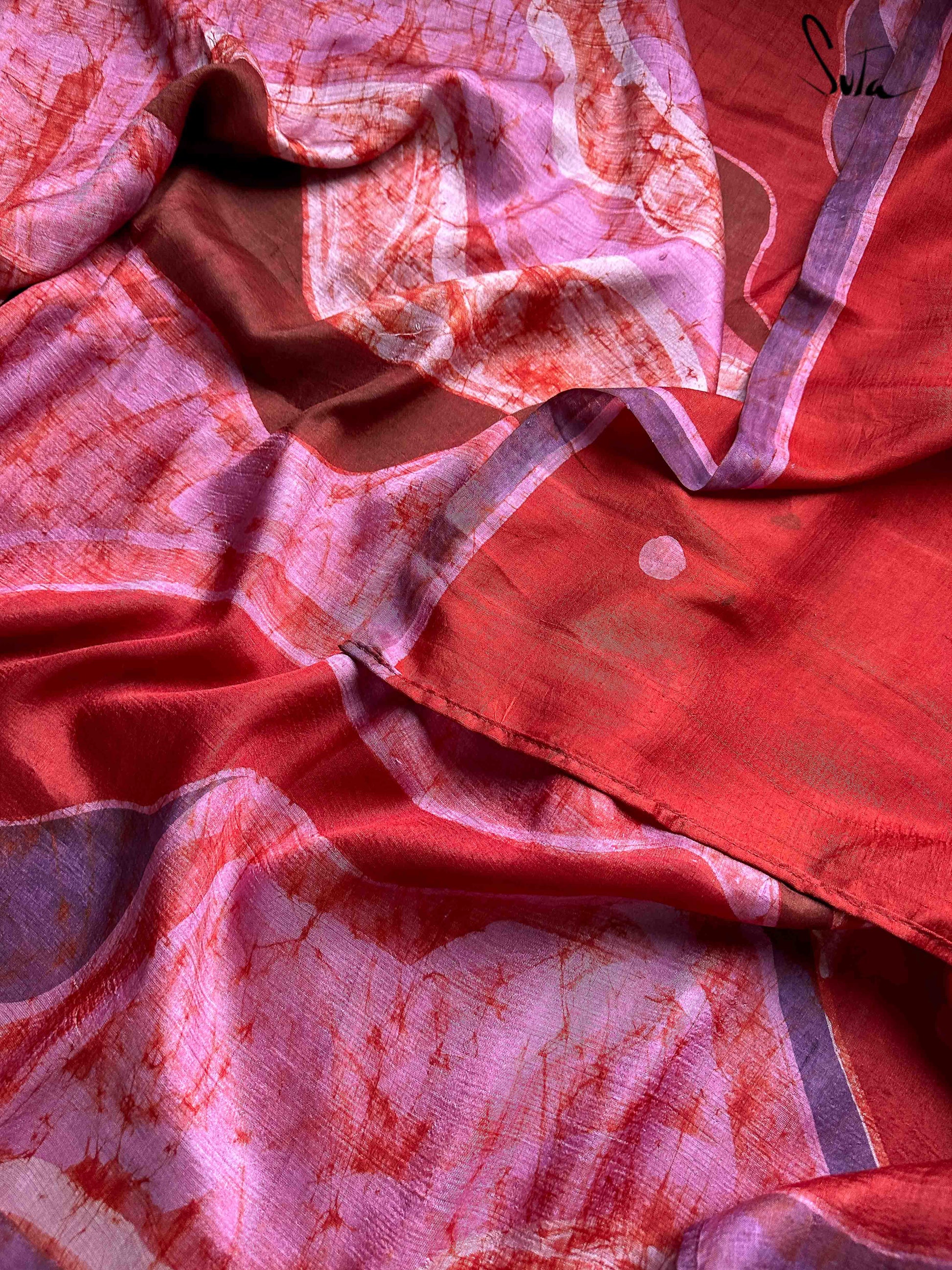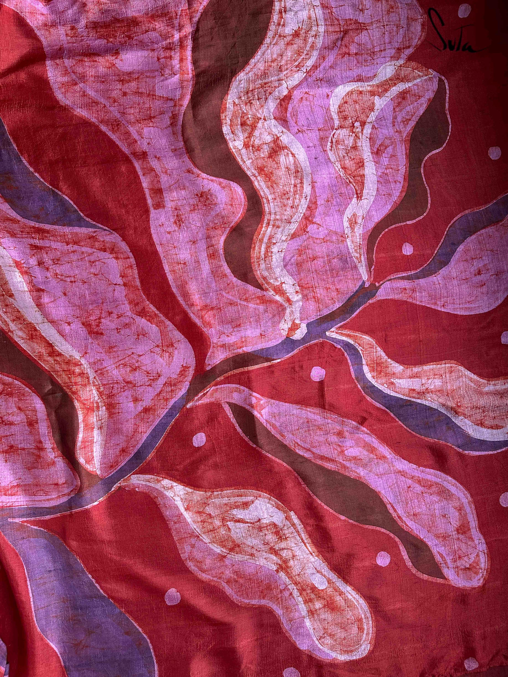This is a handcrafted, handloom mulberry silk saree in gorgeous pink and red hues, with exquisite batik work.