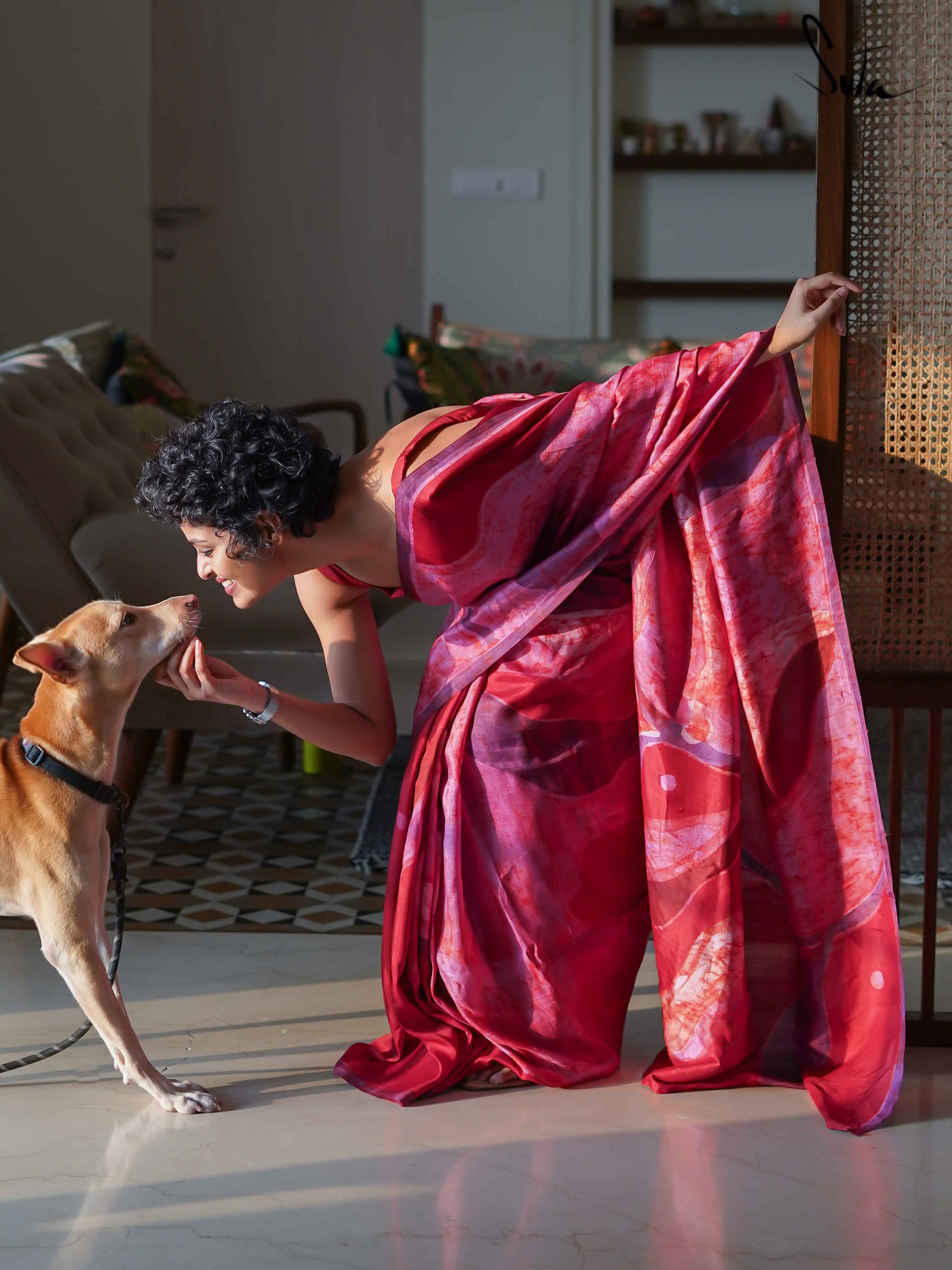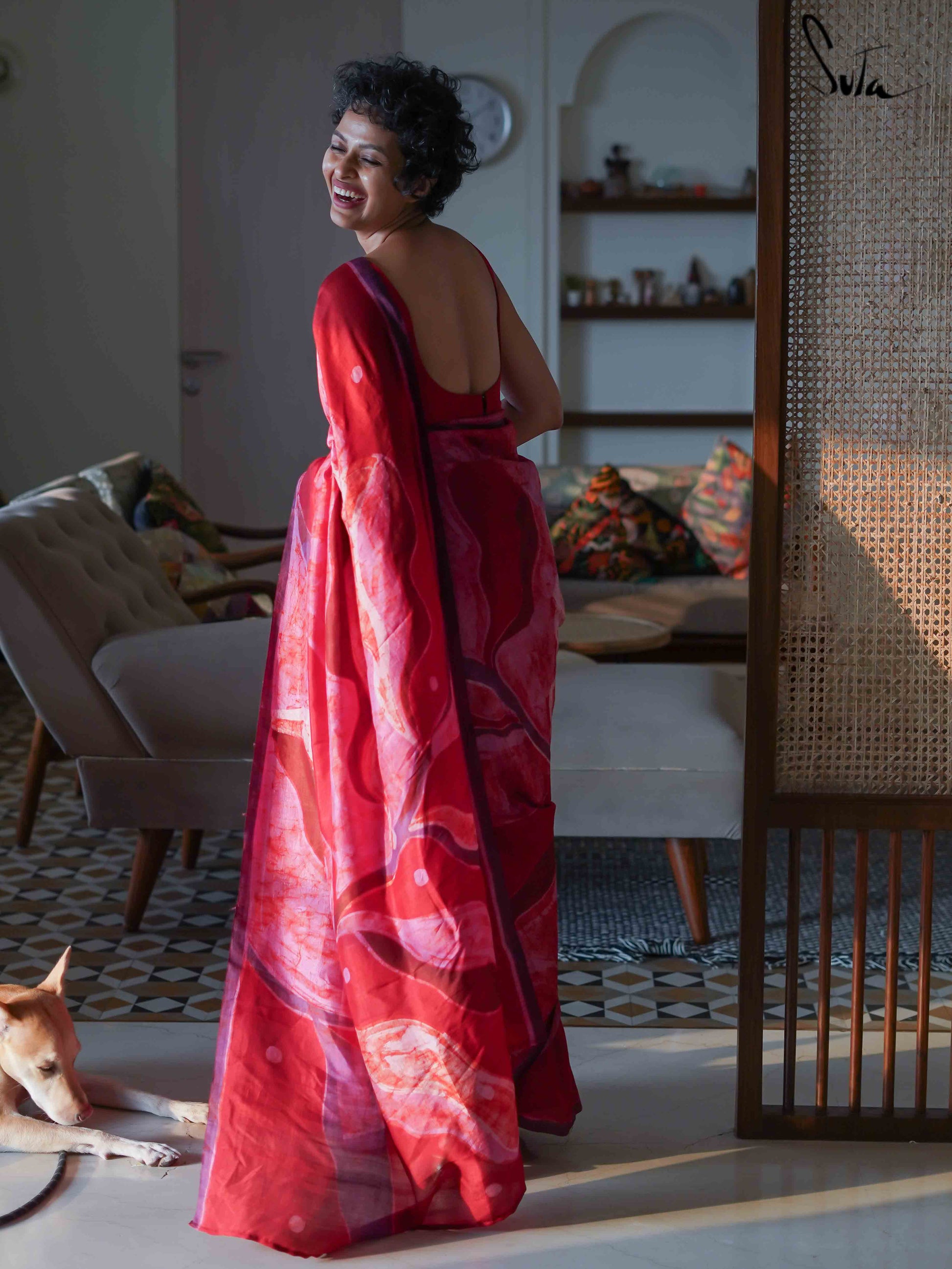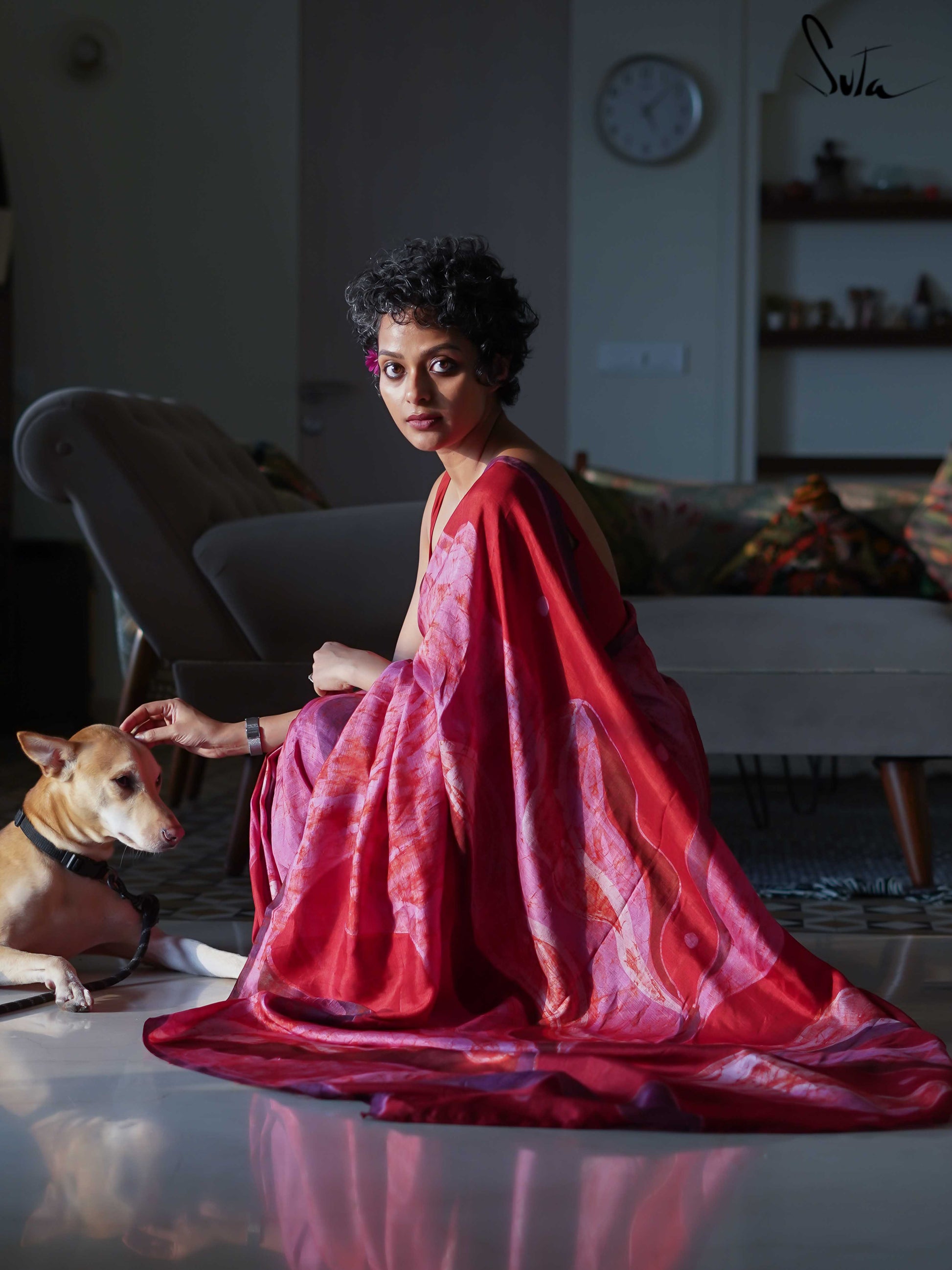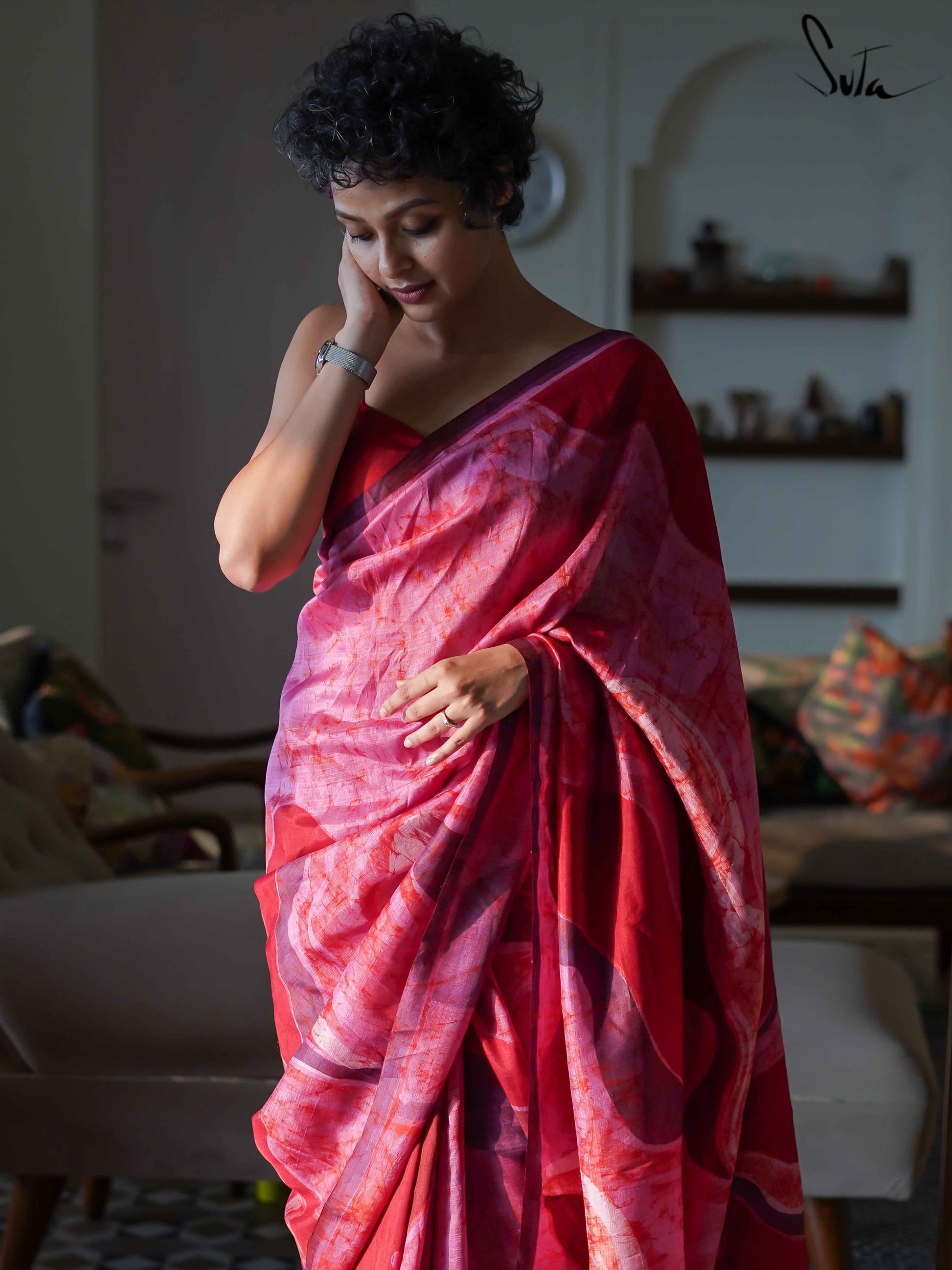 This is a handcrafted, handloom mulberry silk saree in gorgeous pink and red hues, with exquisite batik work.
