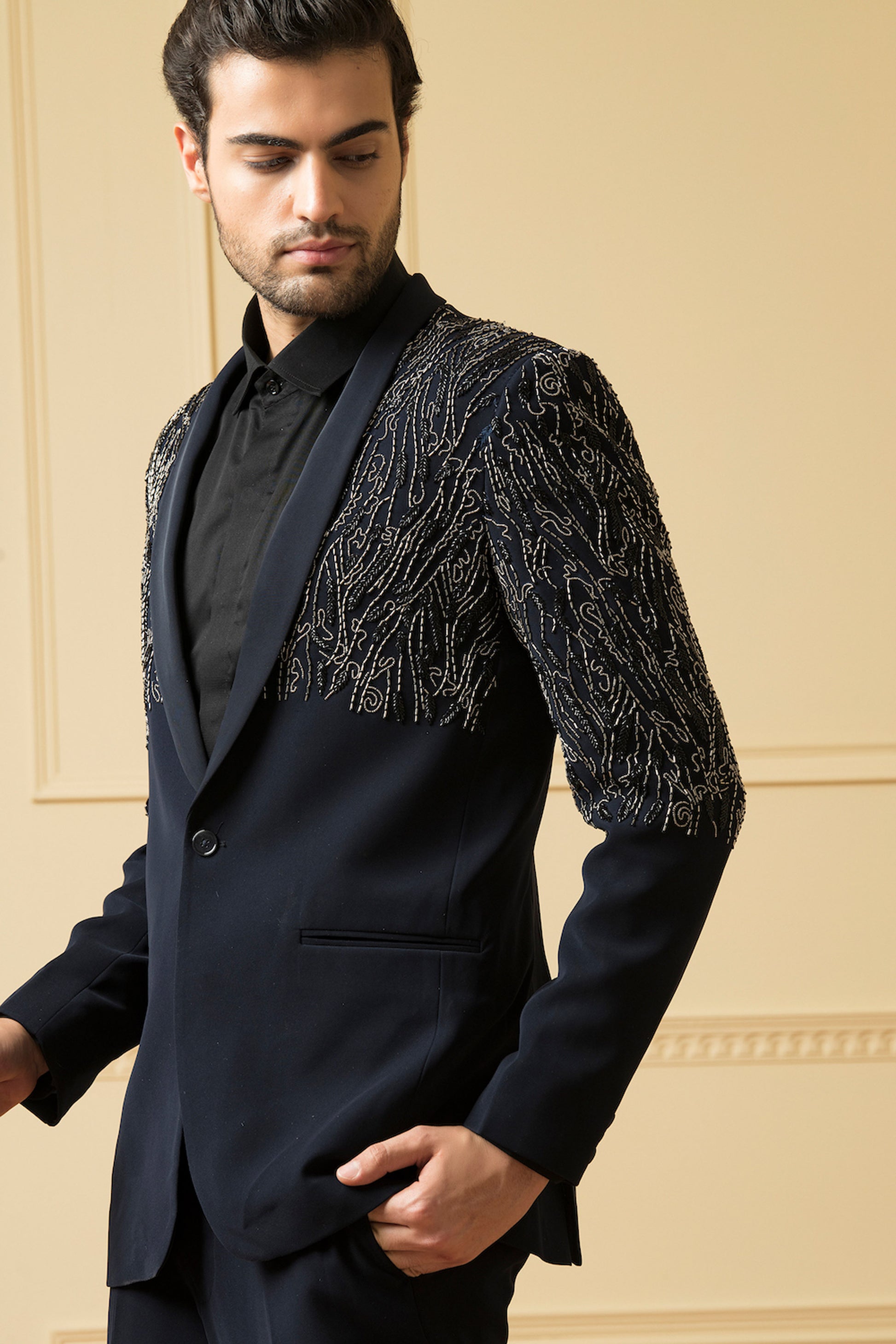 Brillante Black Matte Finish Hand Embroidered Wedding Blazer