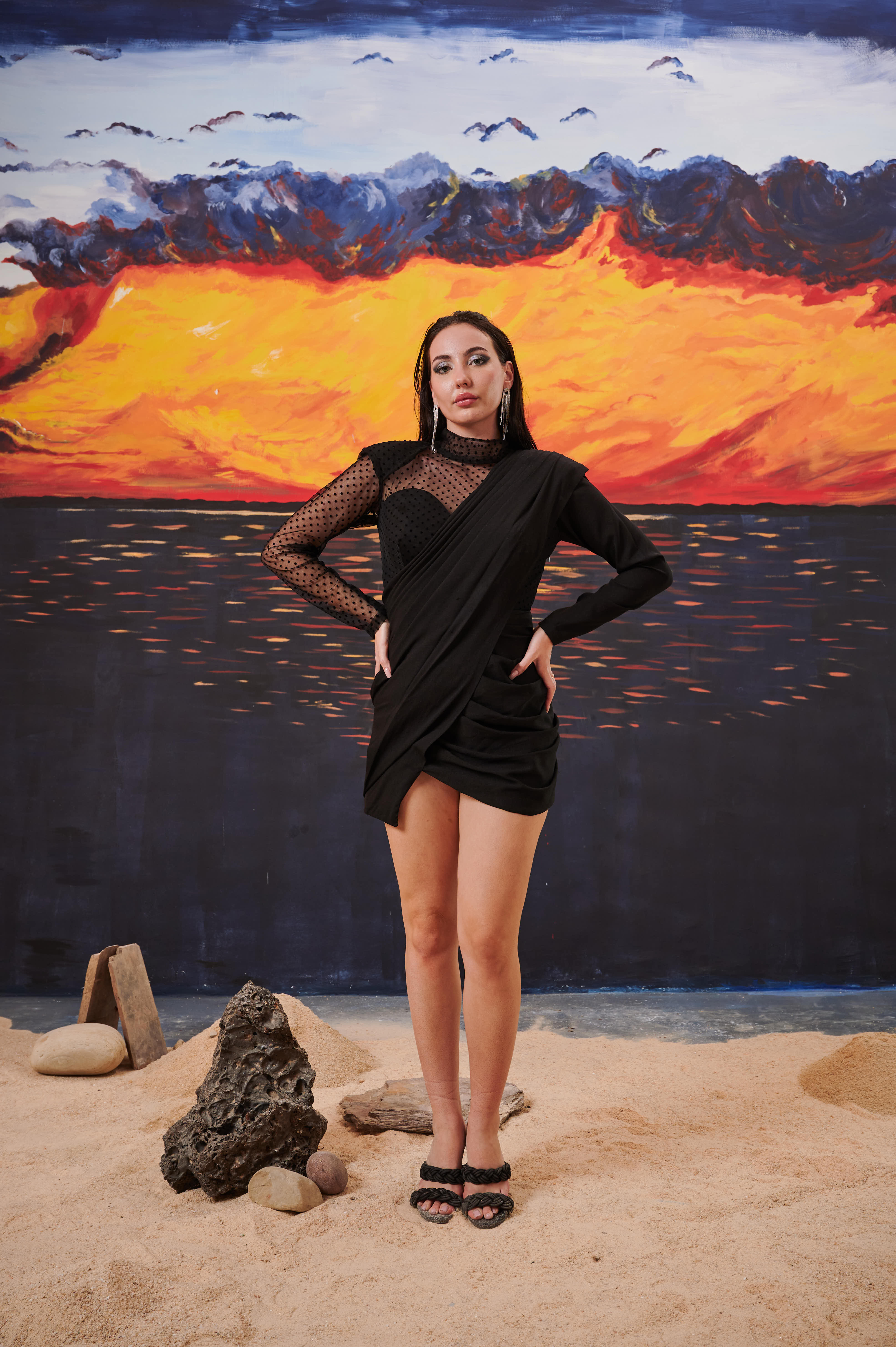 DETAILS- High neck fitted short dress with shoulder pad detailing and criss cross drape on front, along with plain back. Padded and side zip.