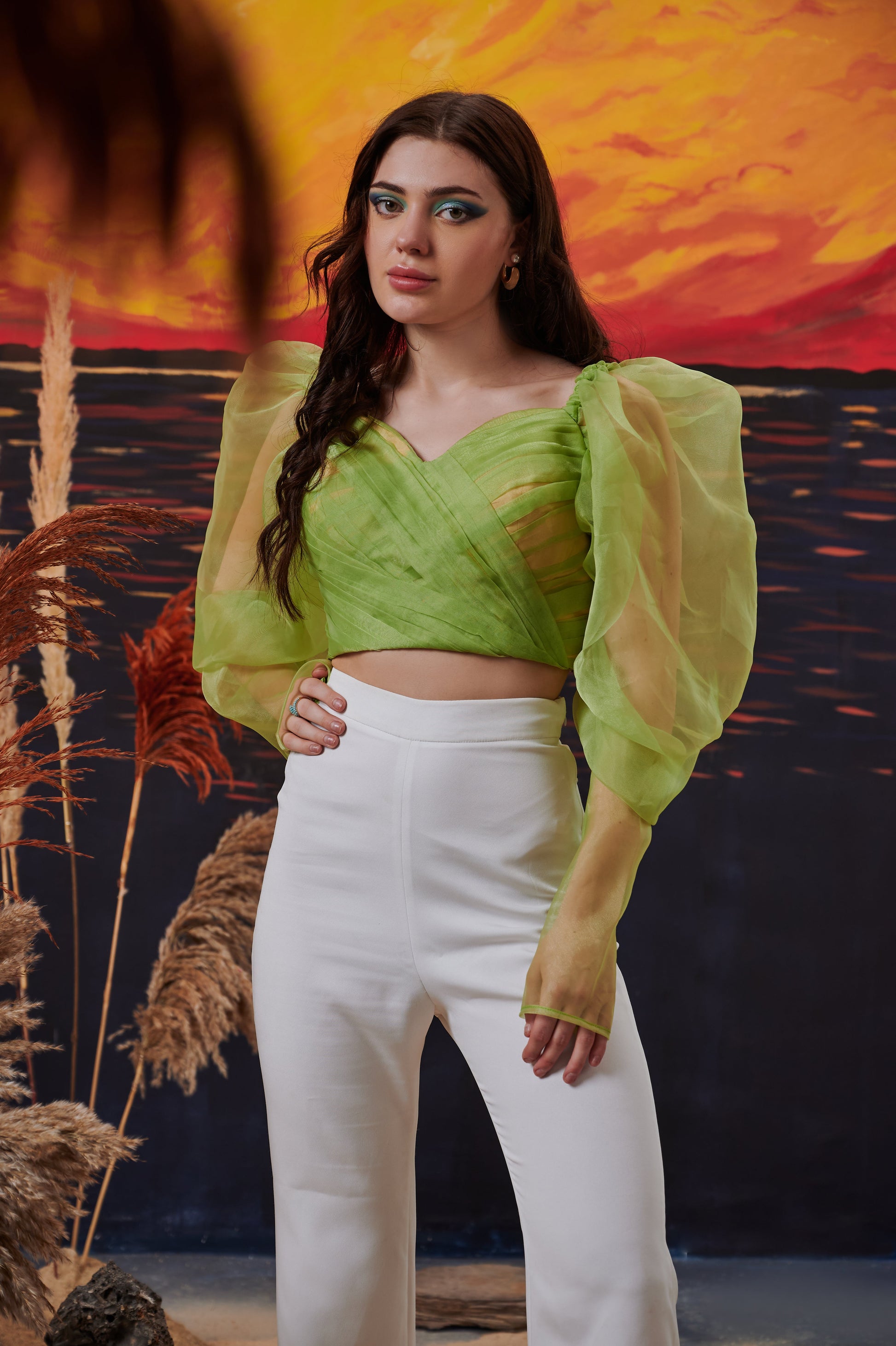 DETAILS- sweetheart neckline pleated crop top with flounce and fitted sleeves. Padded and side zip.