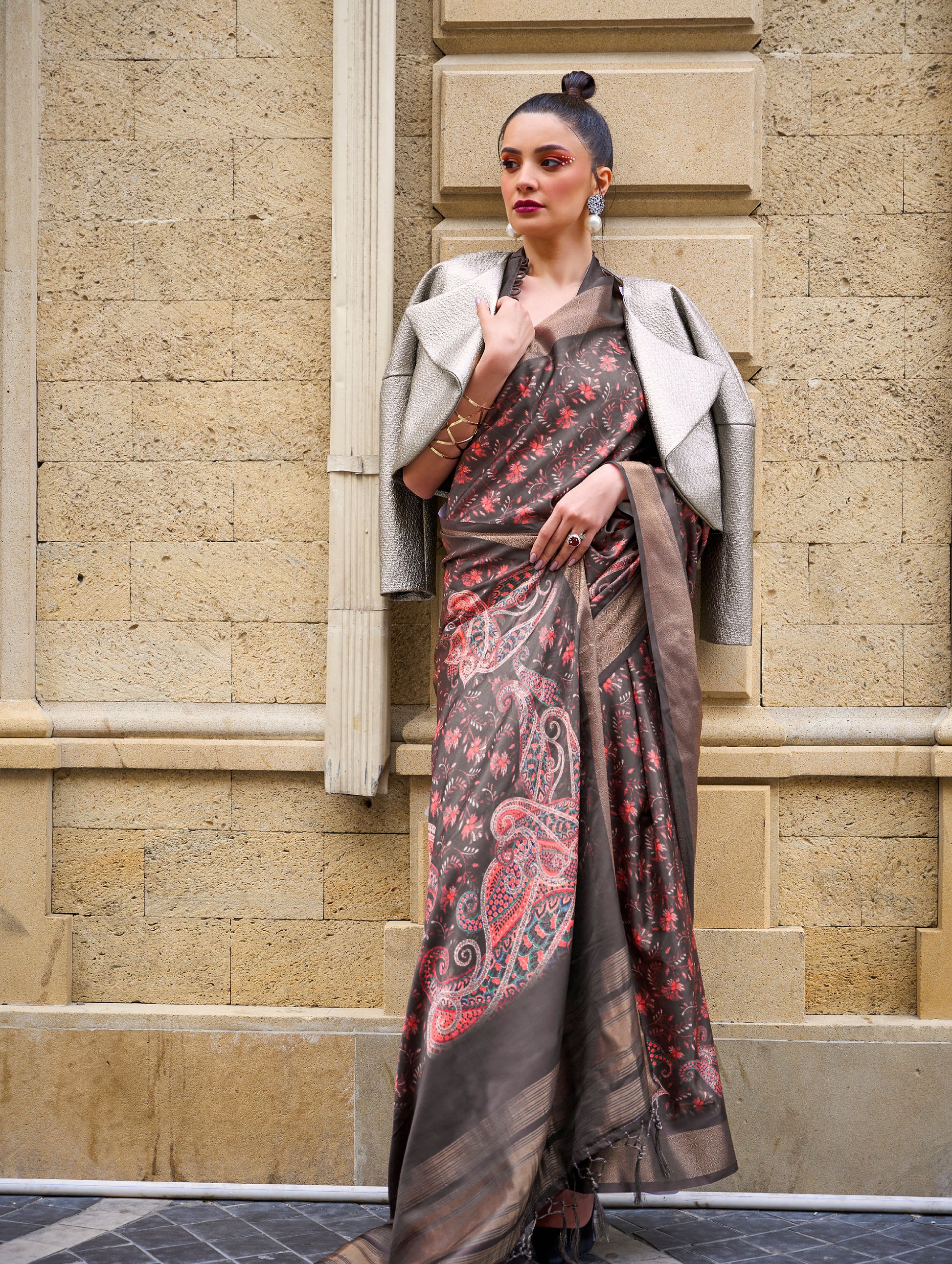 Brown FLoral Kopper Pure Gaji Silk Handloom Saree