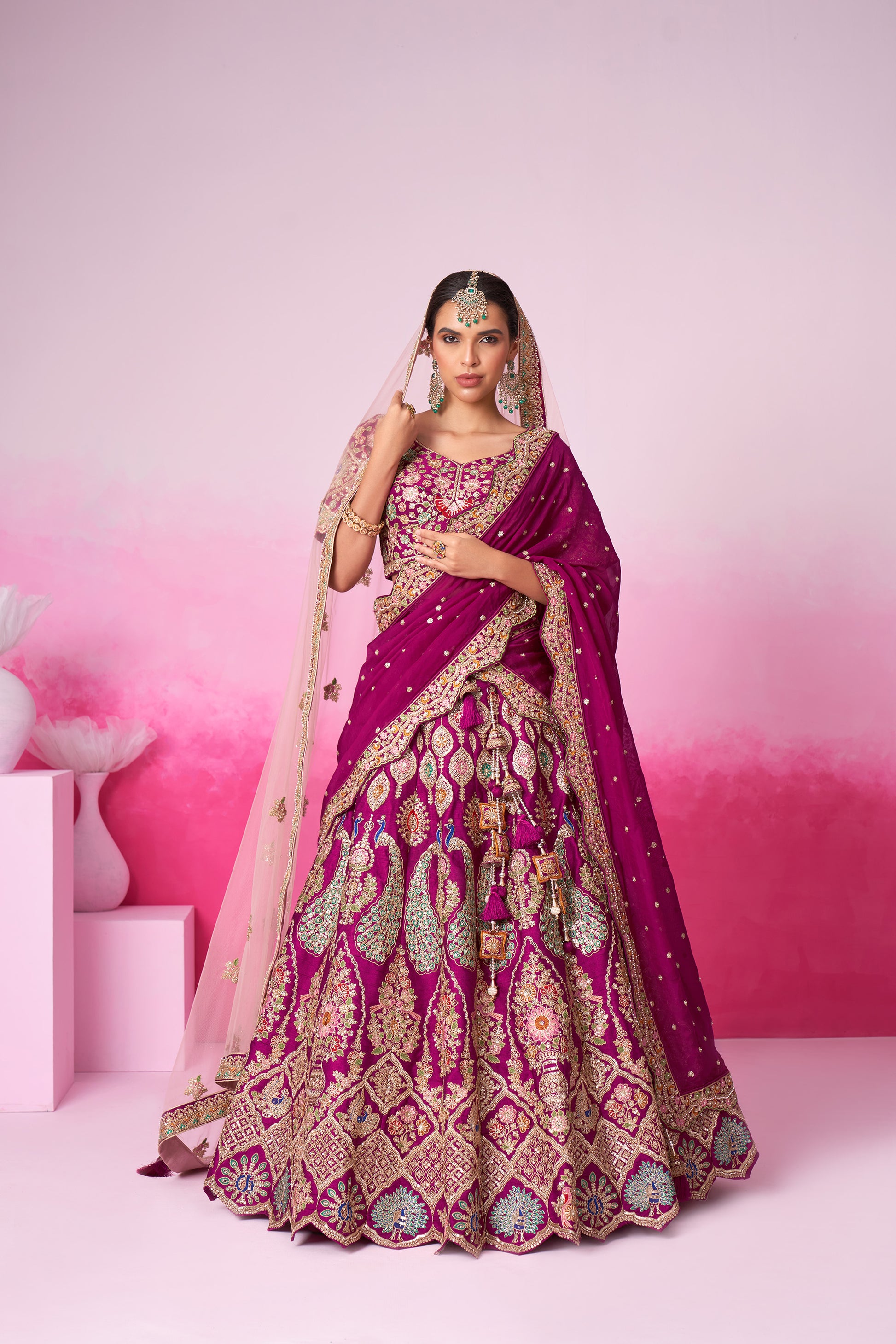 Burgundy Pure silk Moti, Sequins embroidery Bridal Lehenga choli