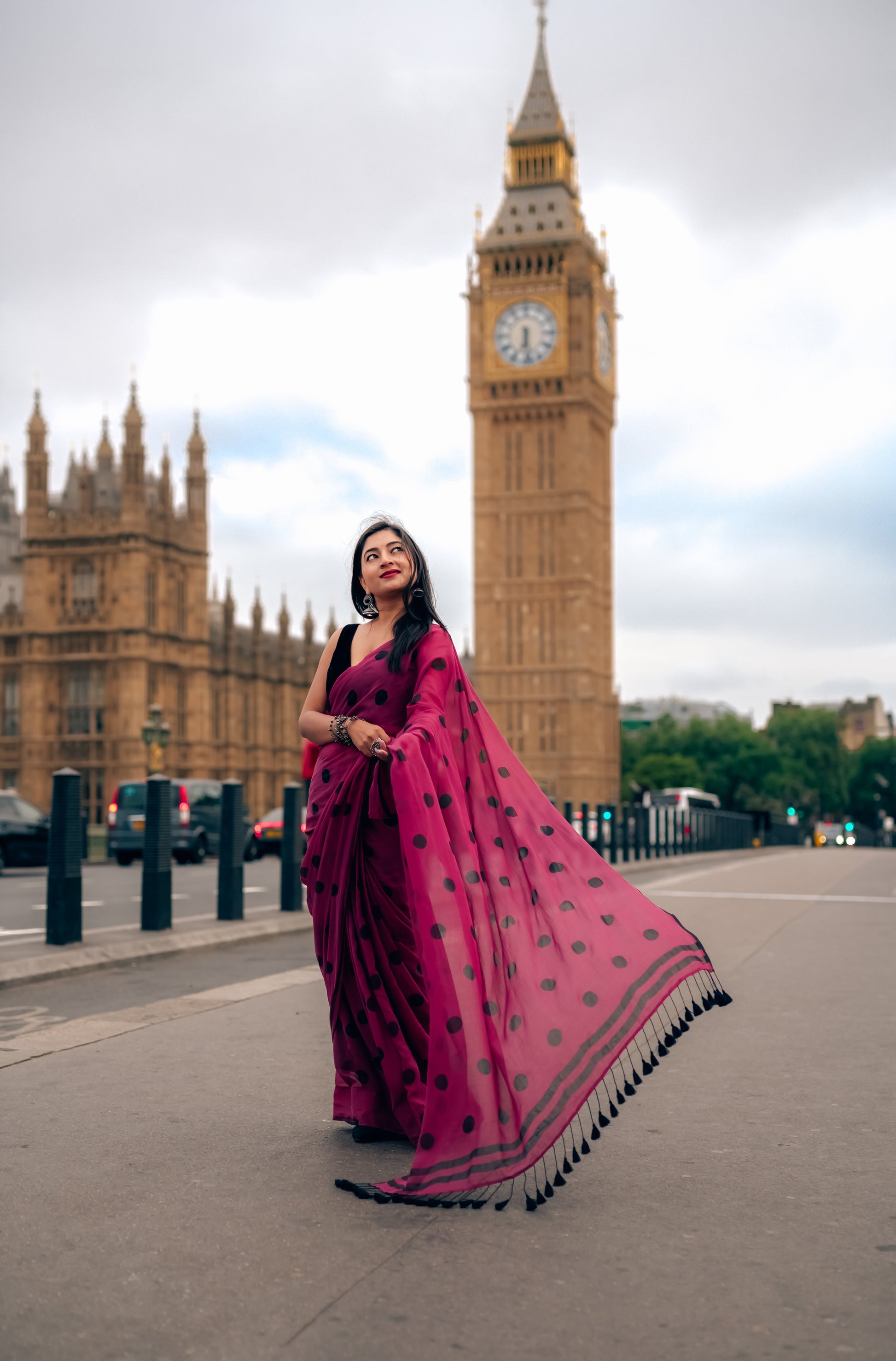 This gorgeous pink saree in made-in-heaven mul with screenprinted polka dots is simplicity stealing the show!