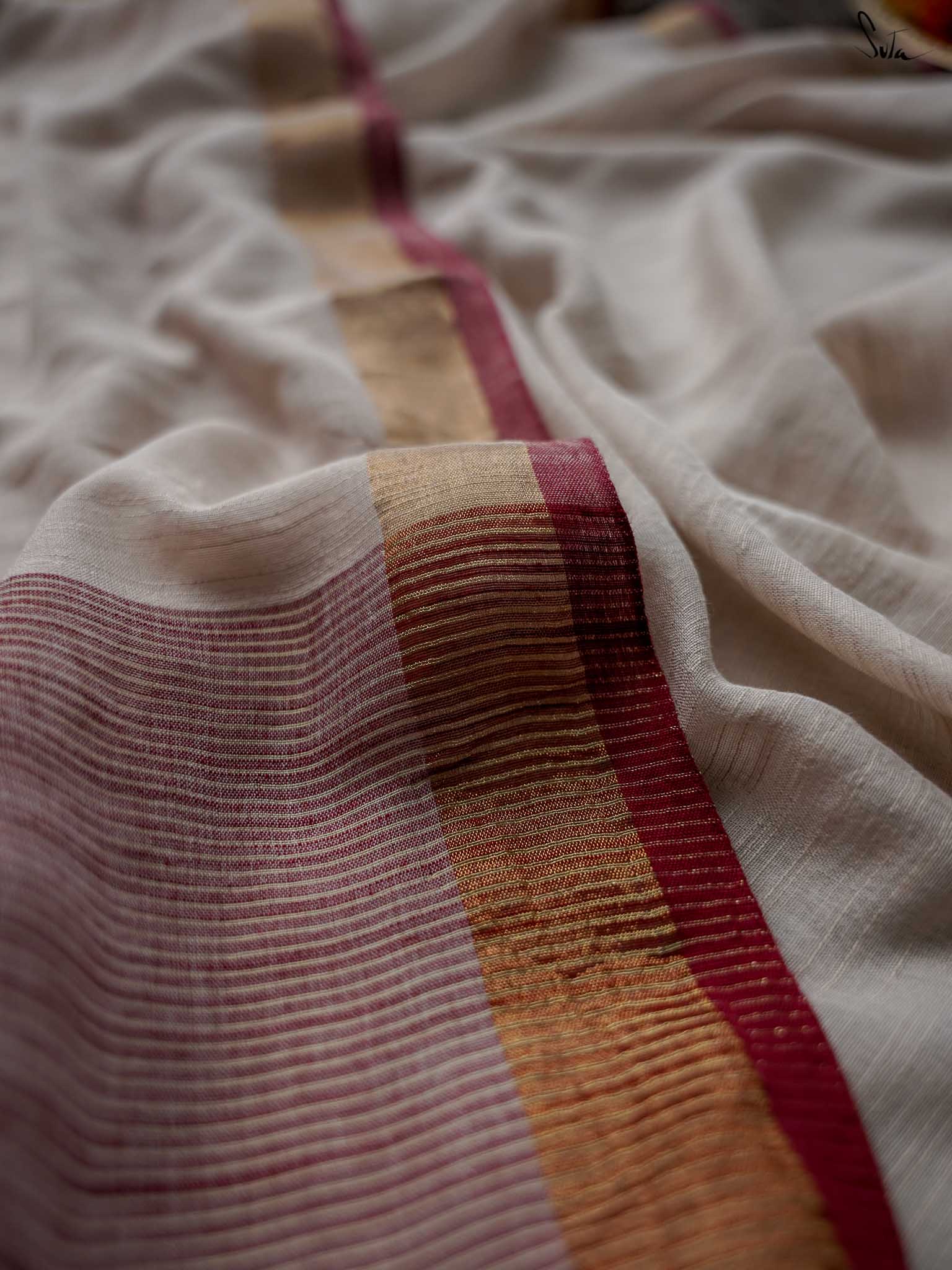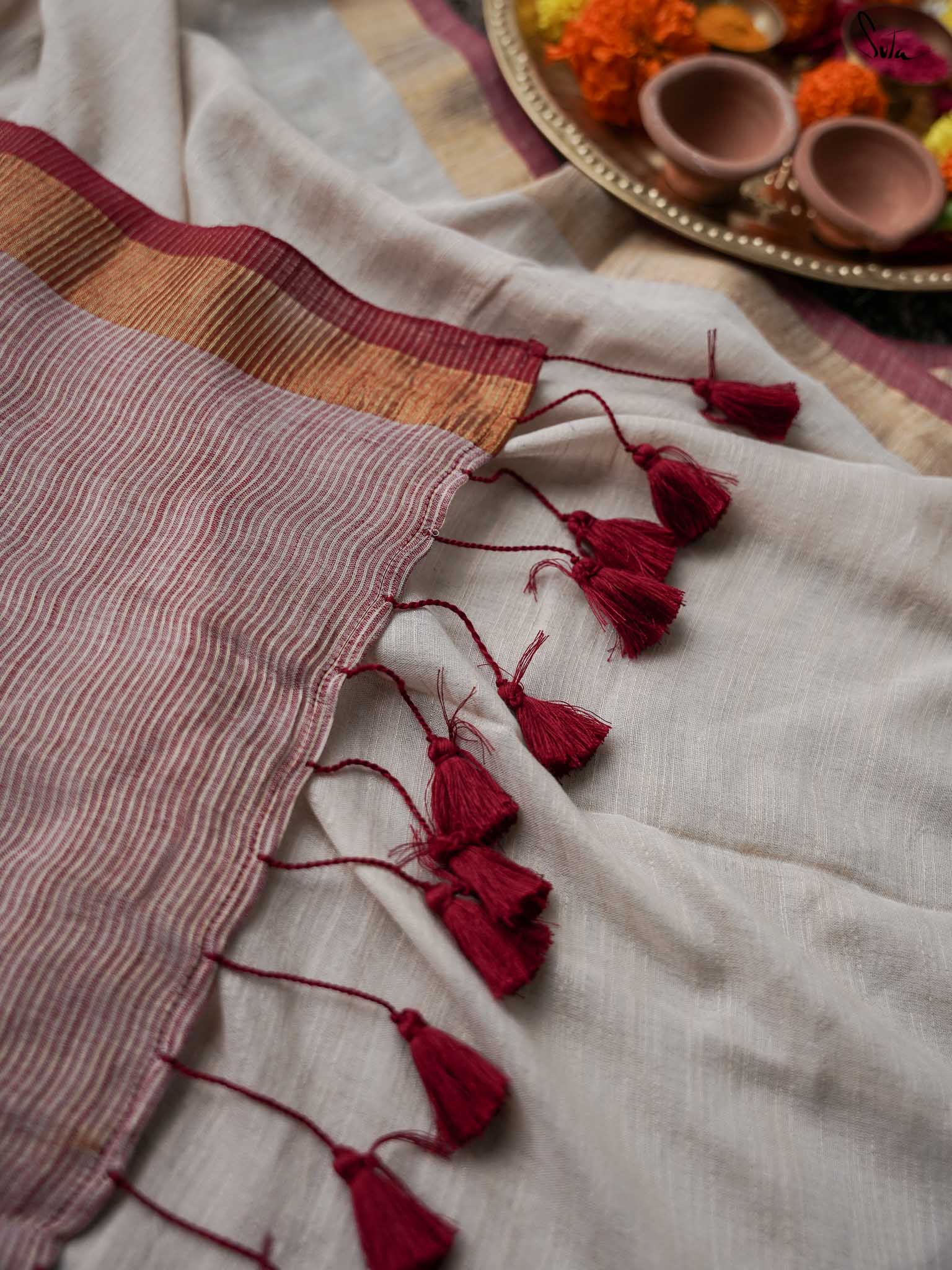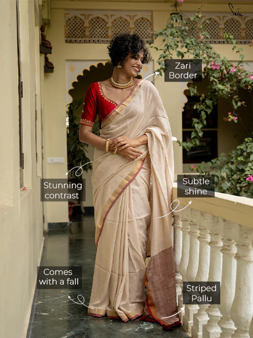 Let the moon witness you style the beautiful Chaand ne Kaha saree in rich off-white, crafted from luxurious cotton slub fabric. Perfect for every special occasion, the saree features a contrasting gold zari border and a pale maroon pallu with zari stripes.
