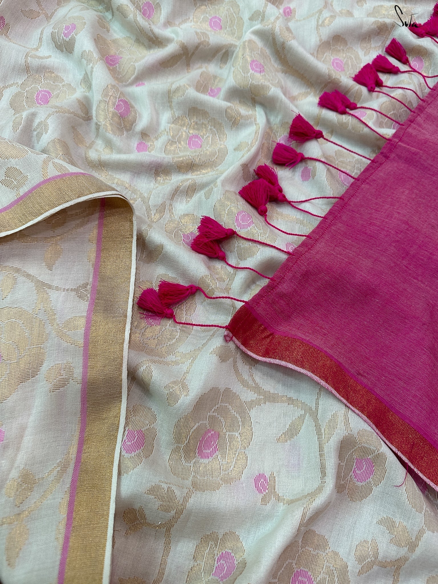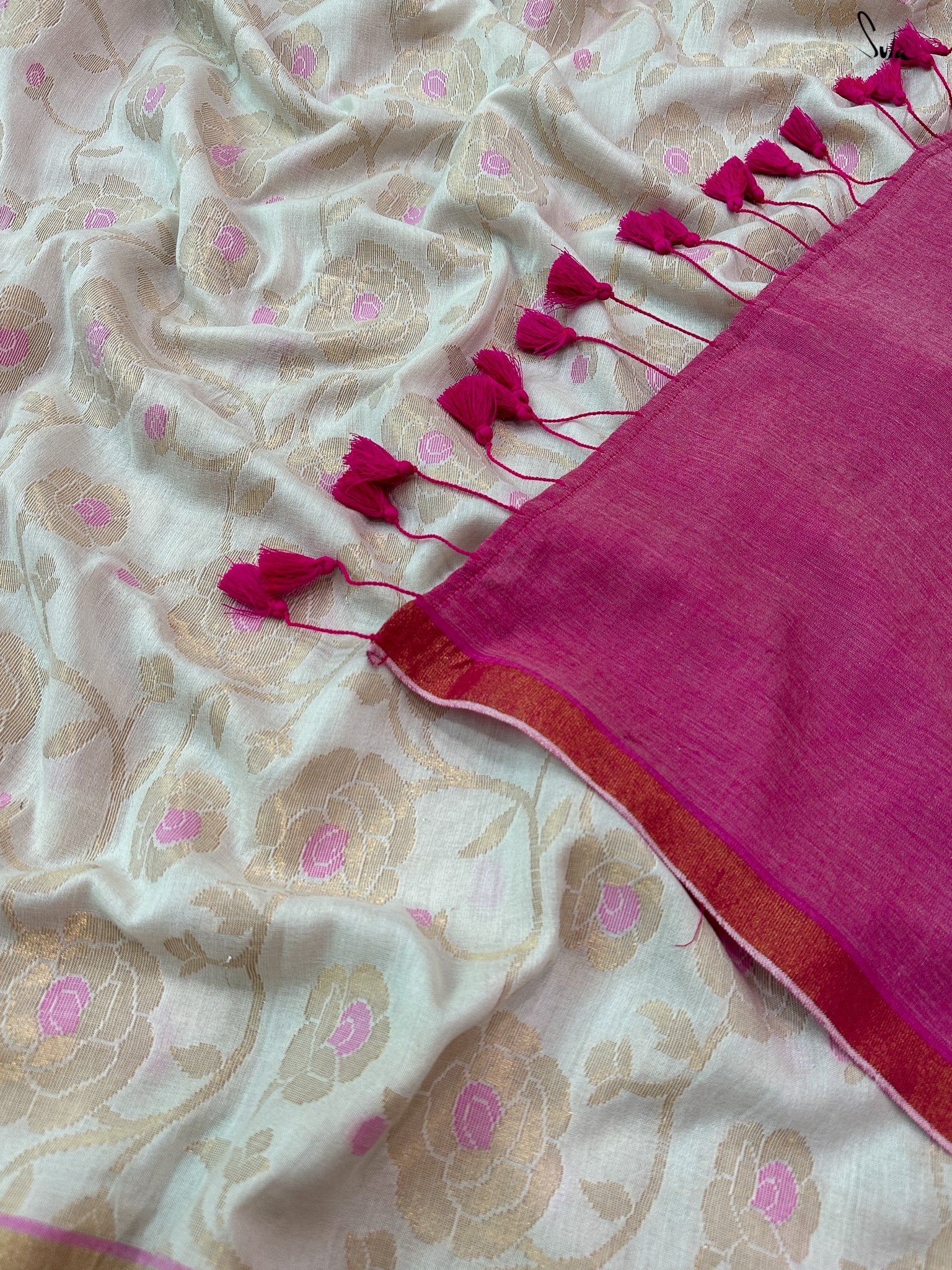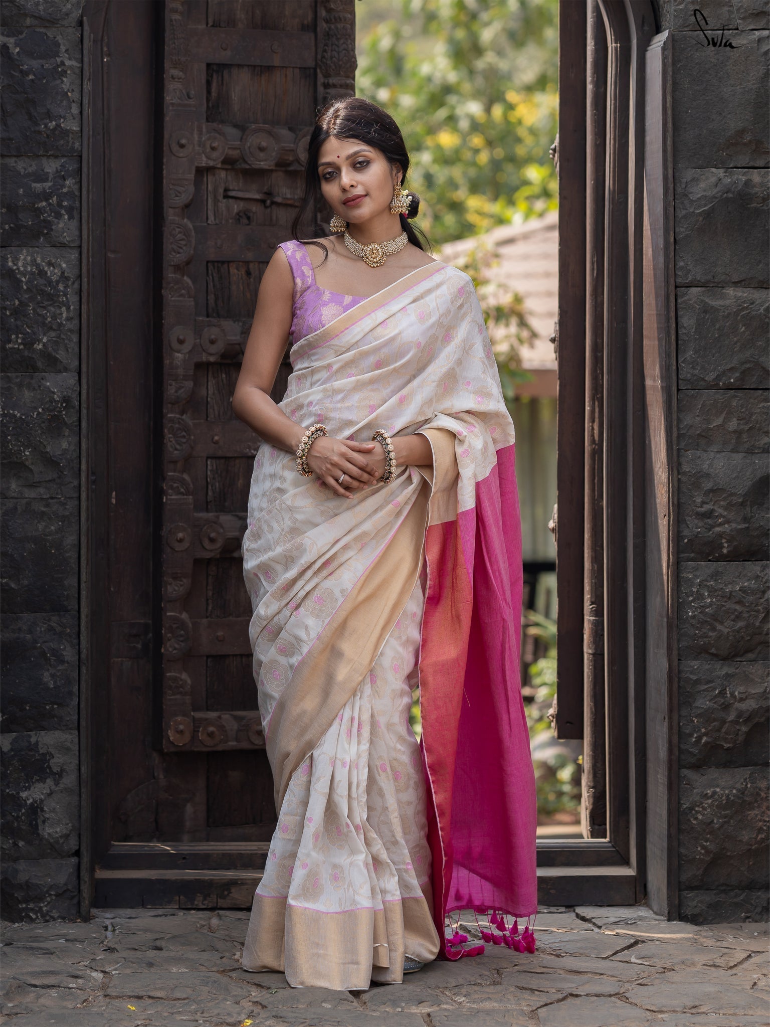 Expect to turn heads in this statement saree just the way you do it in your statement earrings. This white and pink piece is made to hold the spotlight.