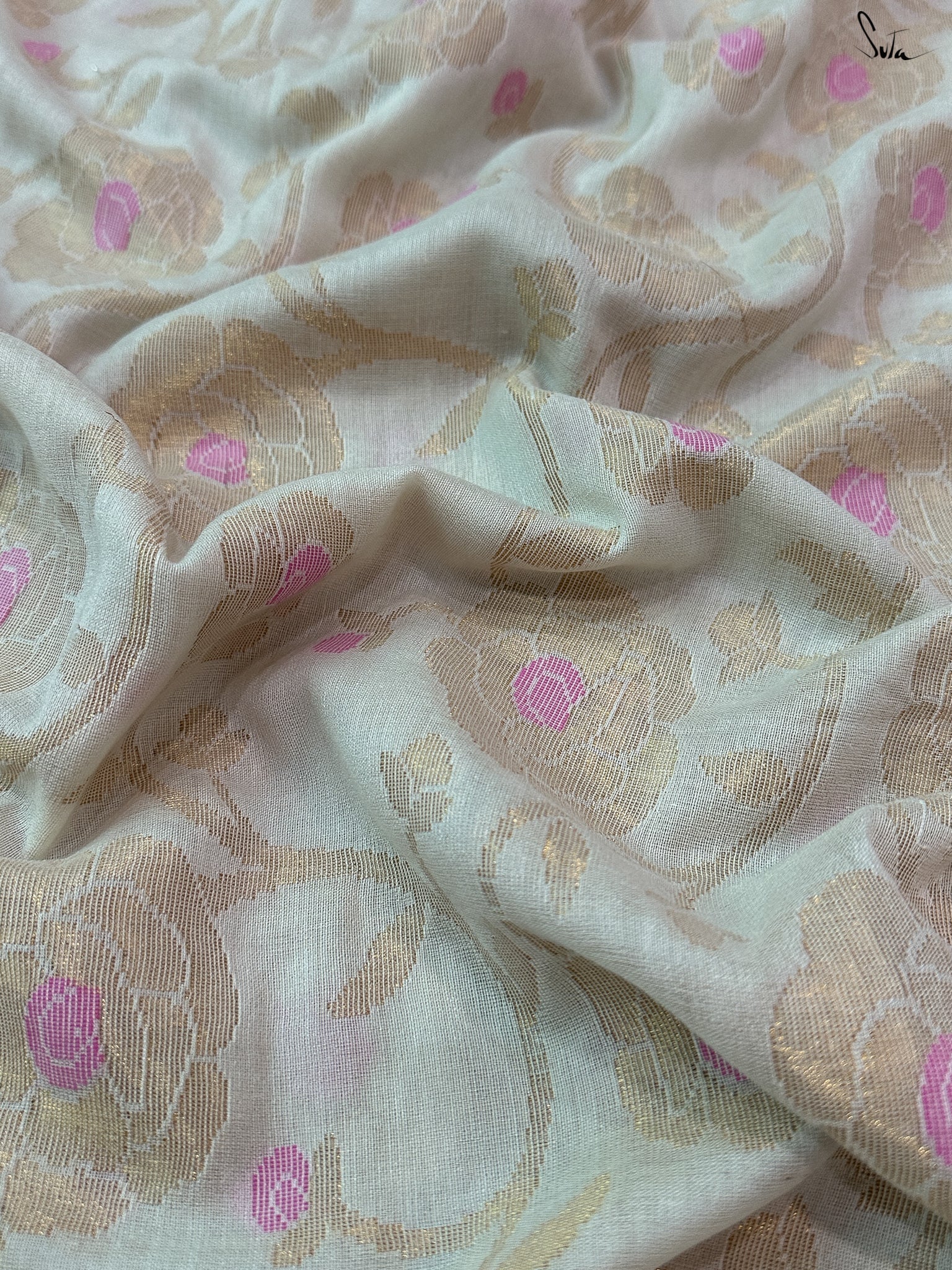 One of the most popular natural fibres in the world, cotton is hailed for its beauty, comfort, durability and versatility. Cotton is naturally sustainable and its cultivation supports local farmers and communities. A low maintenance fabric, cotton is also hypoallergenic, making it the perfect choice around the year, especially for the Indian climate. We took this simple, elegant fabric and combined it with acrylic to add sheen, lustre and pizzazz. The inclusion of subtle zari embellishments lends an old-world finesse to the saree, making it the star of every show!