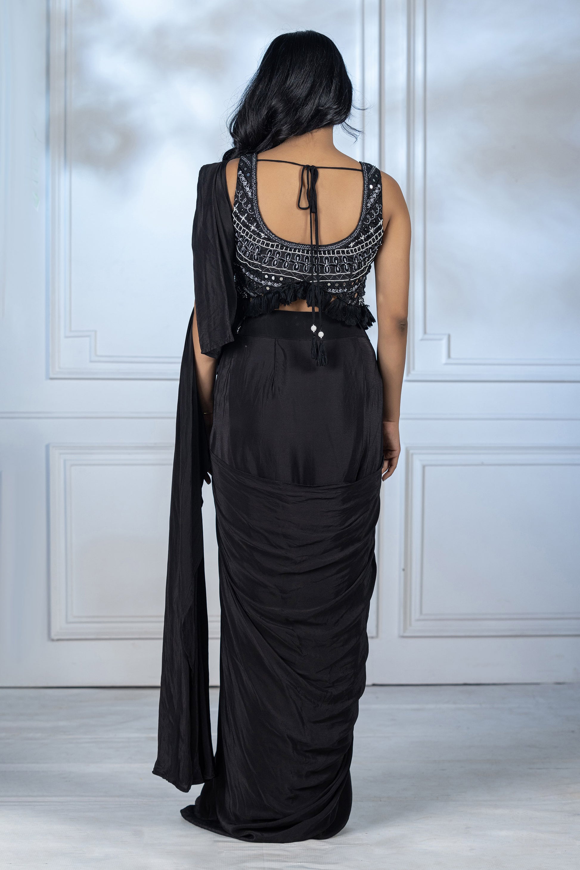 Charcoal blouse & drape with mirror embellishments, tassel details & simple organic drape for tha perfect sculpted look