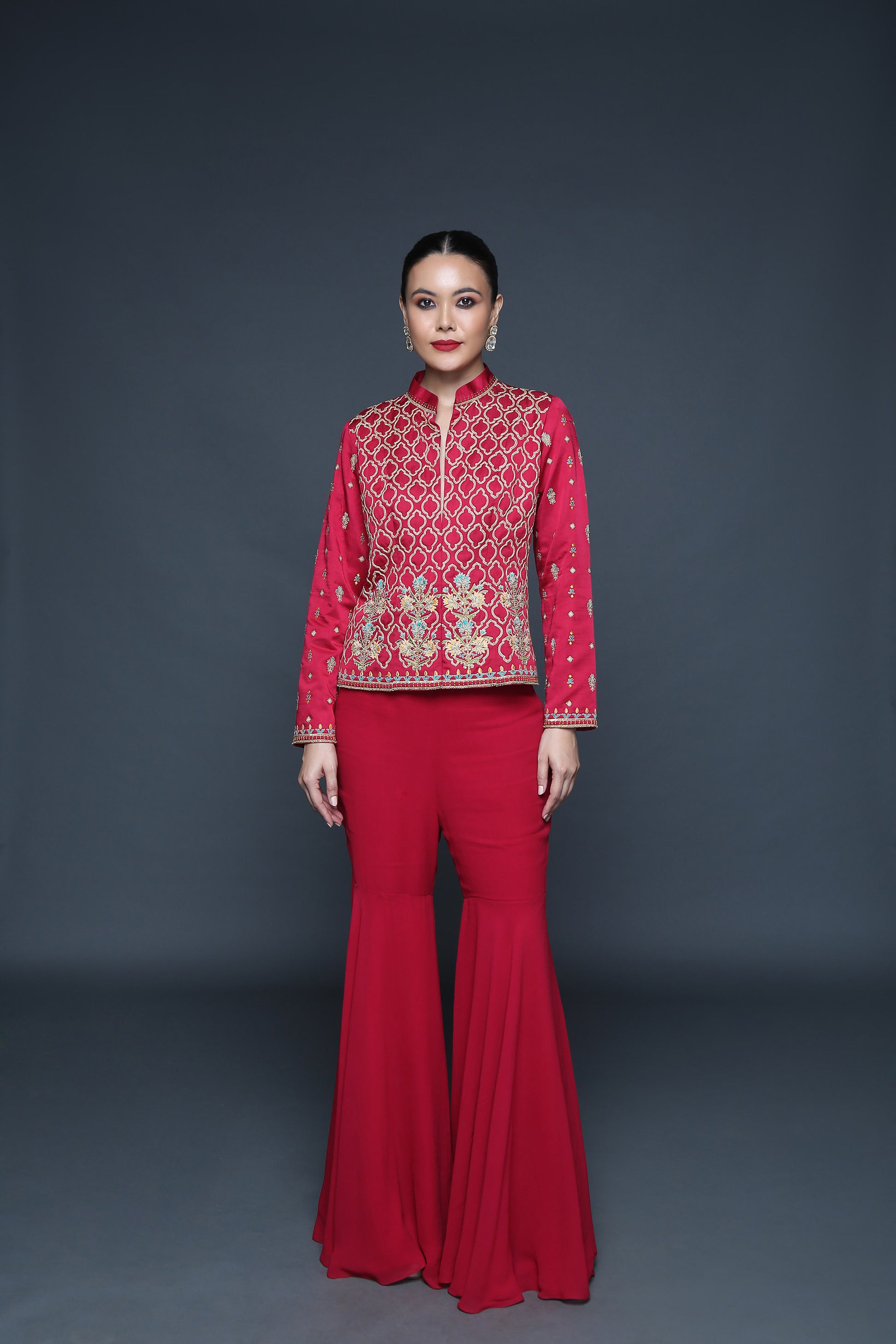 Cherry Red Bundi With Palazzo - Sanjeev Marwaaha