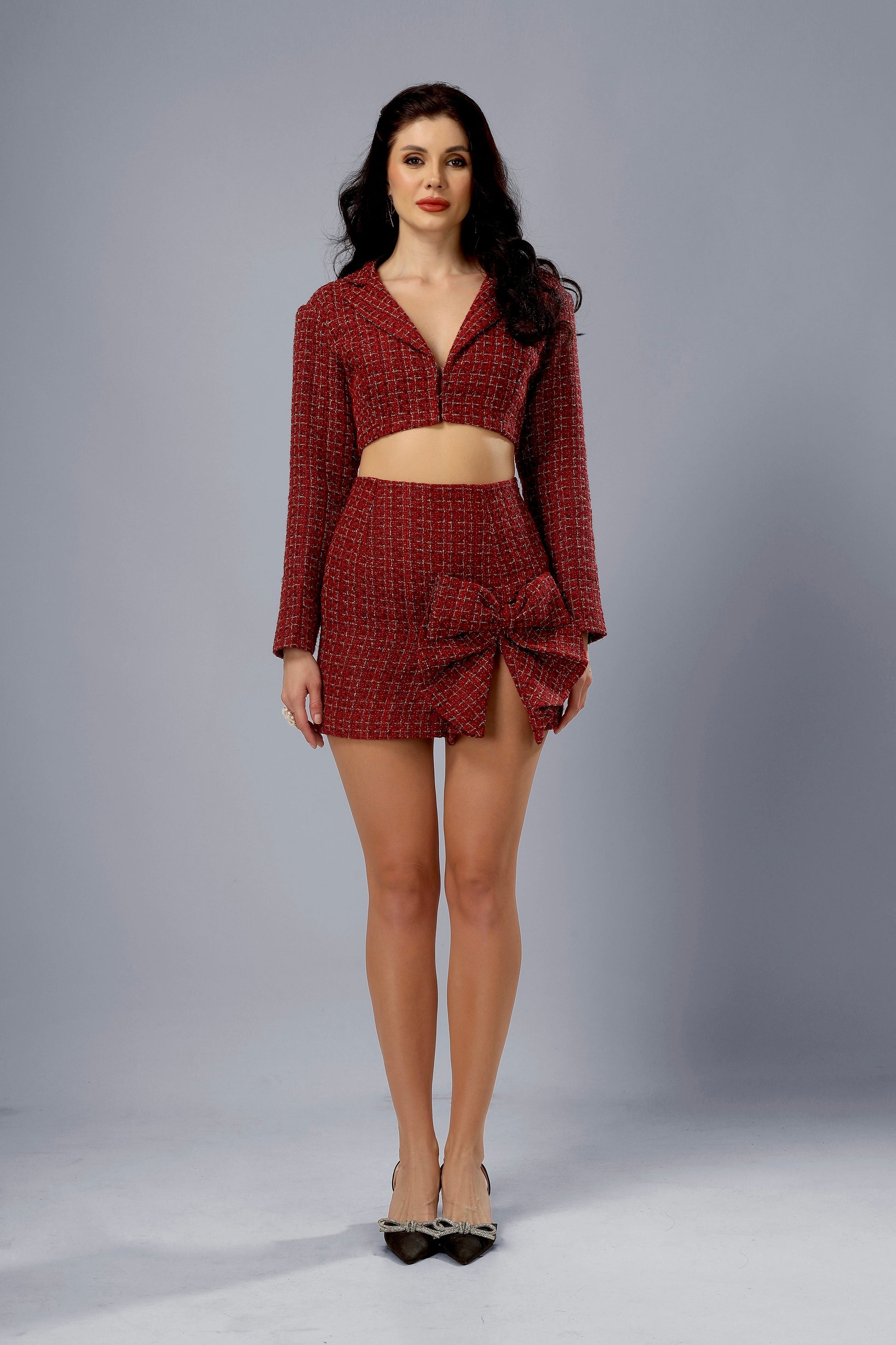 Crop blazer paired with pencil skirt in bow slit detailing.