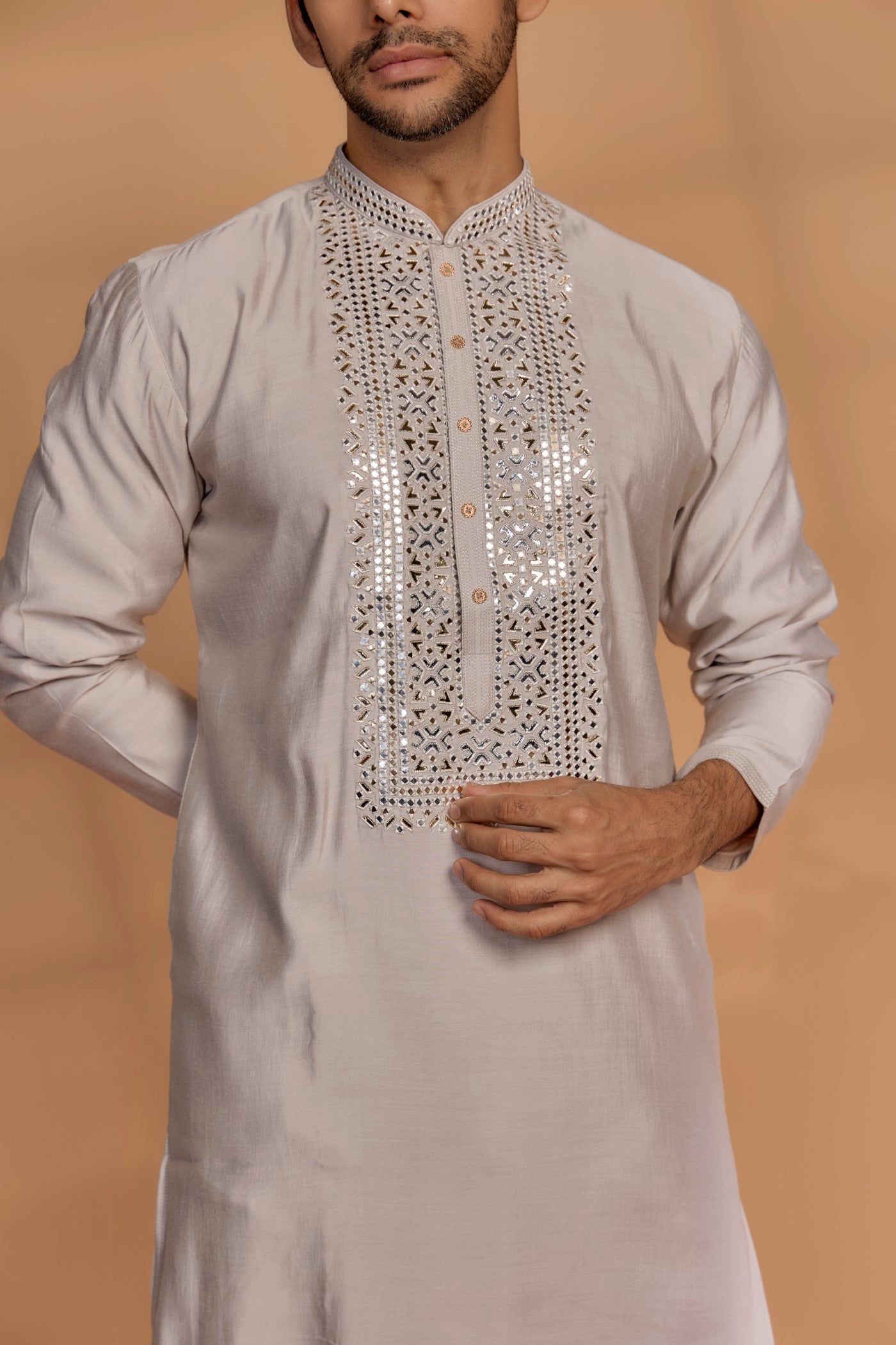 Coconut White Banarasi Silk Mirror Embellished Kurta Set