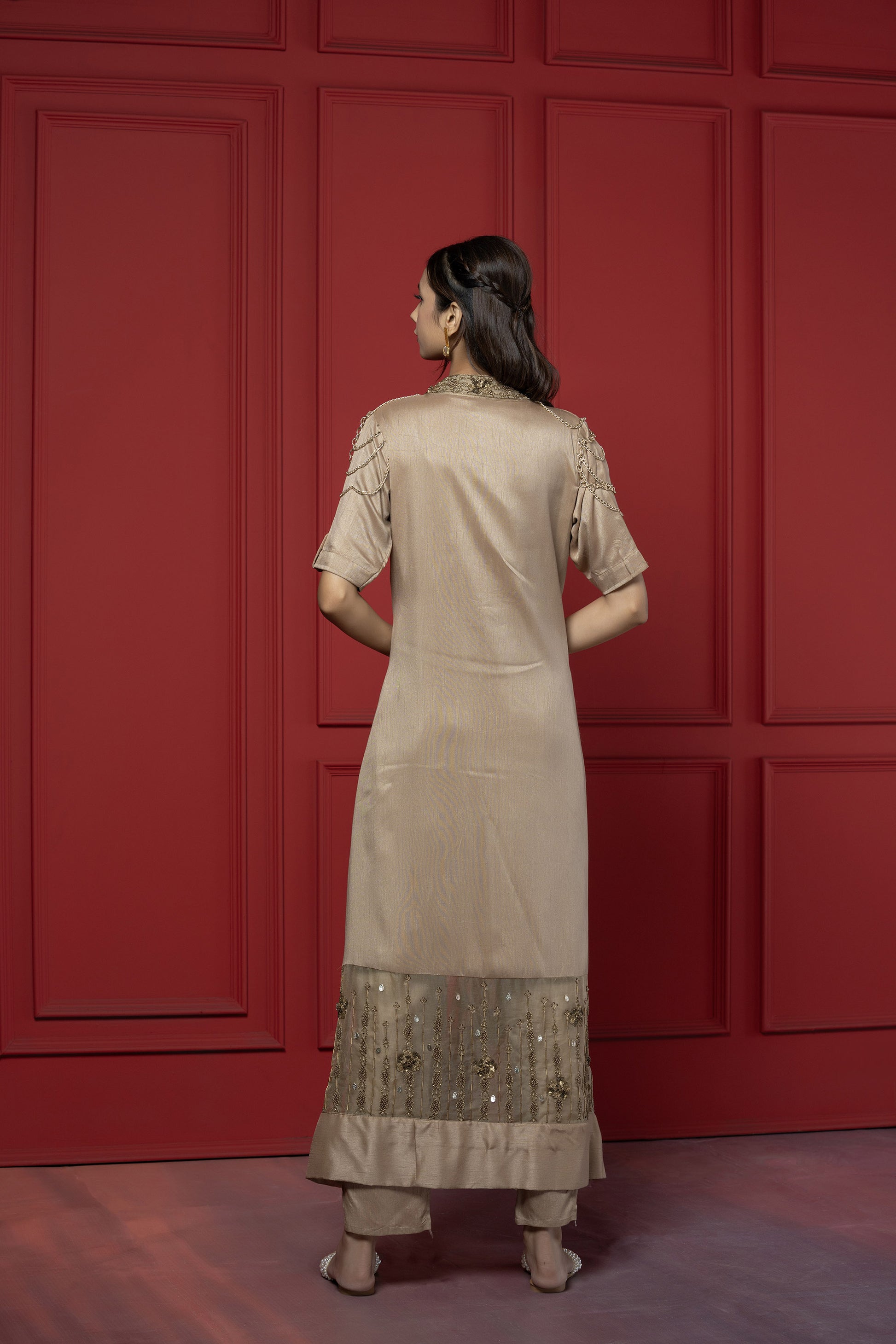 Embroidered corset with Long Jacket with embroidery in the bottom panel, chain detail around the shoulder & ankle pants