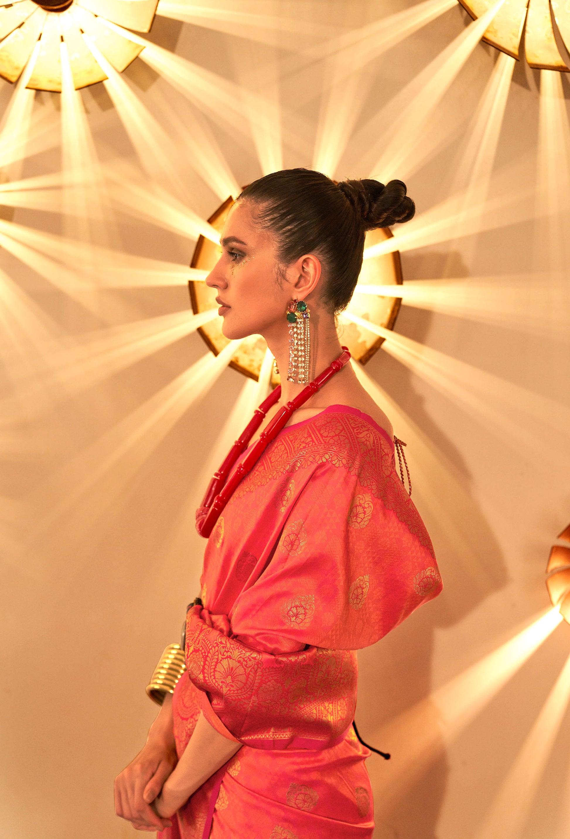 Coral Pink Kornella Chaap Handloom Silk Saree