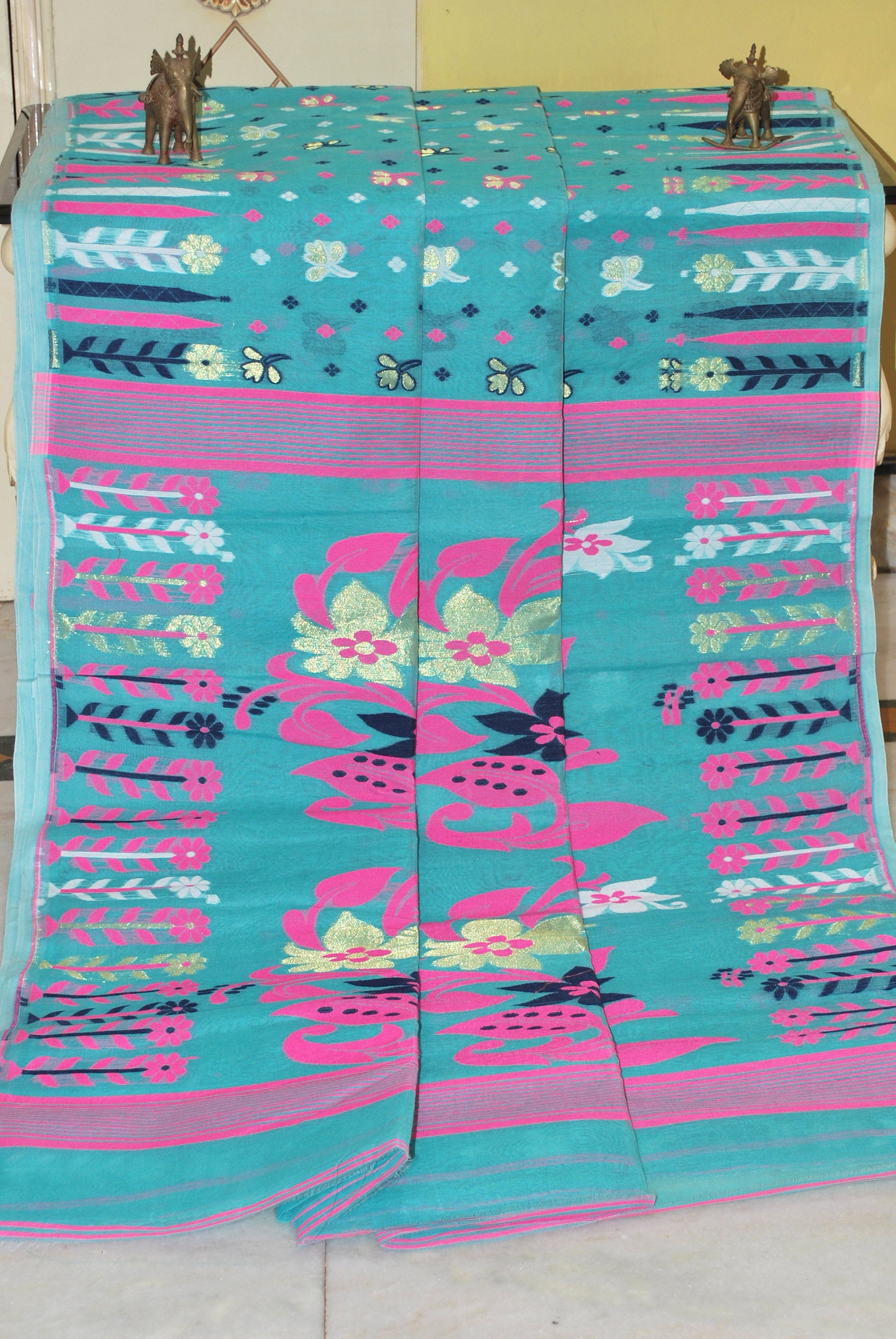 Cotton Muslin Jamdani Saree in Turquoise, Pink and Multicolored