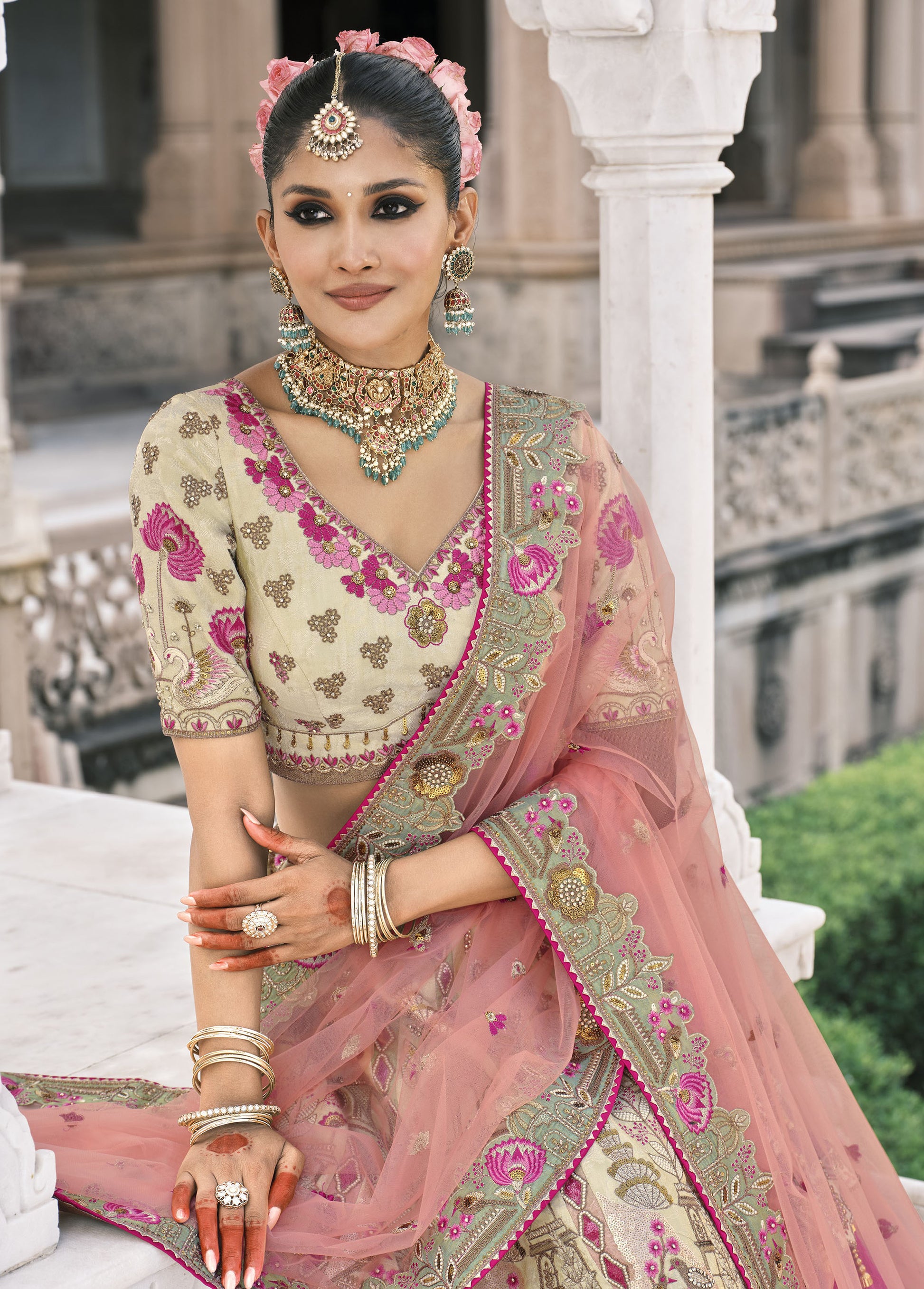 Bridal lehengas typically pair well with traditional Indian jewelry such as Kundan, Polki, or Gold sets embellished with pearls, gemstones, Polki, Pearl Chhapka, Golden Meenakari or intricate detailing. These pieces complement the richness of the lehenga while adding a touch of elegance to the overall bridal ensemble.