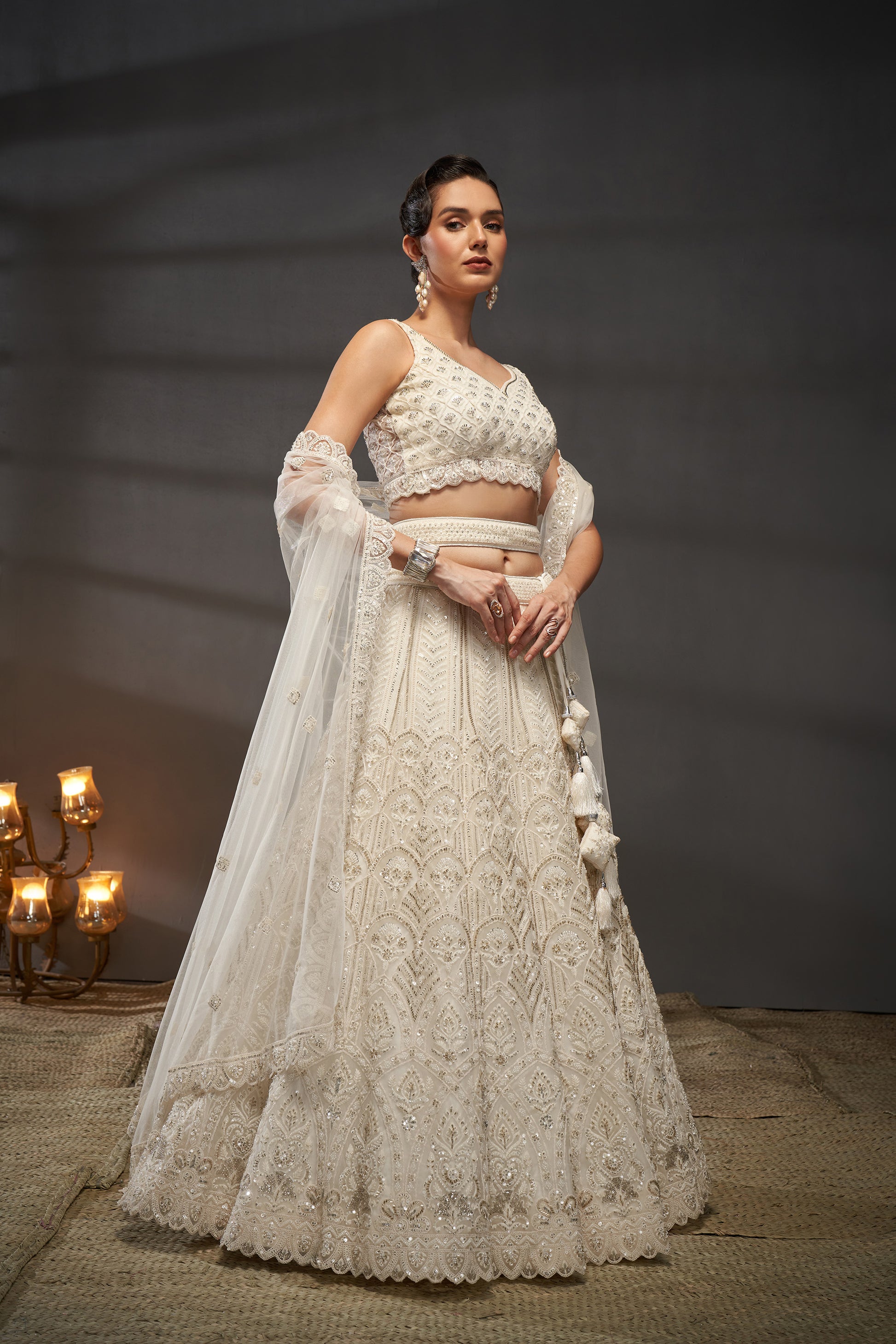 Cream Net Cutdana, Sequins and Zarkan embroidery Lehenga