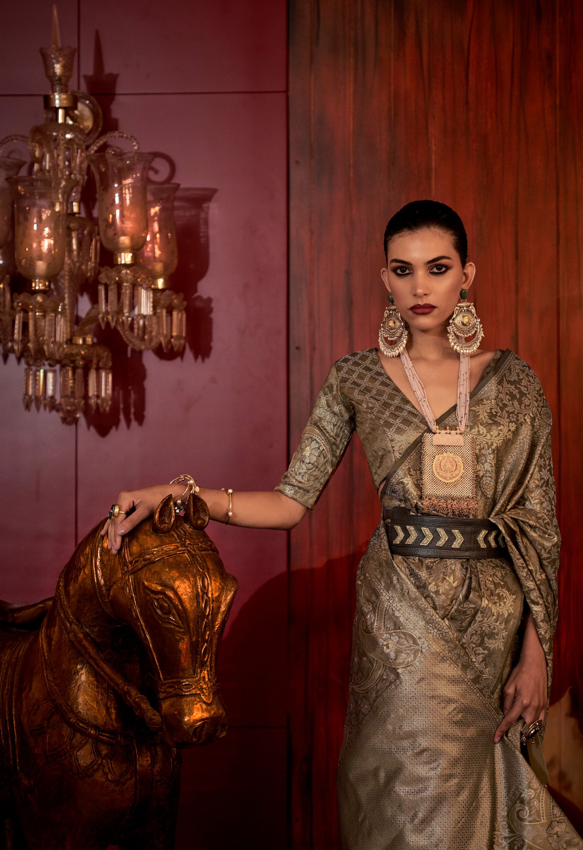 Dark Grey Kalkatti Zari Handloom Silk Saree