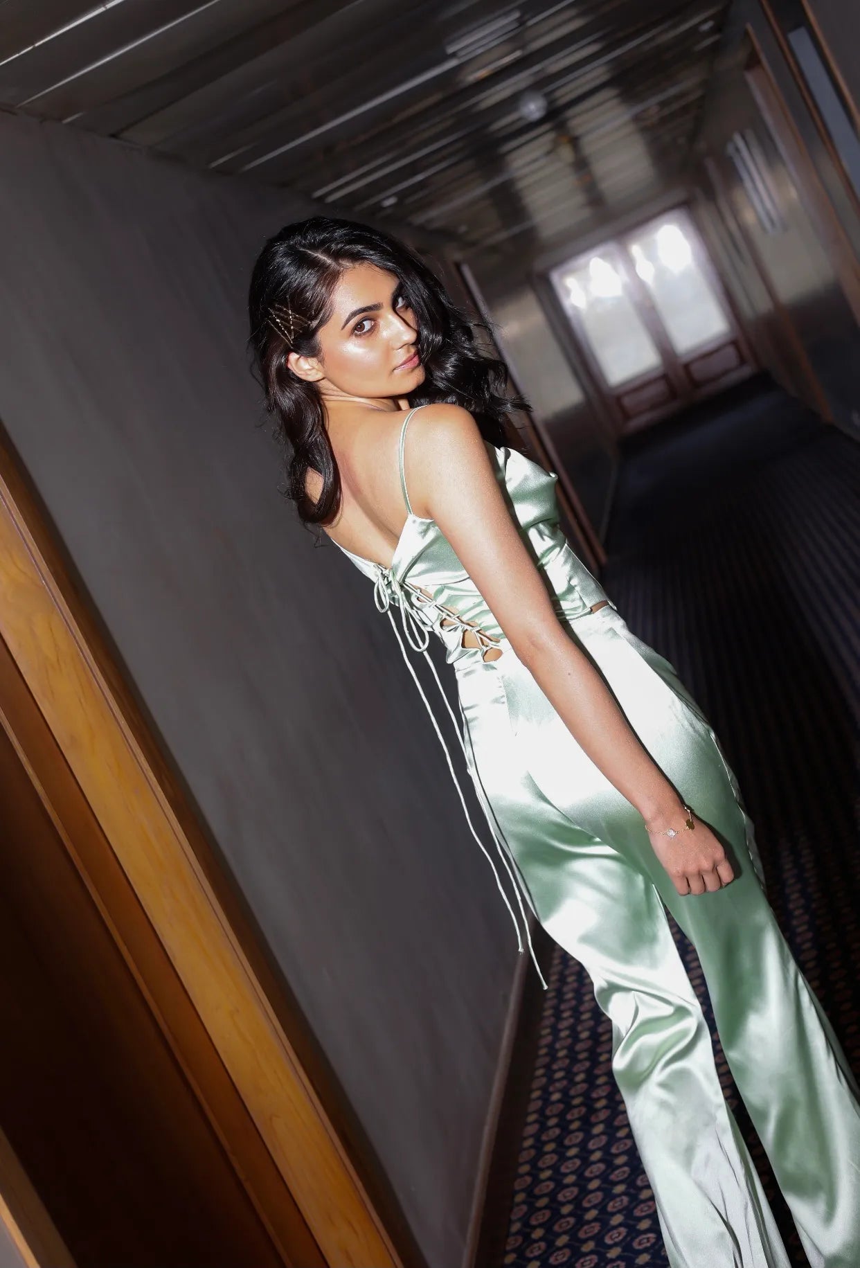 DETAIL- Mint green cut sleeves wide leg jumpsuit with corset waist, padded and knotted back.