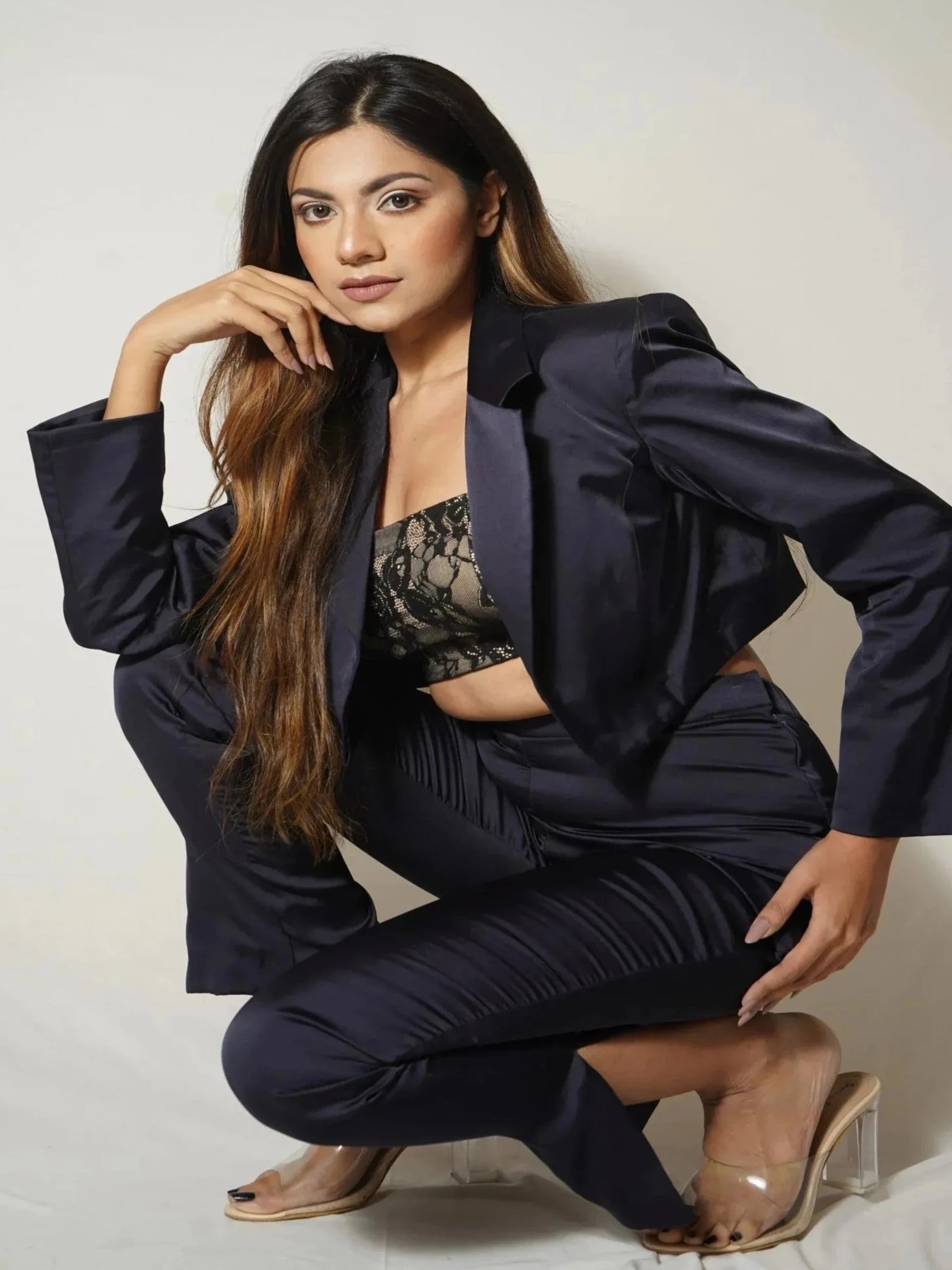 DETAIL- Blue crop blazer paired with matching pants and lace padded bralette.