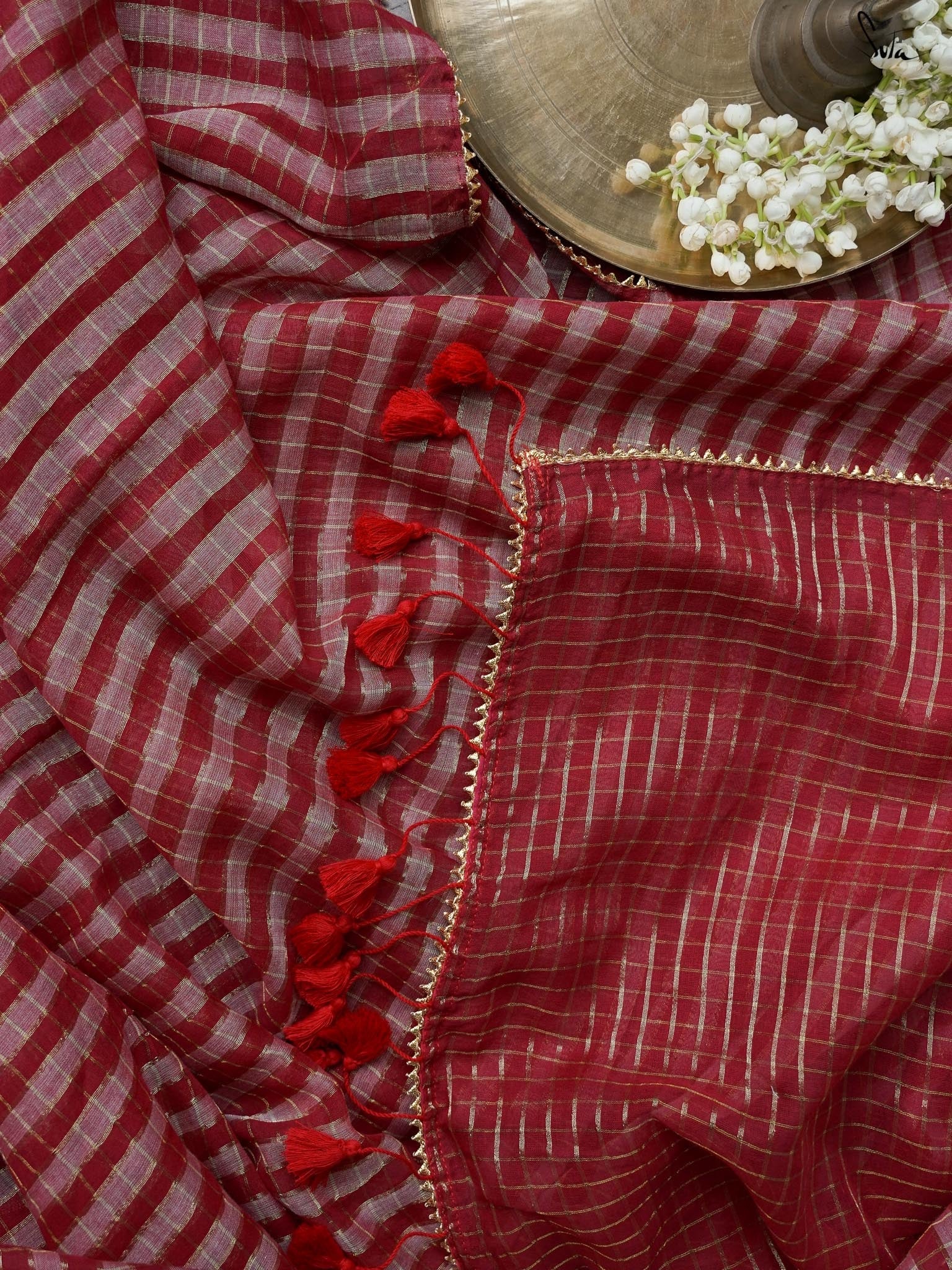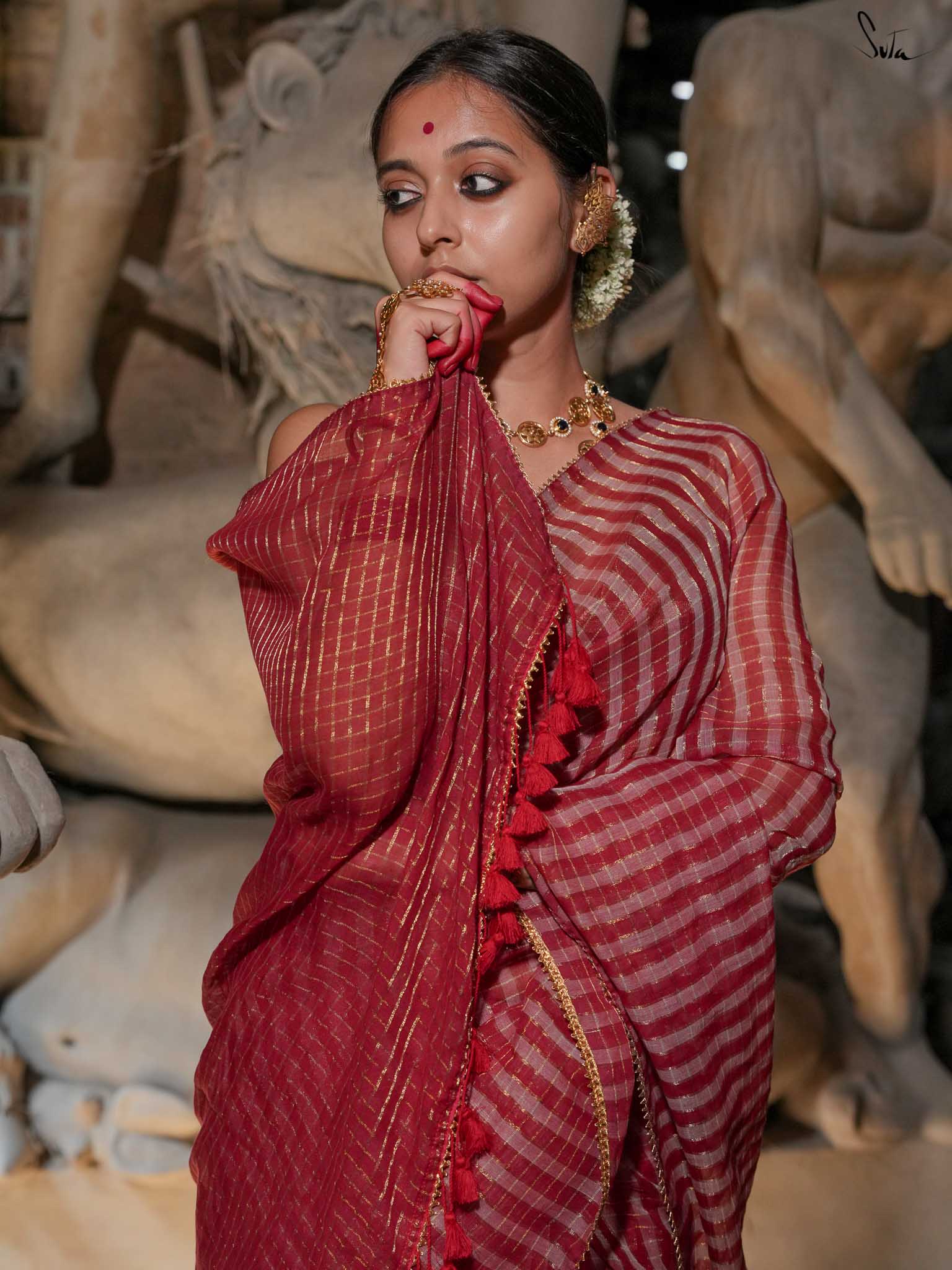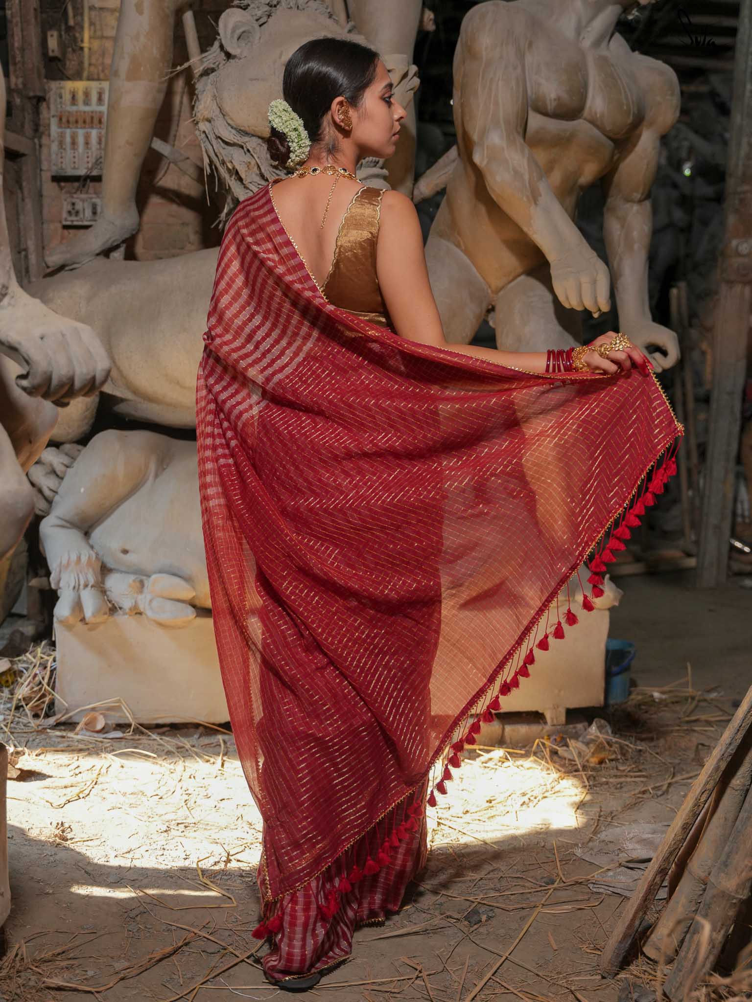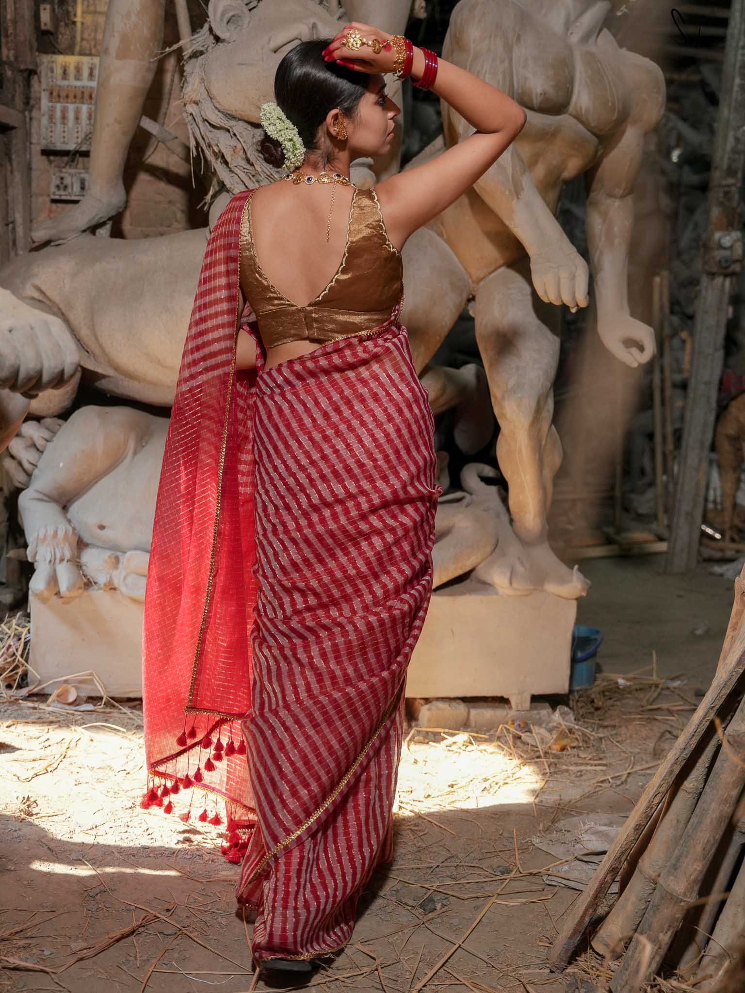 Dhunuchi Naach is woven from feather-light mul cotton fabric in gold and red hues. Inspired by the Dhunuchi Naach, a visual expression of devotion and gratitude towards Maa Durga, this saree captures the essence of invoking her blessings. It features gold stripes woven all over the red body, with gold lace on the border and beautiful red tassels on the edge. Blending contemporary and traditional elements, this saree is perfect for any festival season.