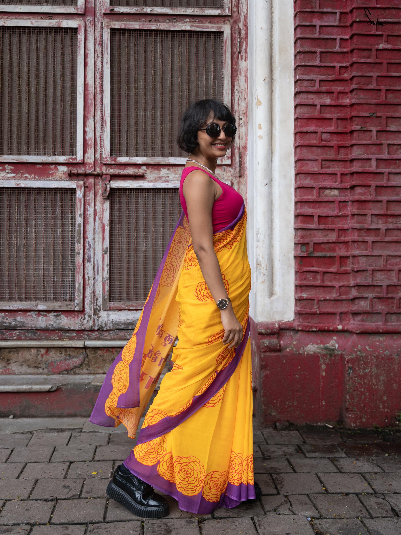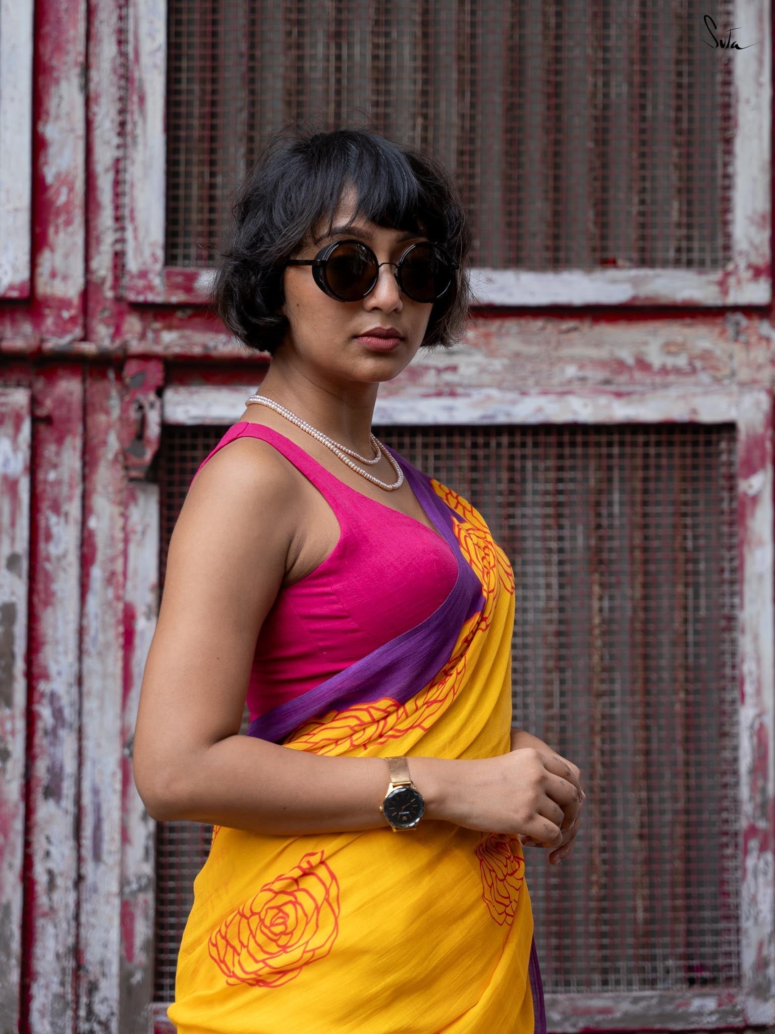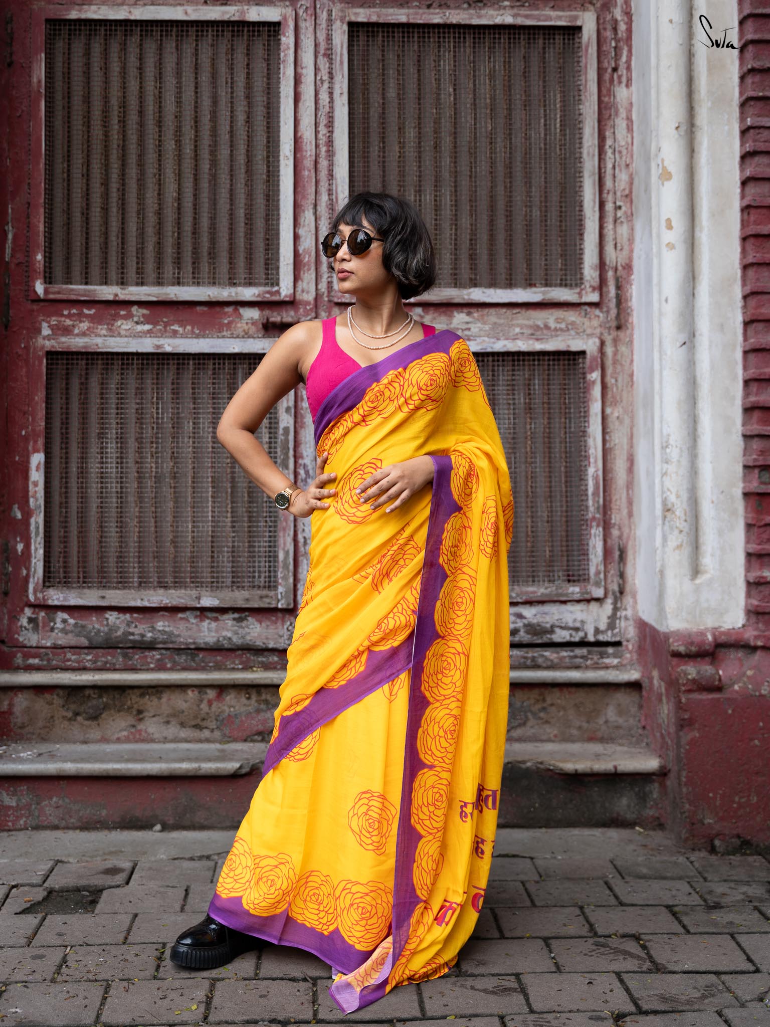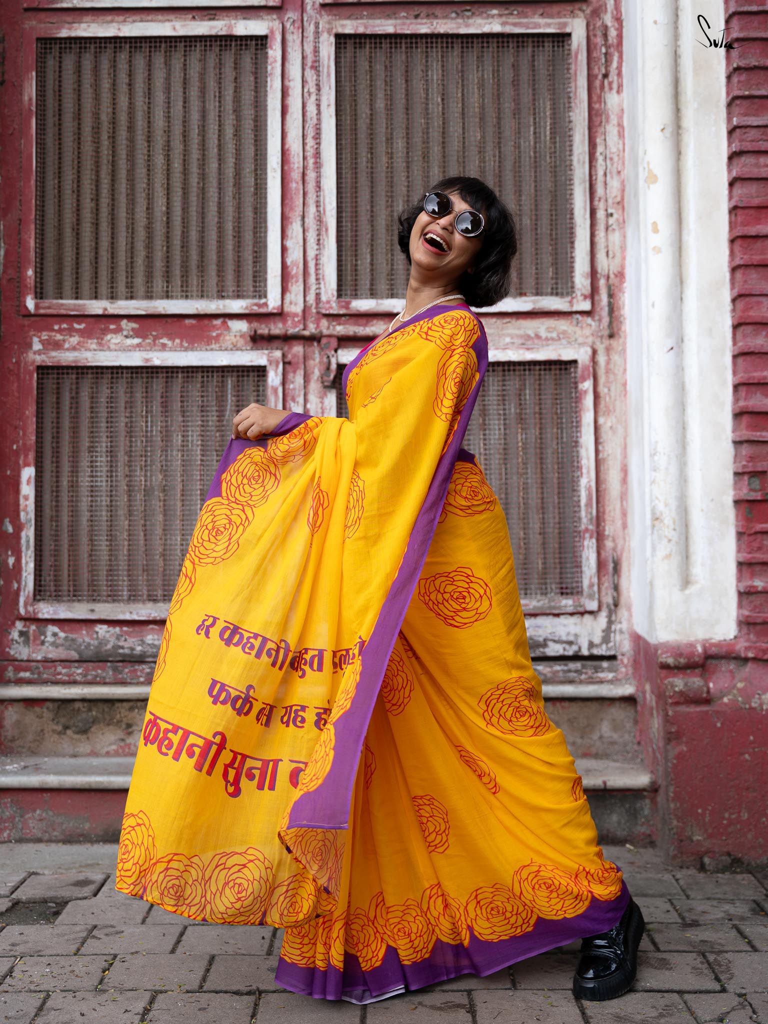 Suta's Mul Cotton sarees beautifully blend chic style with comfort. Crafted from lightweight Mul Cotton fabric, these sarees offer a soft, flowy drape. Presenting the Taapsee × Suta collection, capturing love and passion in every thread. The 'Dil Ke Taar' is a captivating yellow digitally printed sarees, featuring a red rose pattern across the body, a solid black border, and a pallu that reads, “हर कहानी के बहुत पहलू होते हैं.... फर्क बस यह होता है की कहानी सुना कौन रहा है…” Designed to add grace to your look, make space in your wardrobe for this Dil Ke Taar Mul Cotton saree.