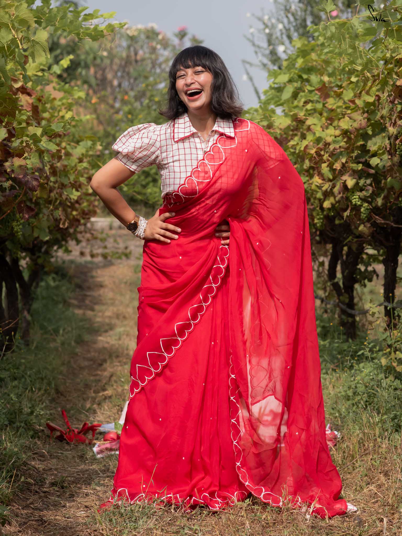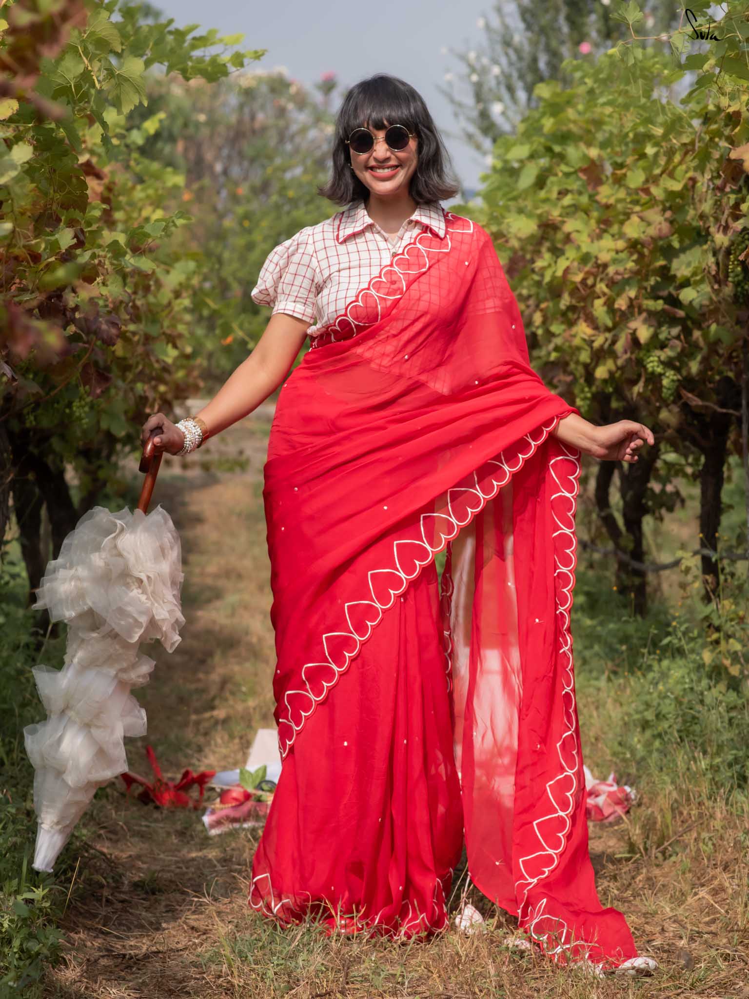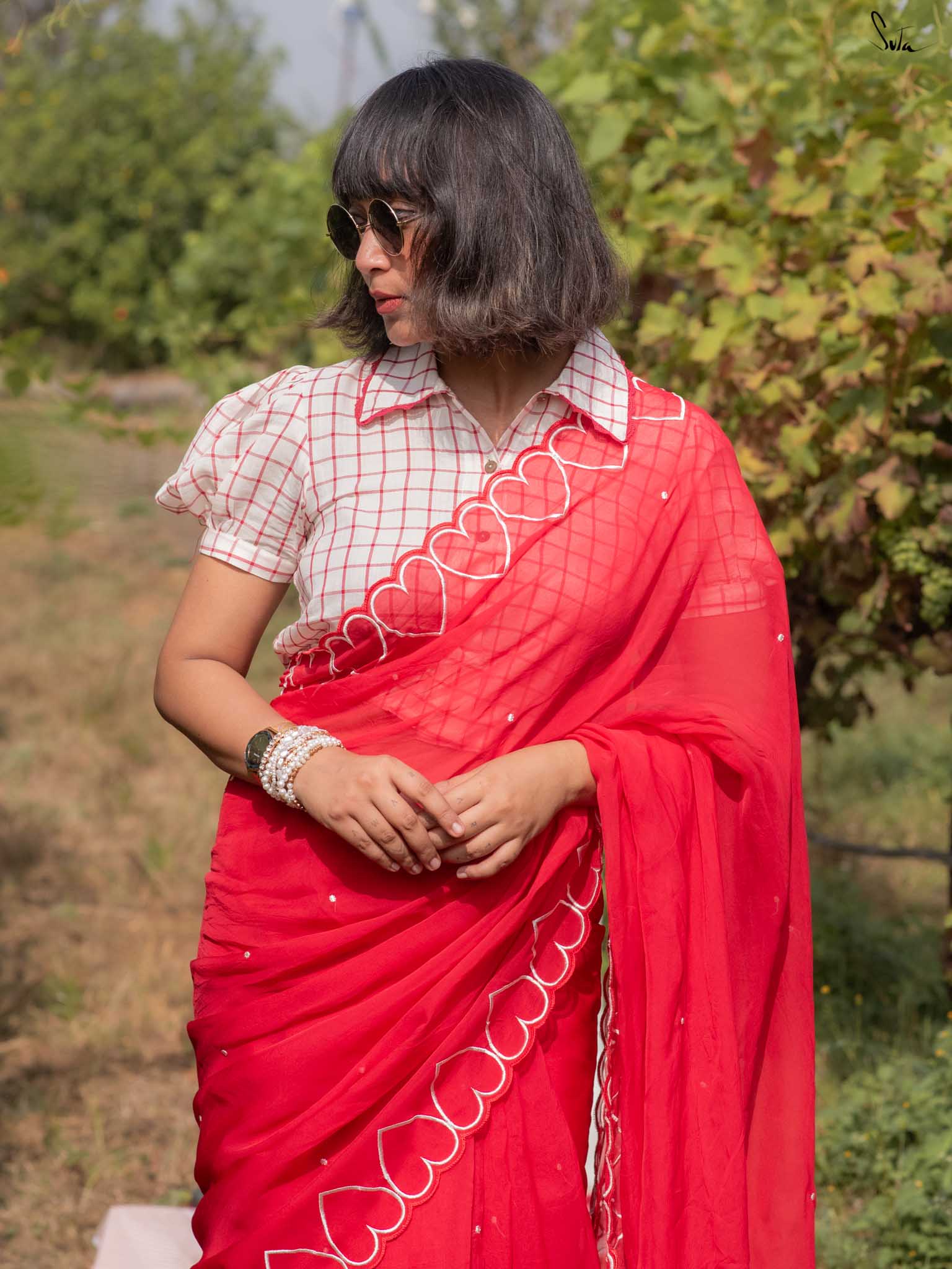 Wrap yourself in the embrace of Dil Se Hearts, a red saree that embodies the warmth and tenderness of a loving hug. Crafted from viscose organza, delicate white thread embroidered hearts adorn the border, like the soft caress of a loved one’s touch. Playful heart-shaped tassels on the pallu infuse a touch of whimsy, a reminder that love is meant to be a joyful celebration. This saree comes with a red-and-white checked blouse piece attached.