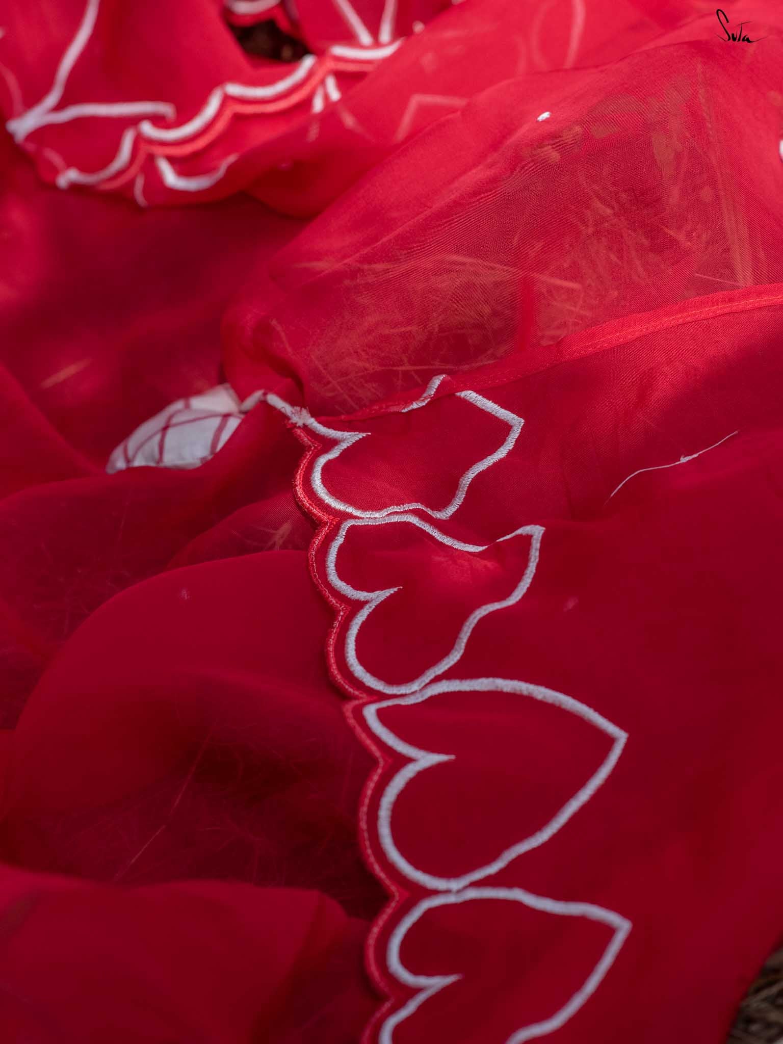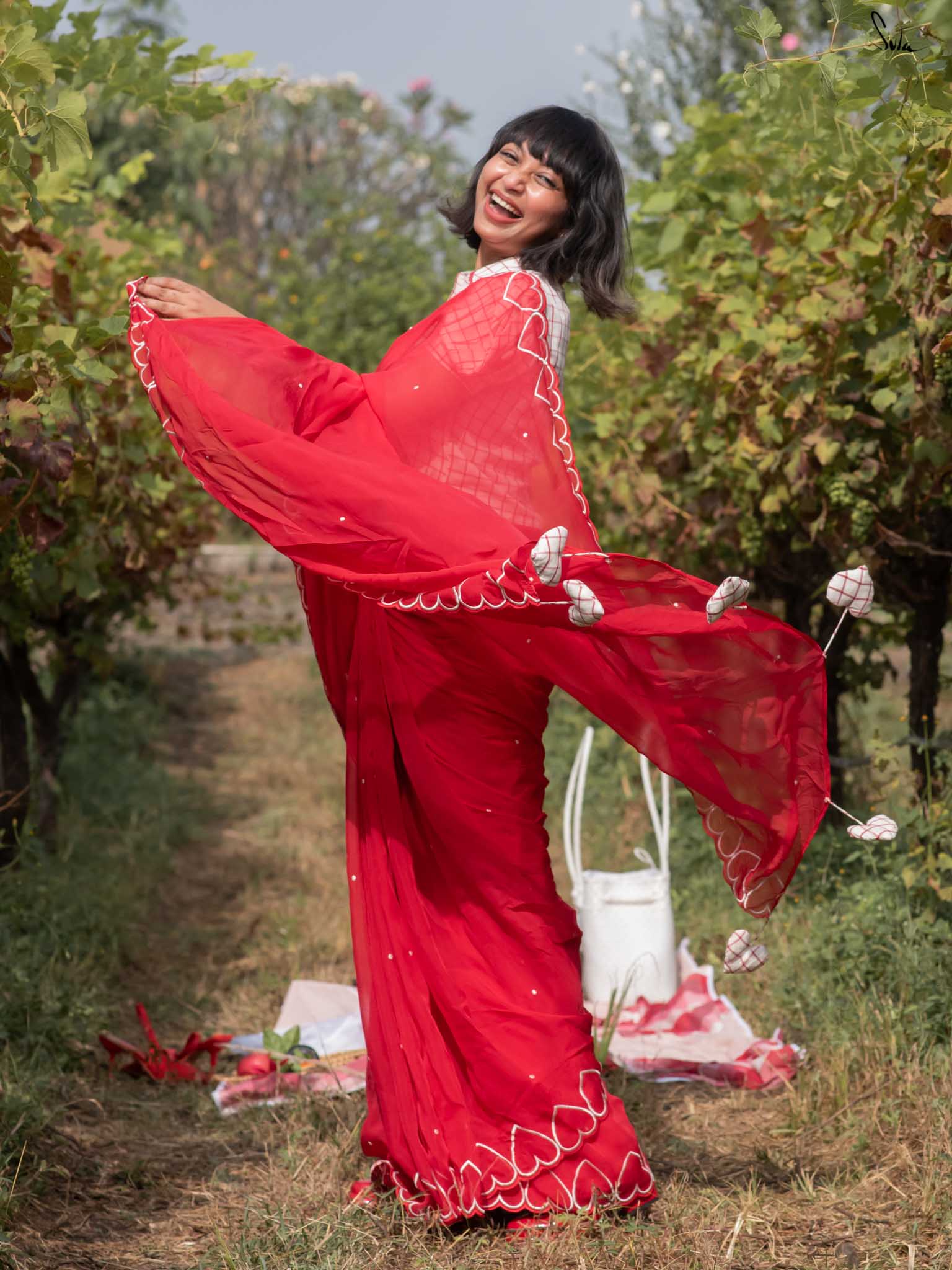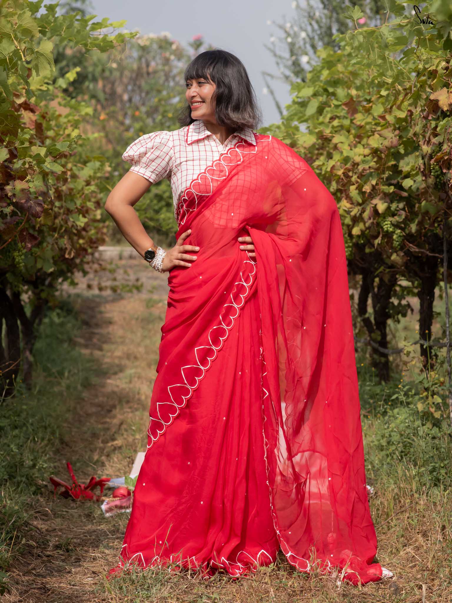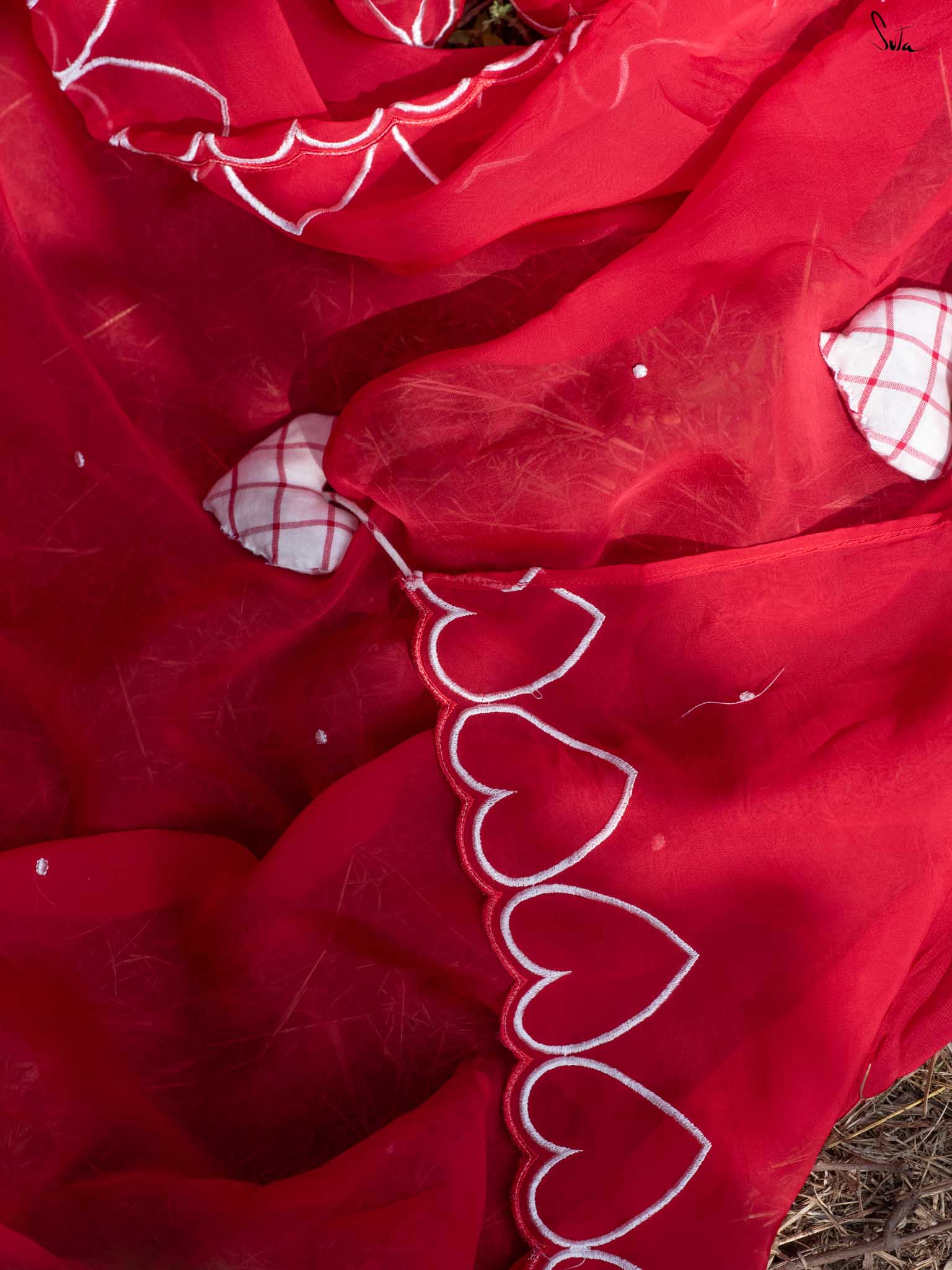 Wrap yourself in the embrace of Dil Se Hearts, a red saree that embodies the warmth and tenderness of a loving hug. Crafted from viscose organza, delicate white thread embroidered hearts adorn the border, like the soft caress of a loved one’s touch. Playful heart-shaped tassels on the pallu infuse a touch of whimsy, a reminder that love is meant to be a joyful celebration. This saree comes with a red-and-white checked blouse piece attached.