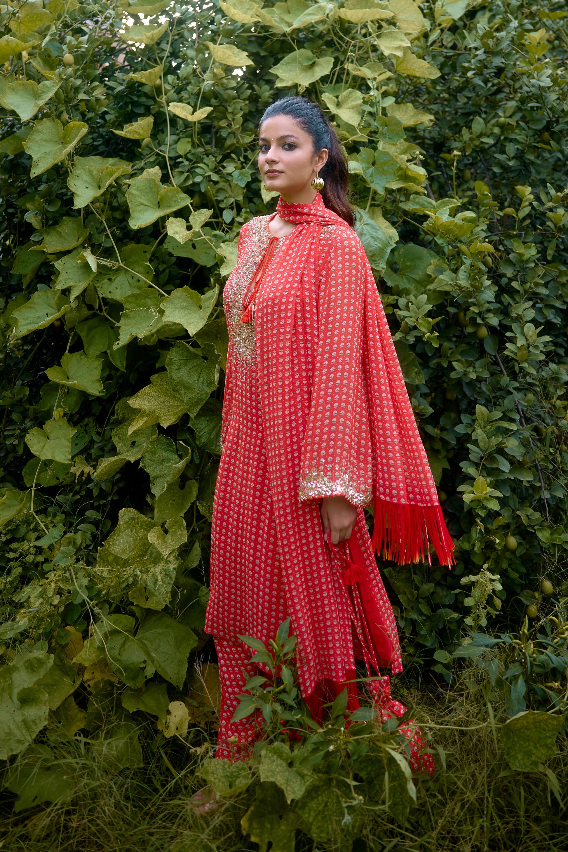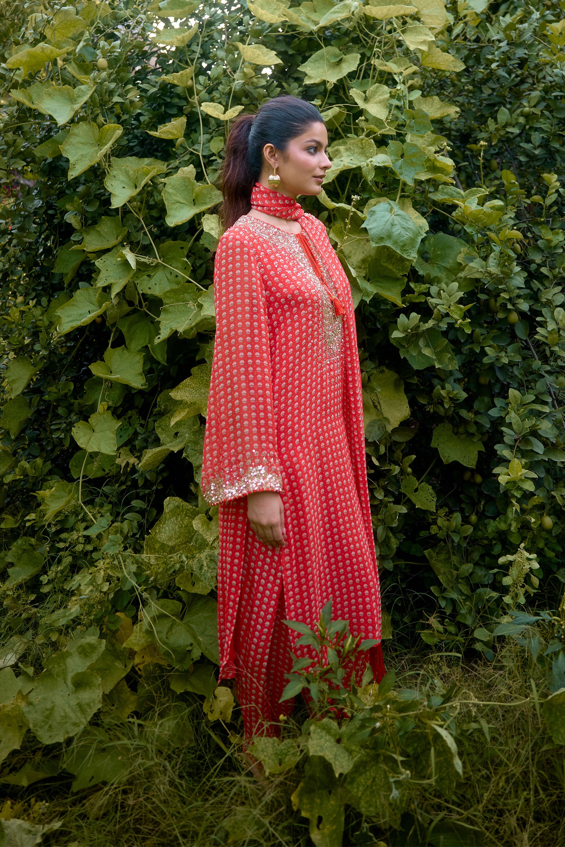 Coral georgette chotu sanga printed embroidered full sleeves long kurta paired with salwar and printed skinny scarf with ombre fringe details