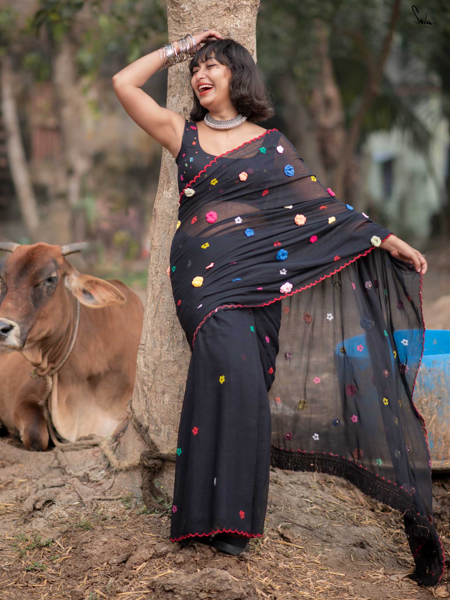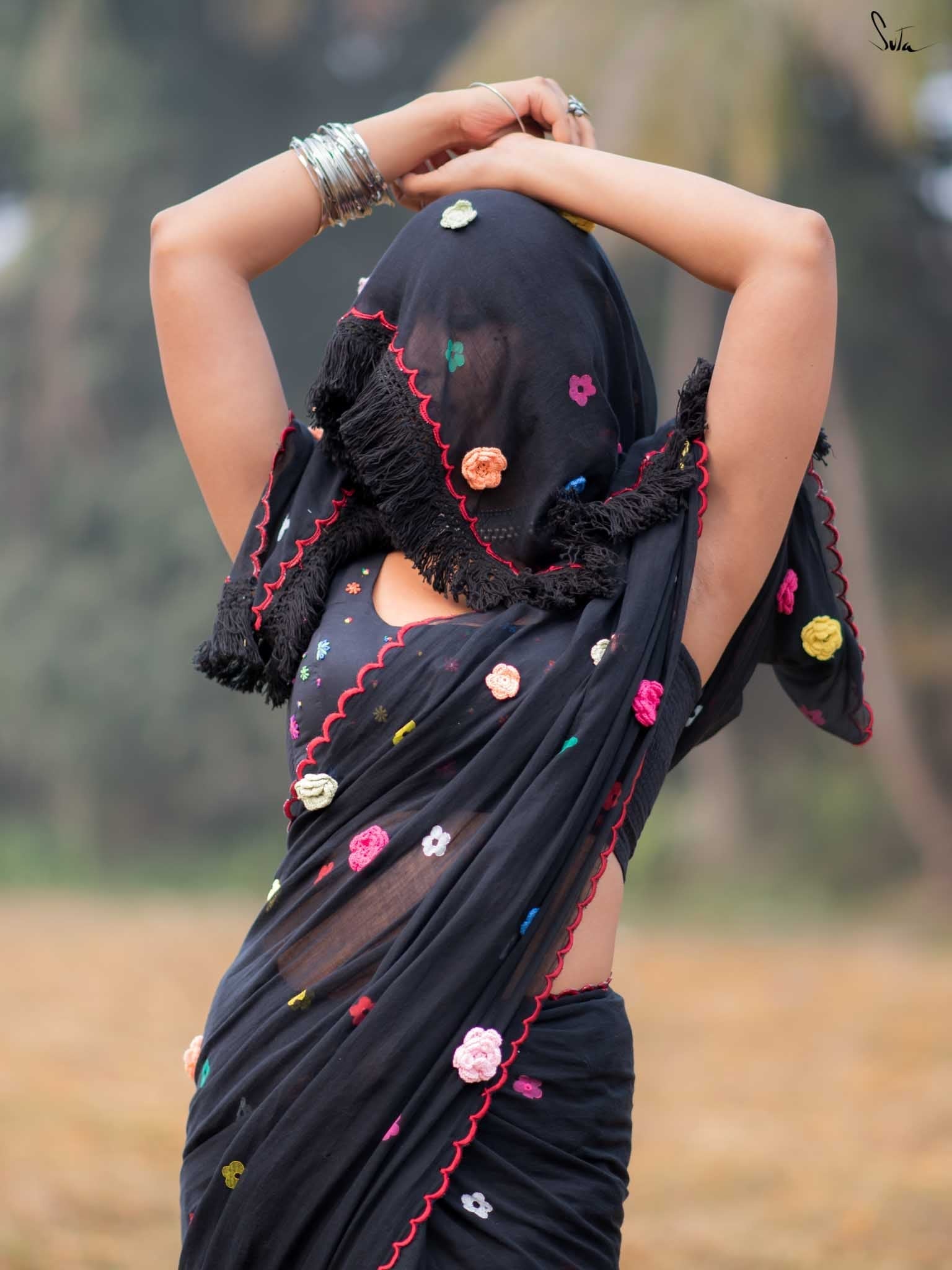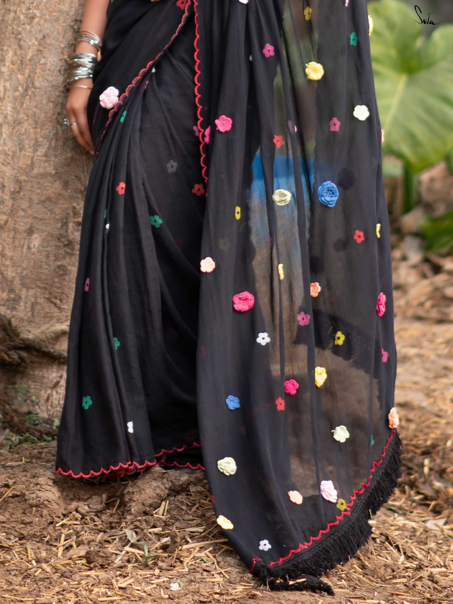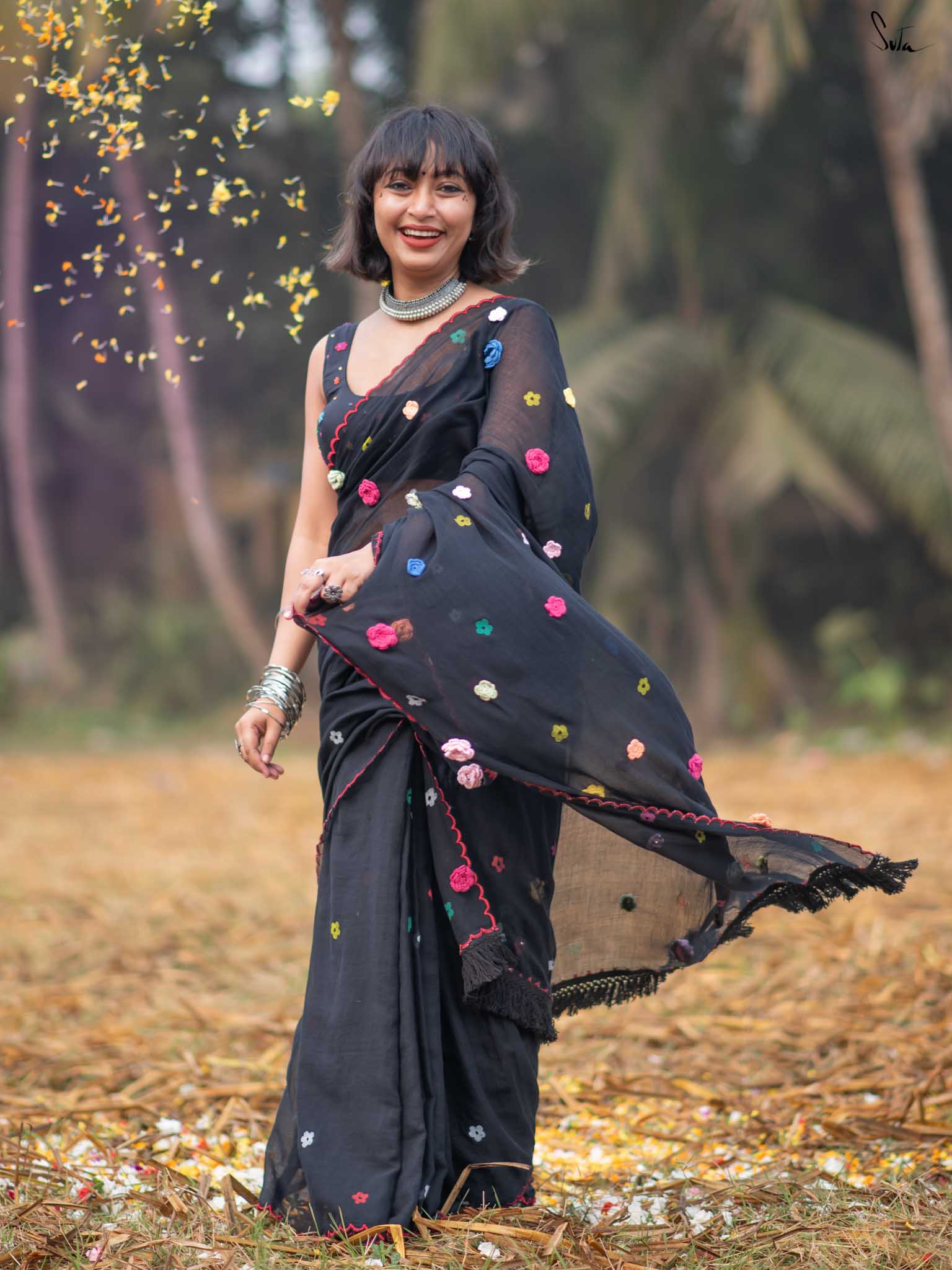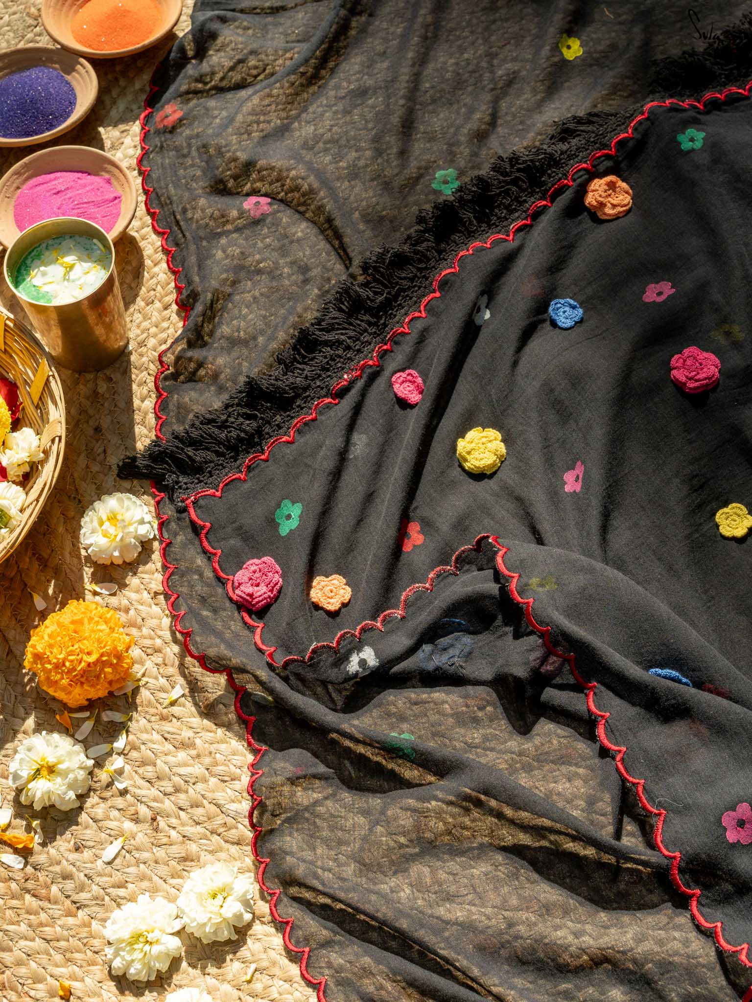 Like a dream spun into fabric, this Black mul cotton saree with multicolor block printed & hand-embroidered flowers dances with whimsy and charm. The 3D crochet flowers bloom like colors swirling in the air during Holi, while delicate block prints whisper stories of long-forgotten legends. The soft scalloped finish and gentle jhalar laces are the final strokes of a dream painted in vibrant hues, a vision of joy and freedom, spun into a saree.