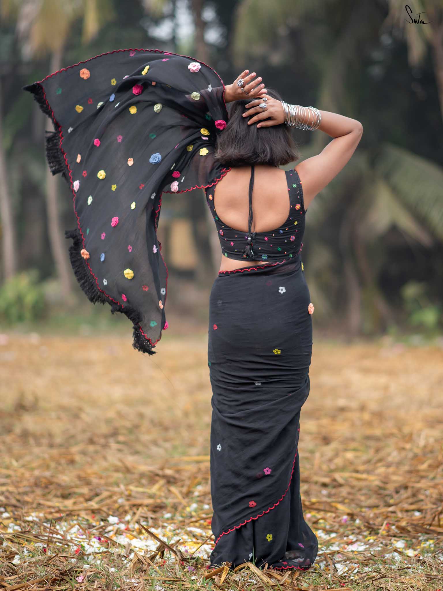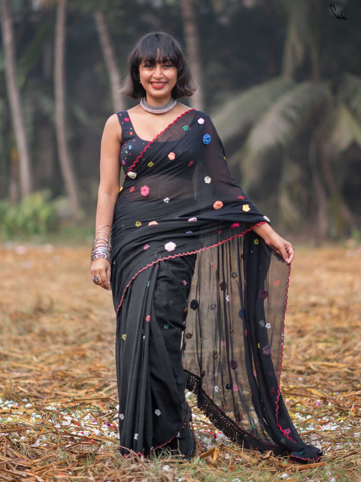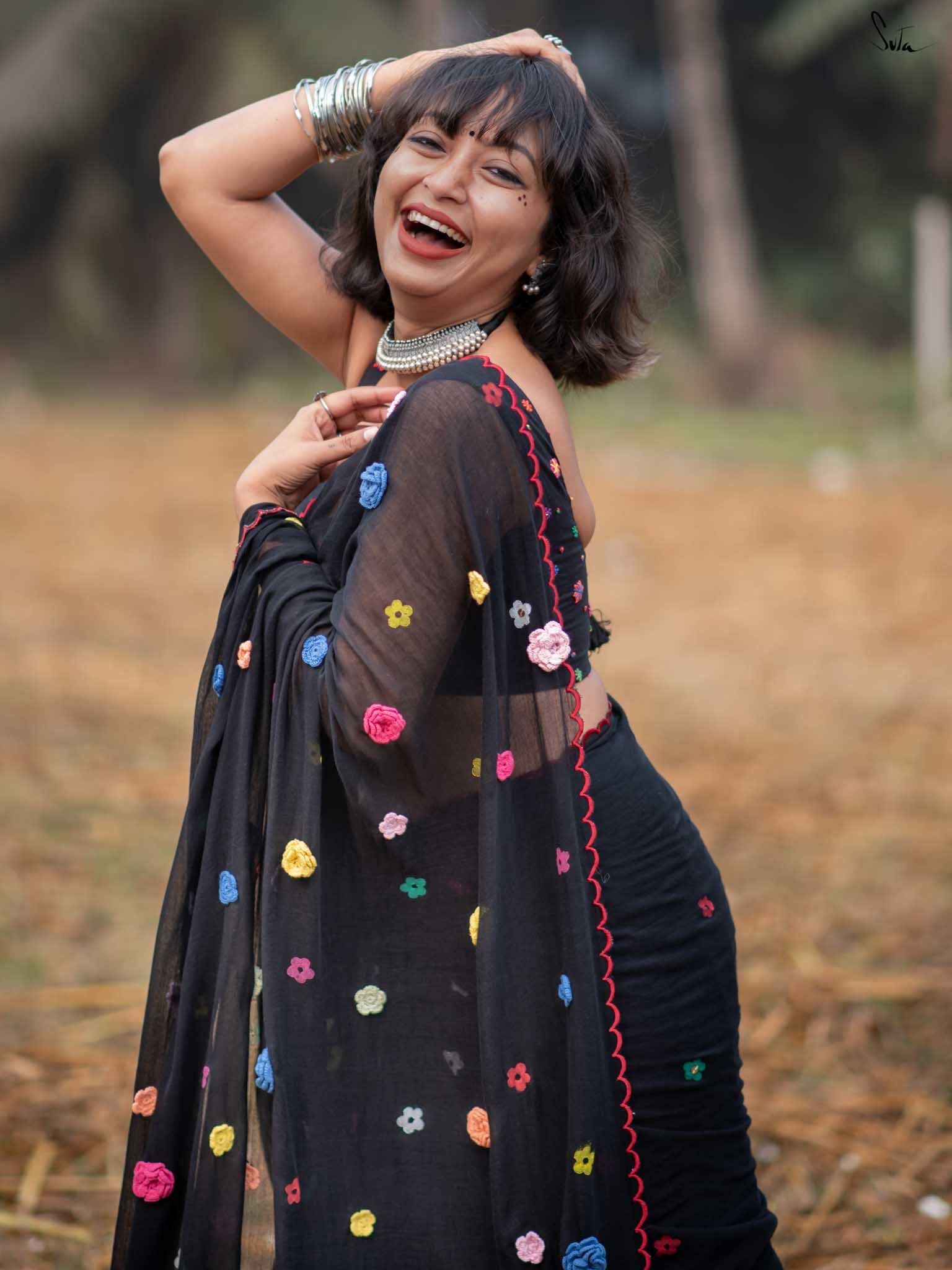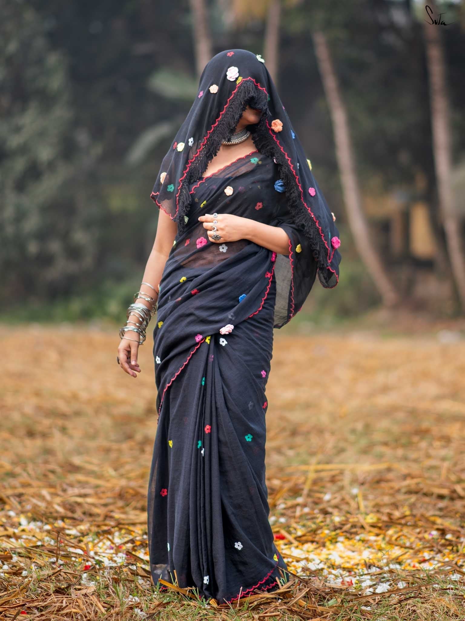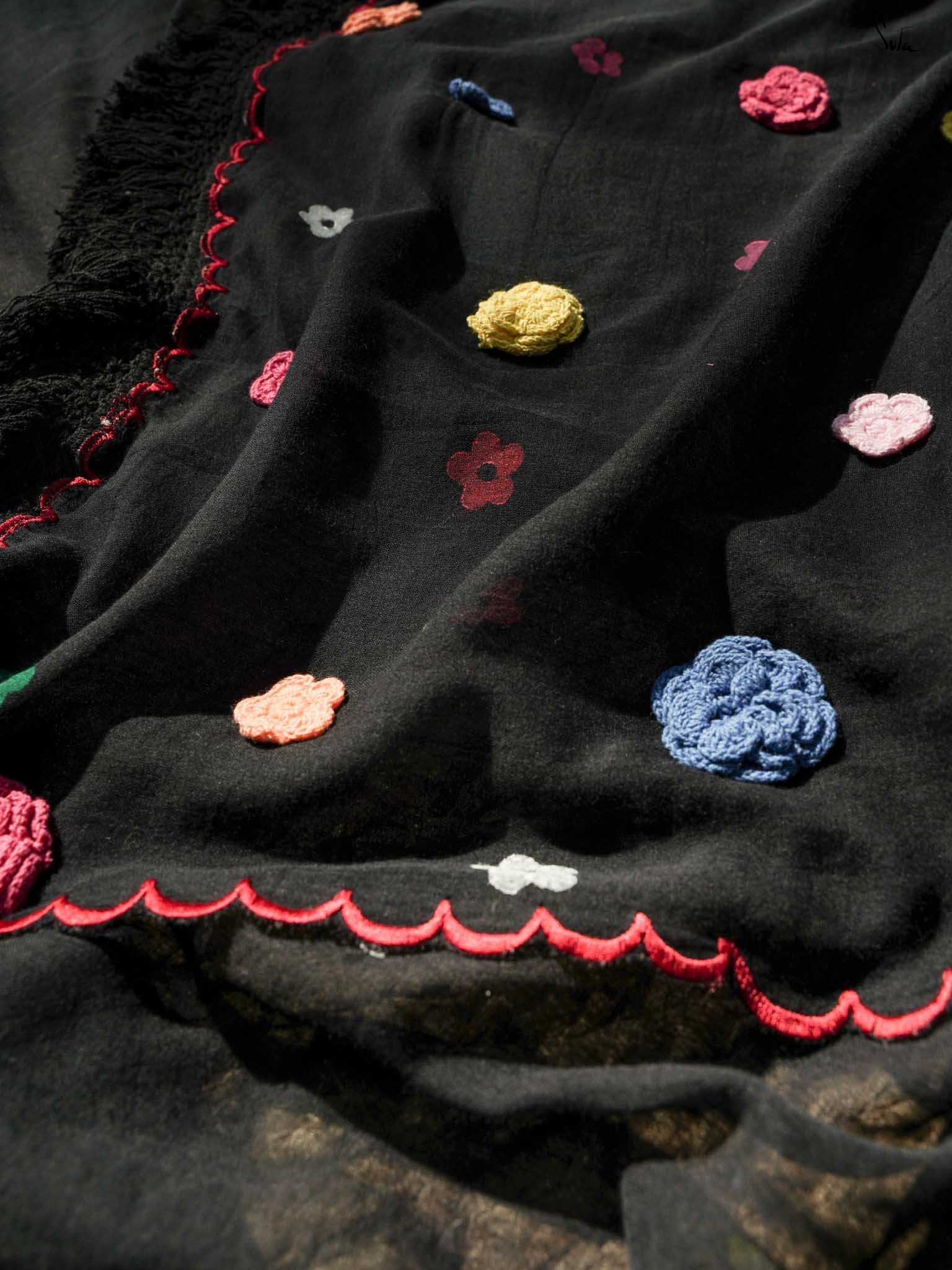 Like a dream spun into fabric, this Black mul cotton saree with multicolor block printed & hand-embroidered flowers dances with whimsy and charm. The 3D crochet flowers bloom like colors swirling in the air during Holi, while delicate block prints whisper stories of long-forgotten legends. The soft scalloped finish and gentle jhalar laces are the final strokes of a dream painted in vibrant hues, a vision of joy and freedom, spun into a saree.
