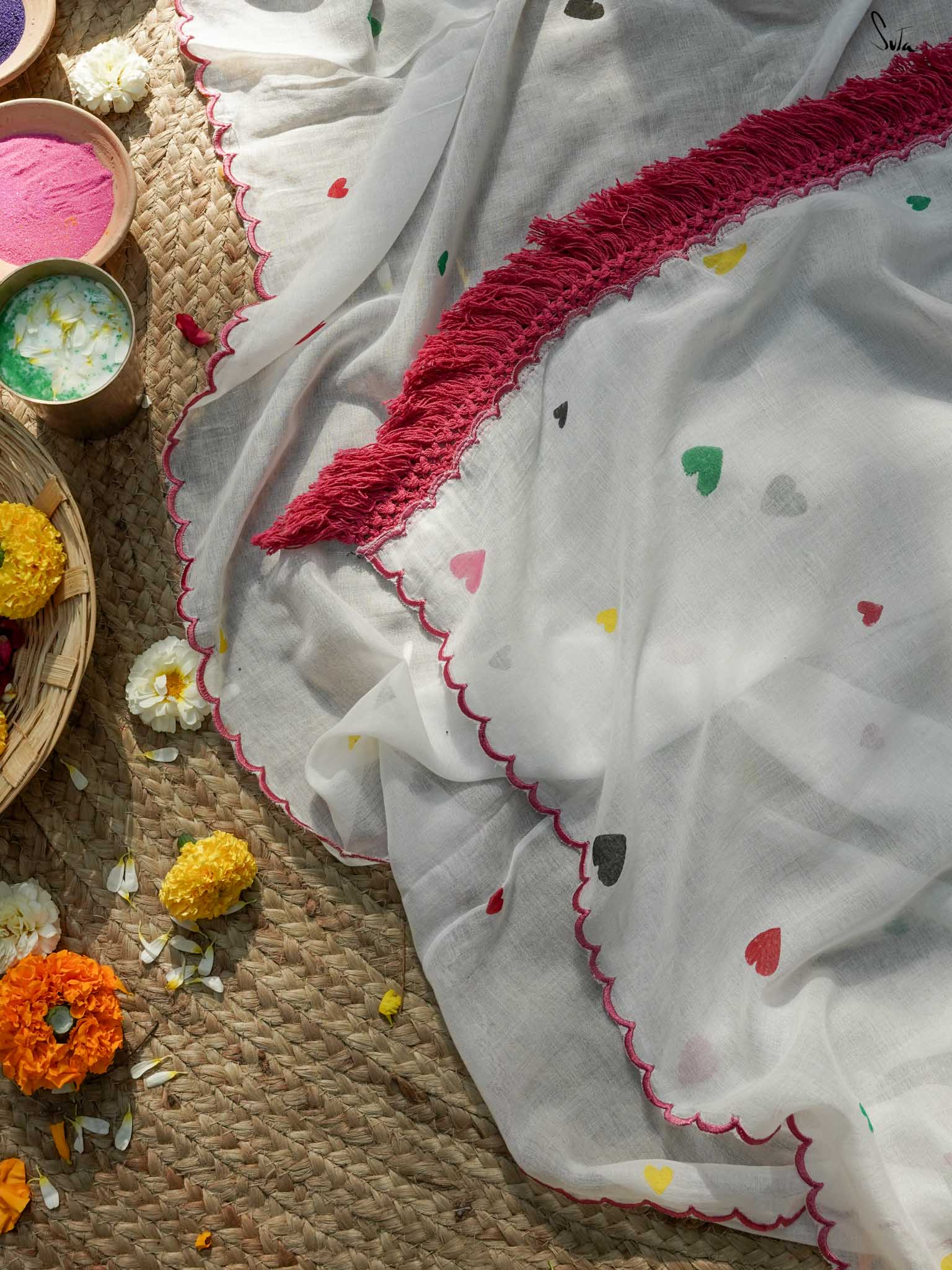 This white sareeis a love letter to Holi itself, a celebration of love stitched into every thread. Each block print & hand-embroidered multicolor heart tells a tale of connection, of moments shared, of memories created on a festival filled with colors. The playful jhalar tassels, with their twinkling charm, add a flutter of excitement, while the scalloped edges bring a soft, romantic feel. It’s the perfect saree for those who wear their heart in the most colorful of ways.