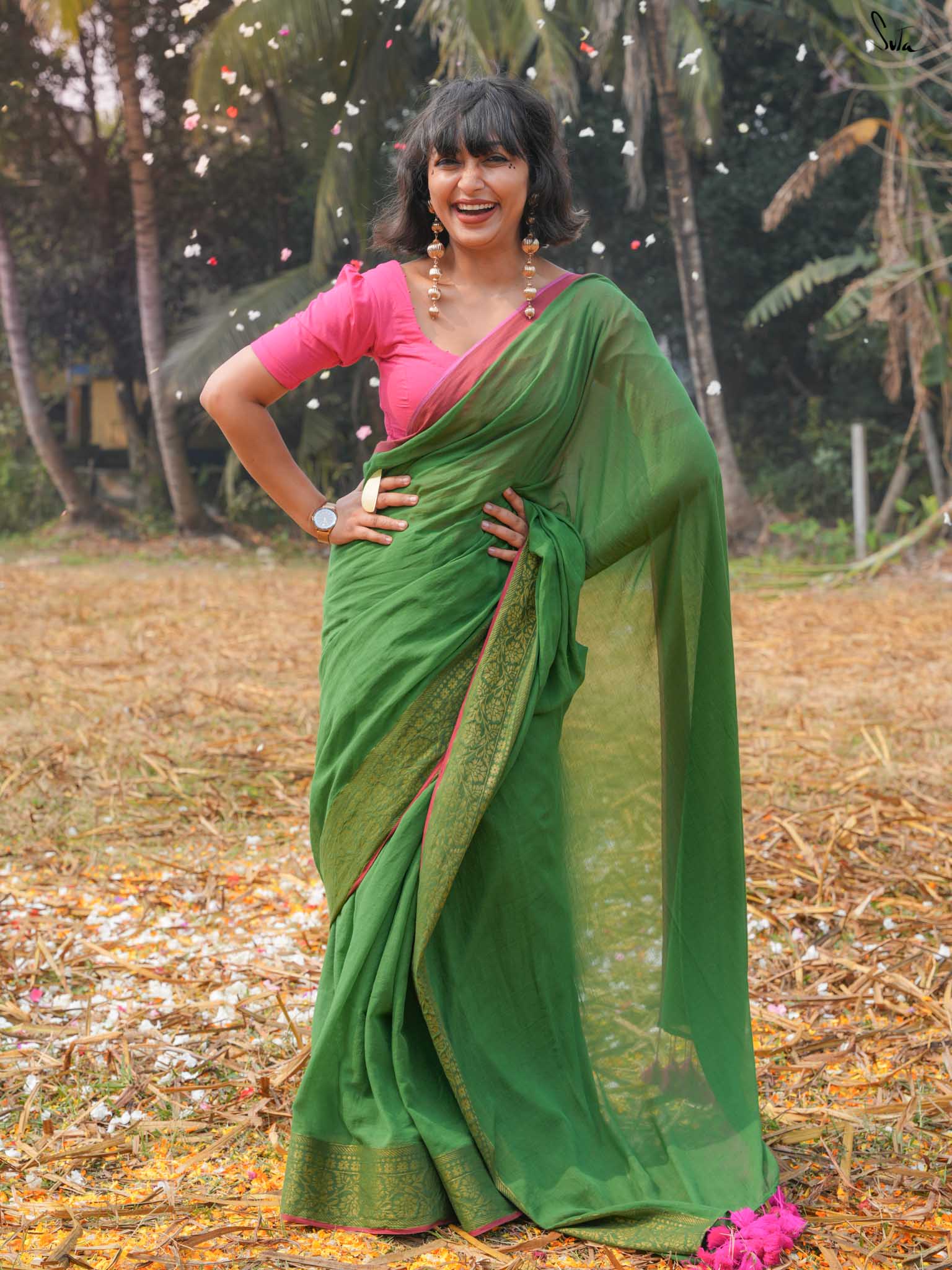 Deep, rich, and full of soul, this olive green mul cotton saree is a tribute to the timeless beauty of henna, the intricate art that decorates the hands of every Holi celebrant. The jacquard weave and zari-woven contrast border bring a subtle elegance, while the shimmering tassels capture the magic of the festival. This saree speaks of connections, of traditions passed through generations, and of the deep beauty found in every celebration.