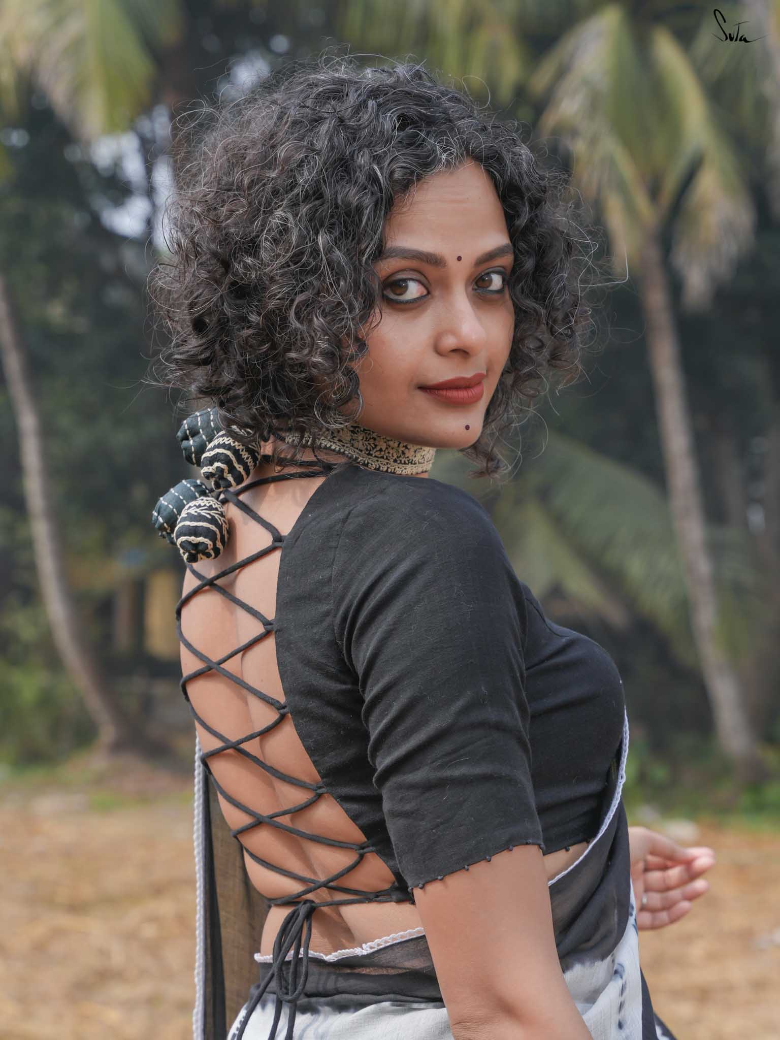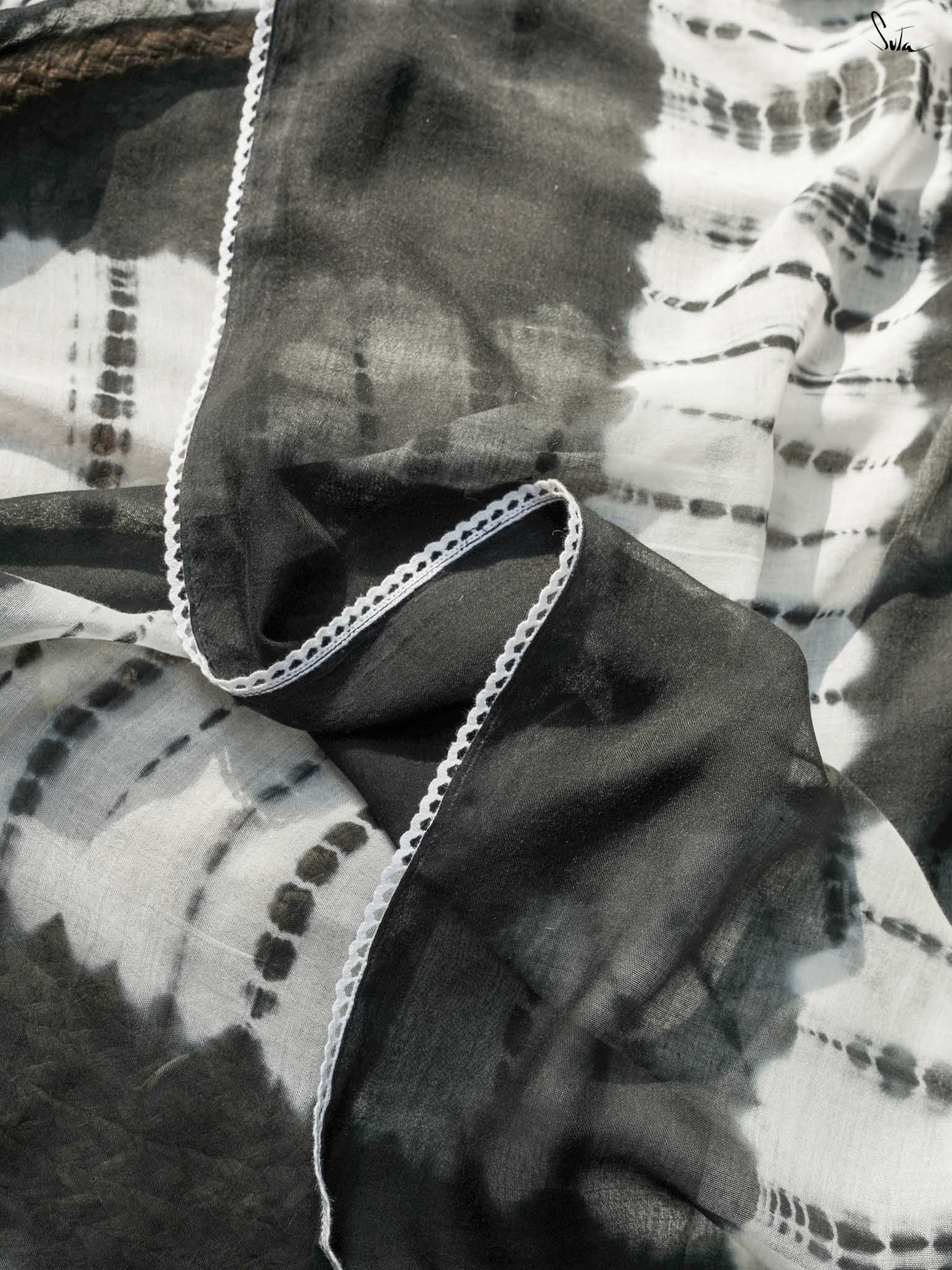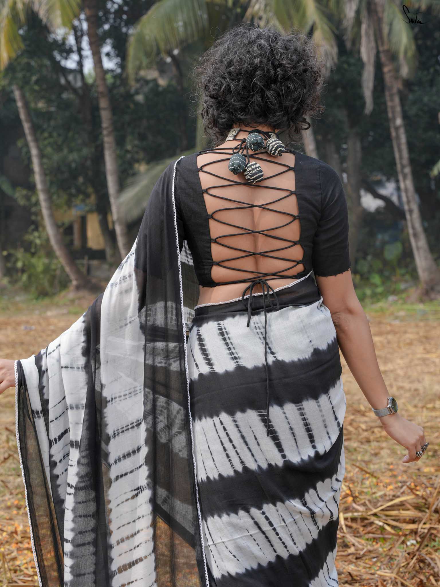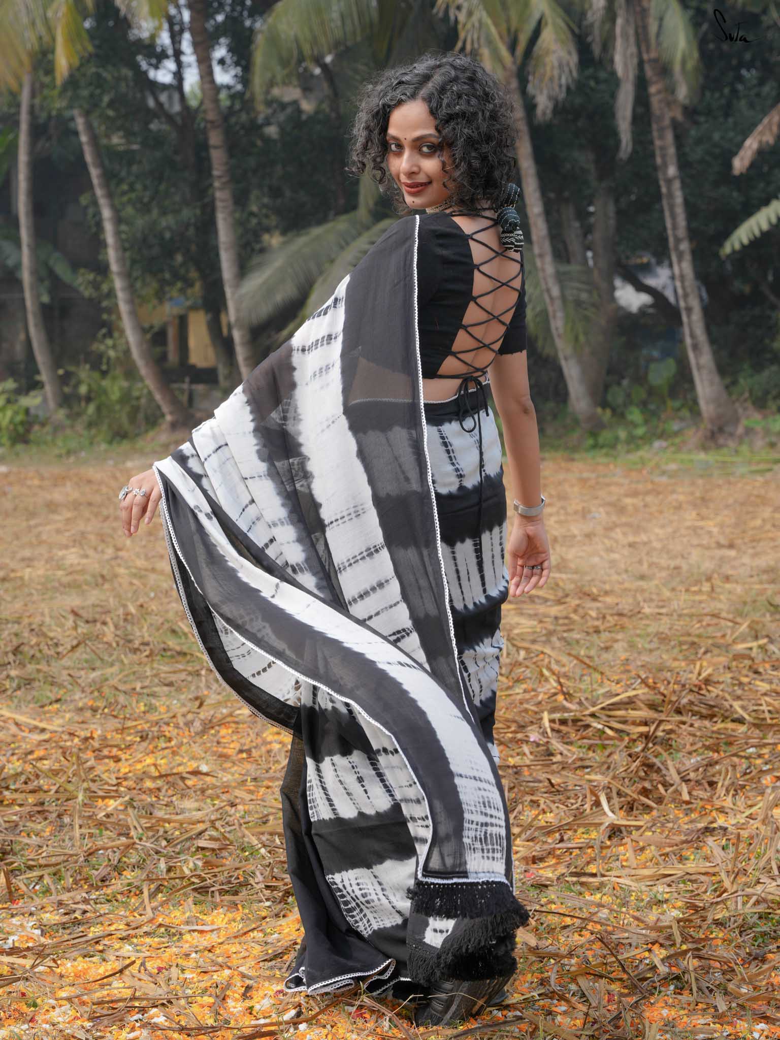 Under the moonlight, everything seems a little more magical like this black-and-white mul modal saree. Its tie-dye artistry and patchwork meet the quiet elegance of the night sky, where the stars shine in their subtle sheen. It’s a celebration of contrasts, dark and light, bold and soft capturing the essence of Holi when night falls, and the half half colors settle into the memories of the day. The lace, scalloped and soft, adds a celestial grace, while the jhalar tassels twinkle like stars in the night sky.