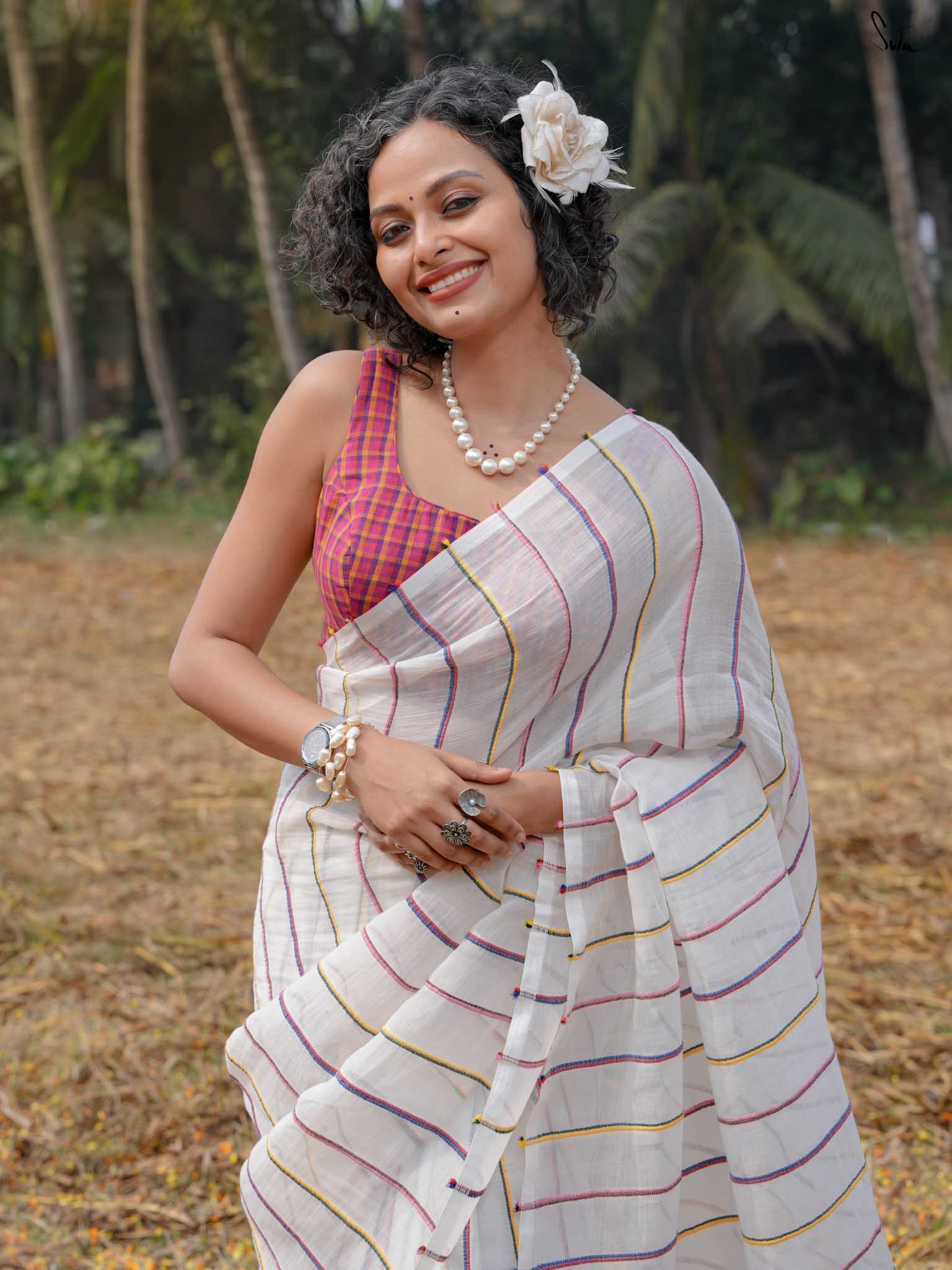 A rainbow of tradition, this multicolored mul khesh saree captures the essence of Holi in its vibrant, handwoven stripes. Each handwoven thread tells a story of craftsmanship passed down through generations, woven with care and joy. The playful jhalar tassels, like droplets of color, swing with every step, carrying a mischievous wink that only the festival of colors can bring. Wrapped in this saree, you’re wearing the spirit of an age-old tradition, reimagined for today’s celebrant.