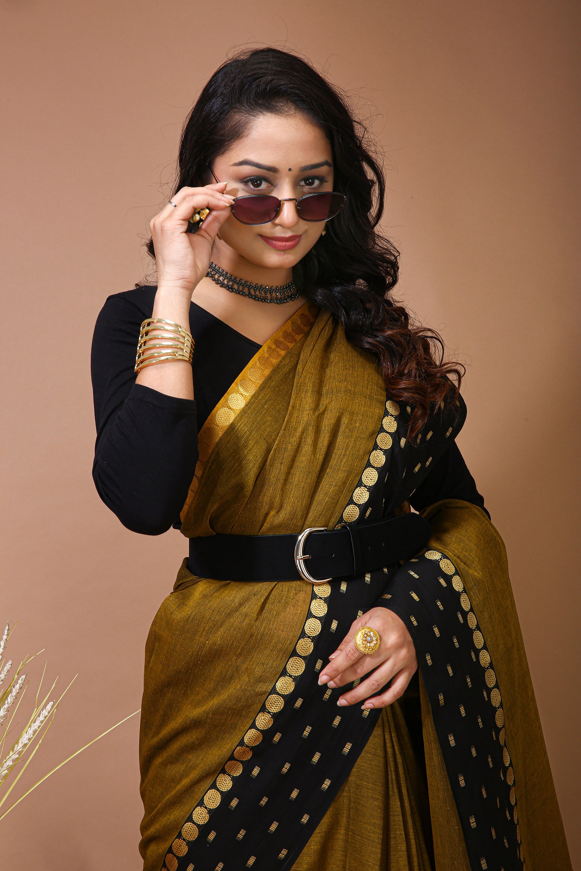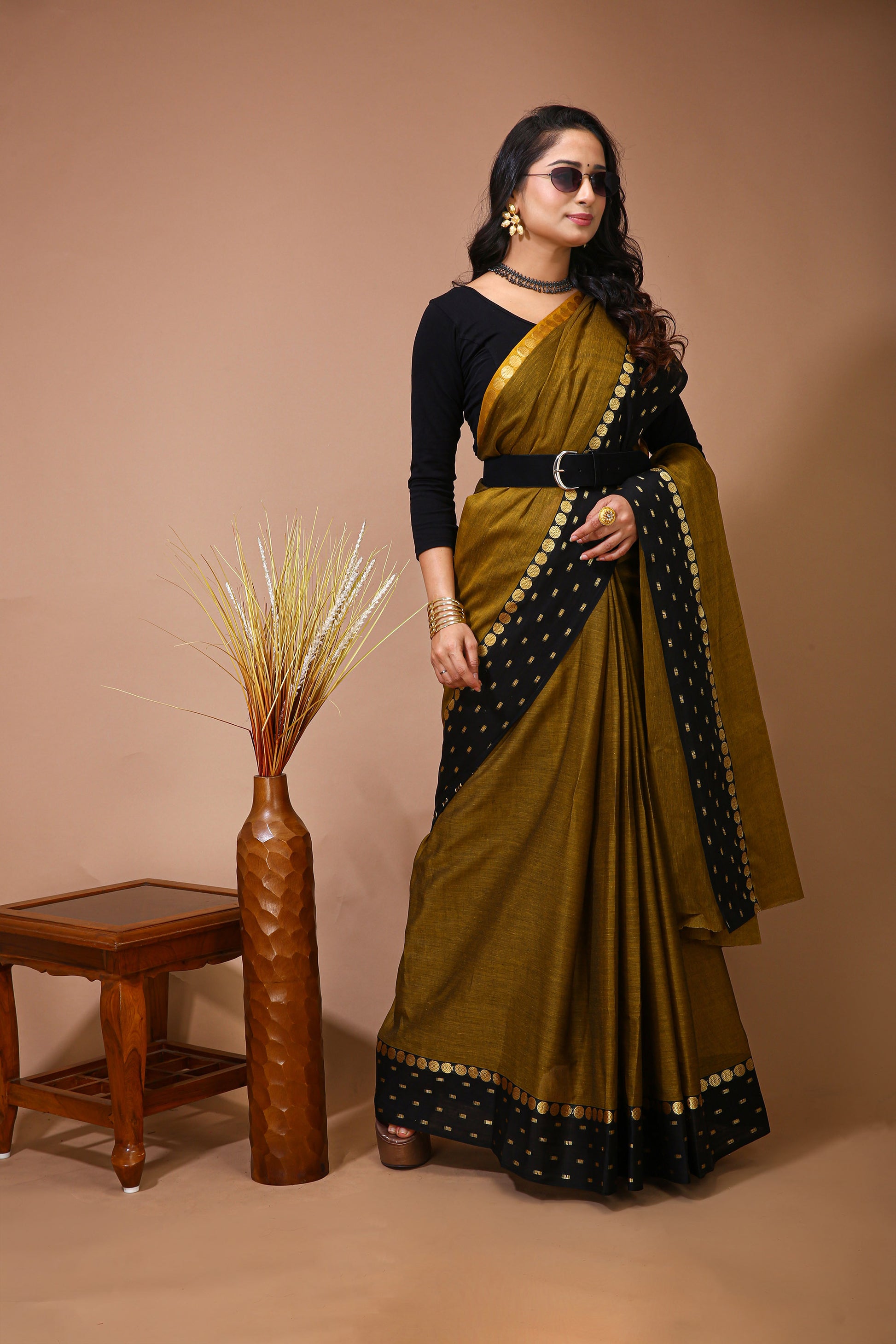 Dori Gold Cotton Self Design Saree