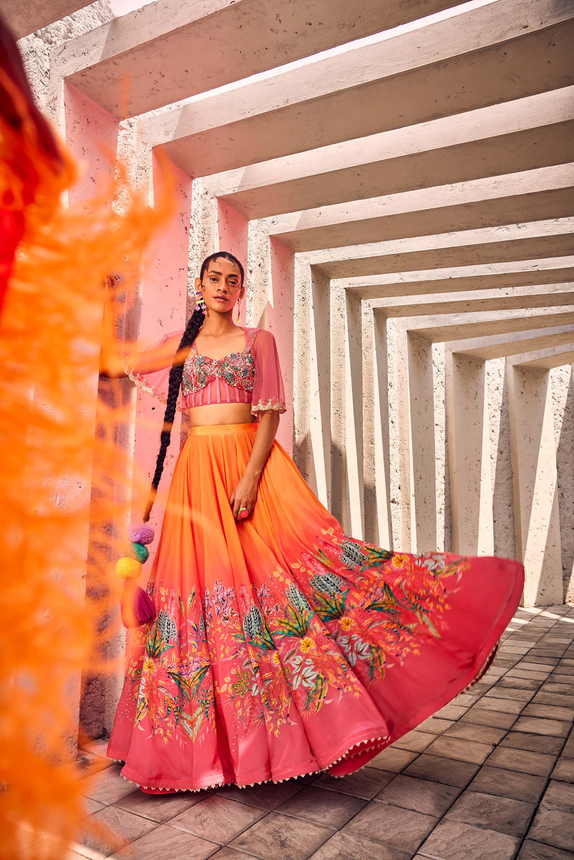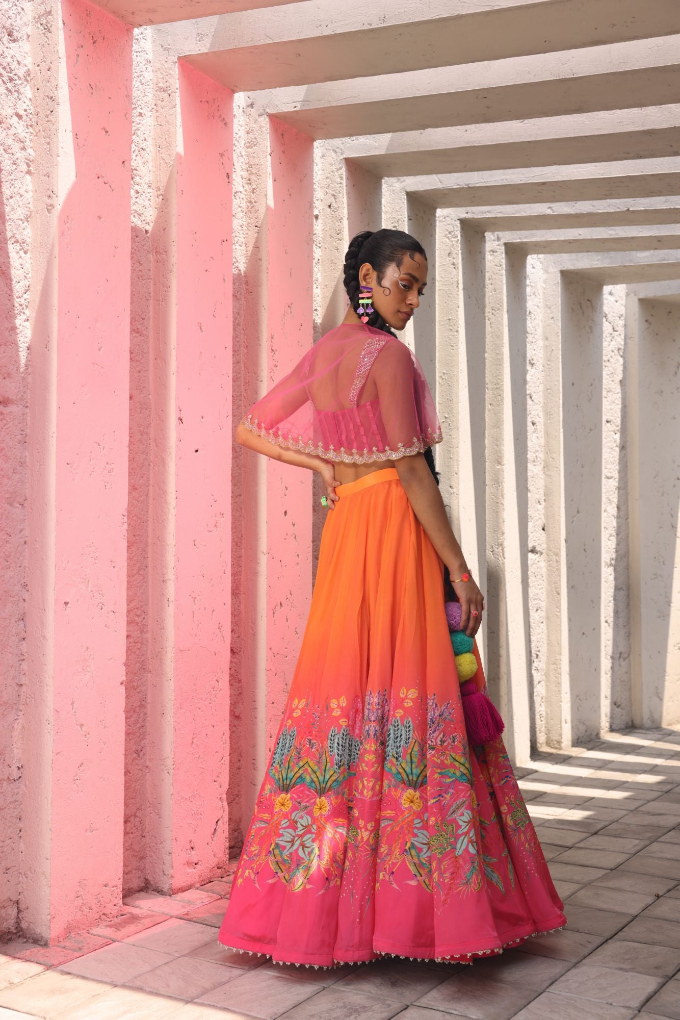 Double shaded Pink & orange floral printed skirt with beautifully hand embroidered corset and tulle cutwork cape