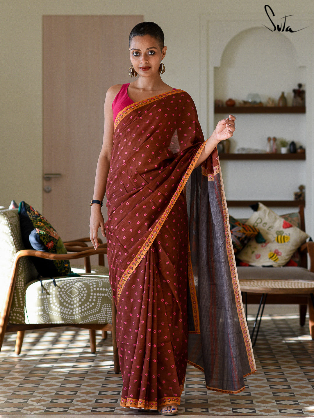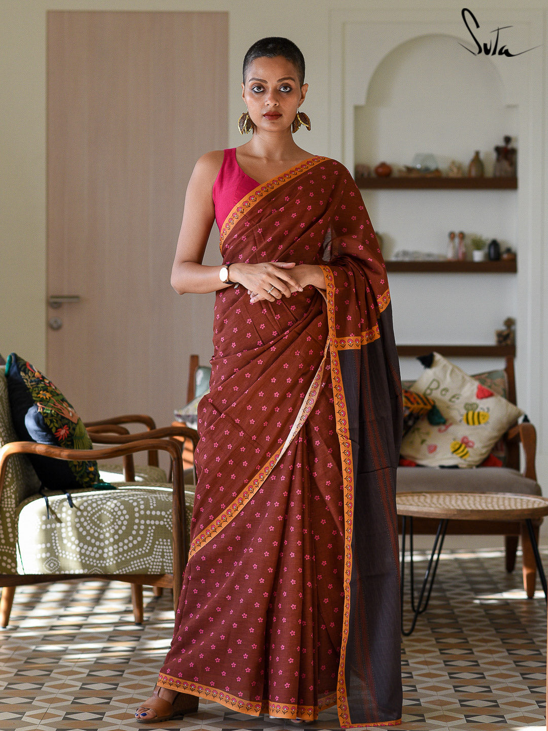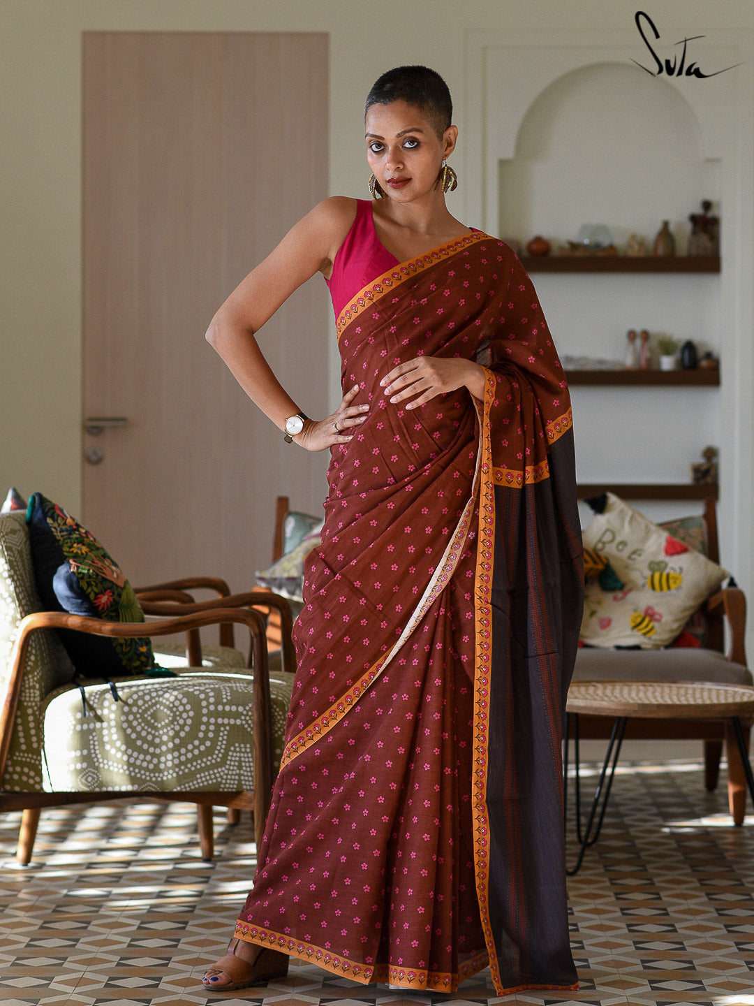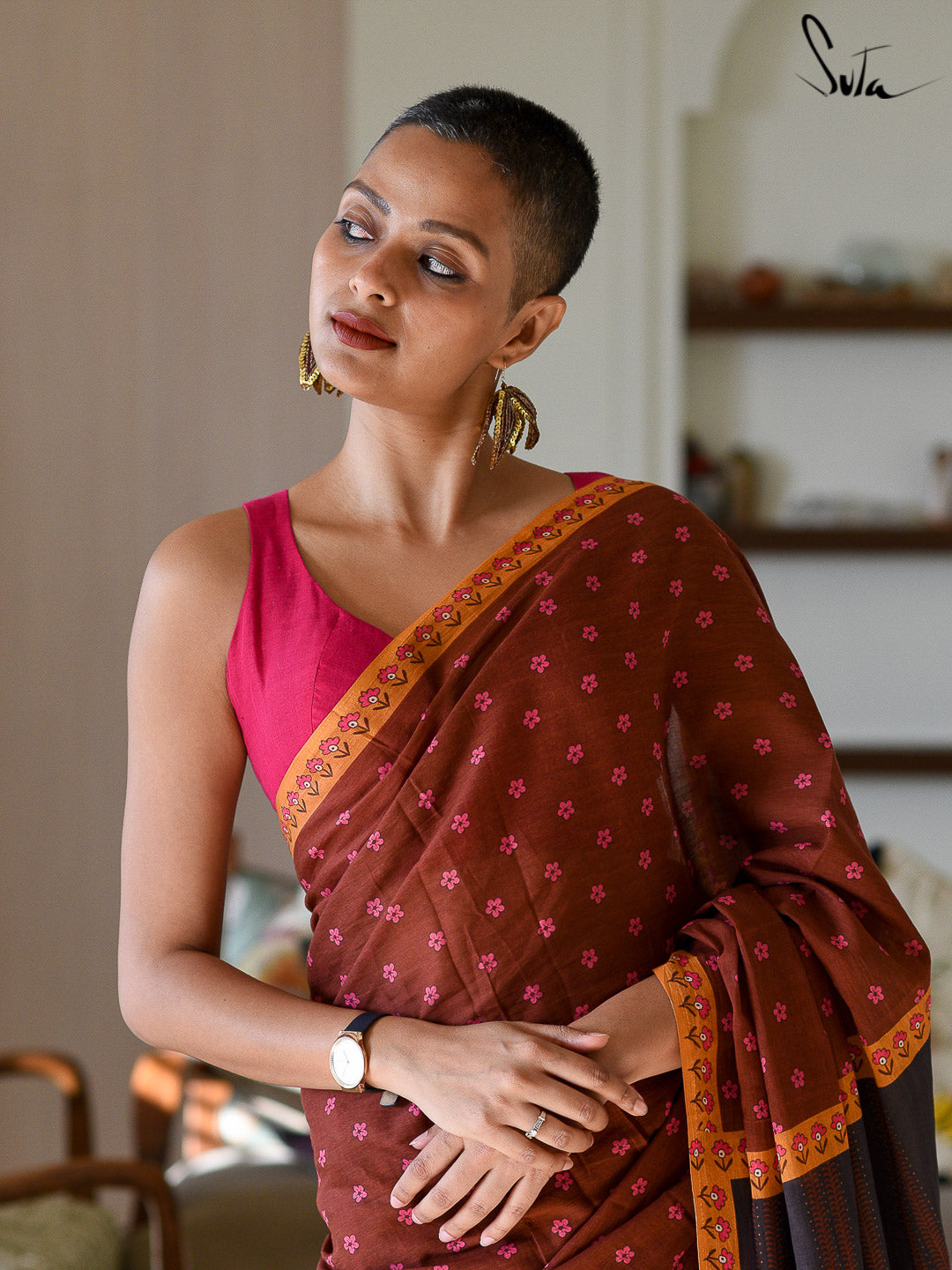 You say dramatic. We raise you to statement. You say beautiful. We raise you to head-turning. You say elegant. We raise you to timeless charm. This gorgeous brown and pink floral saree hits all the right notes with its evocative colour combination and soft, lightweight cotton fabric that makes draping it a dream.