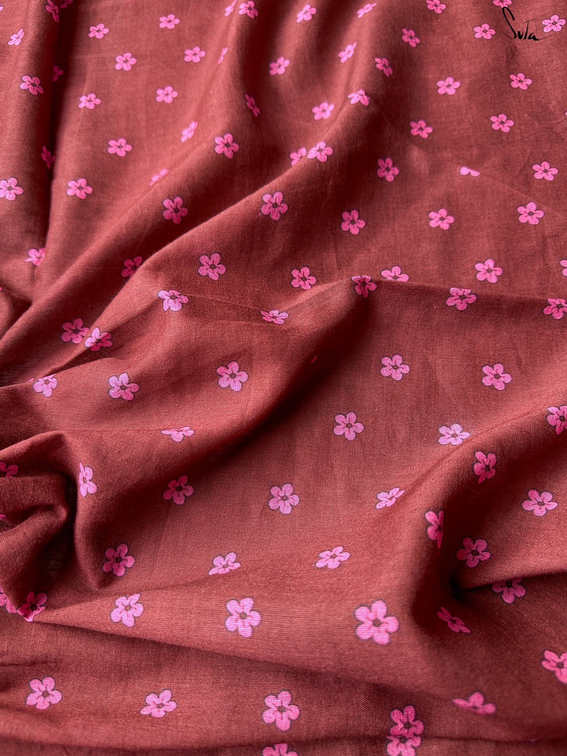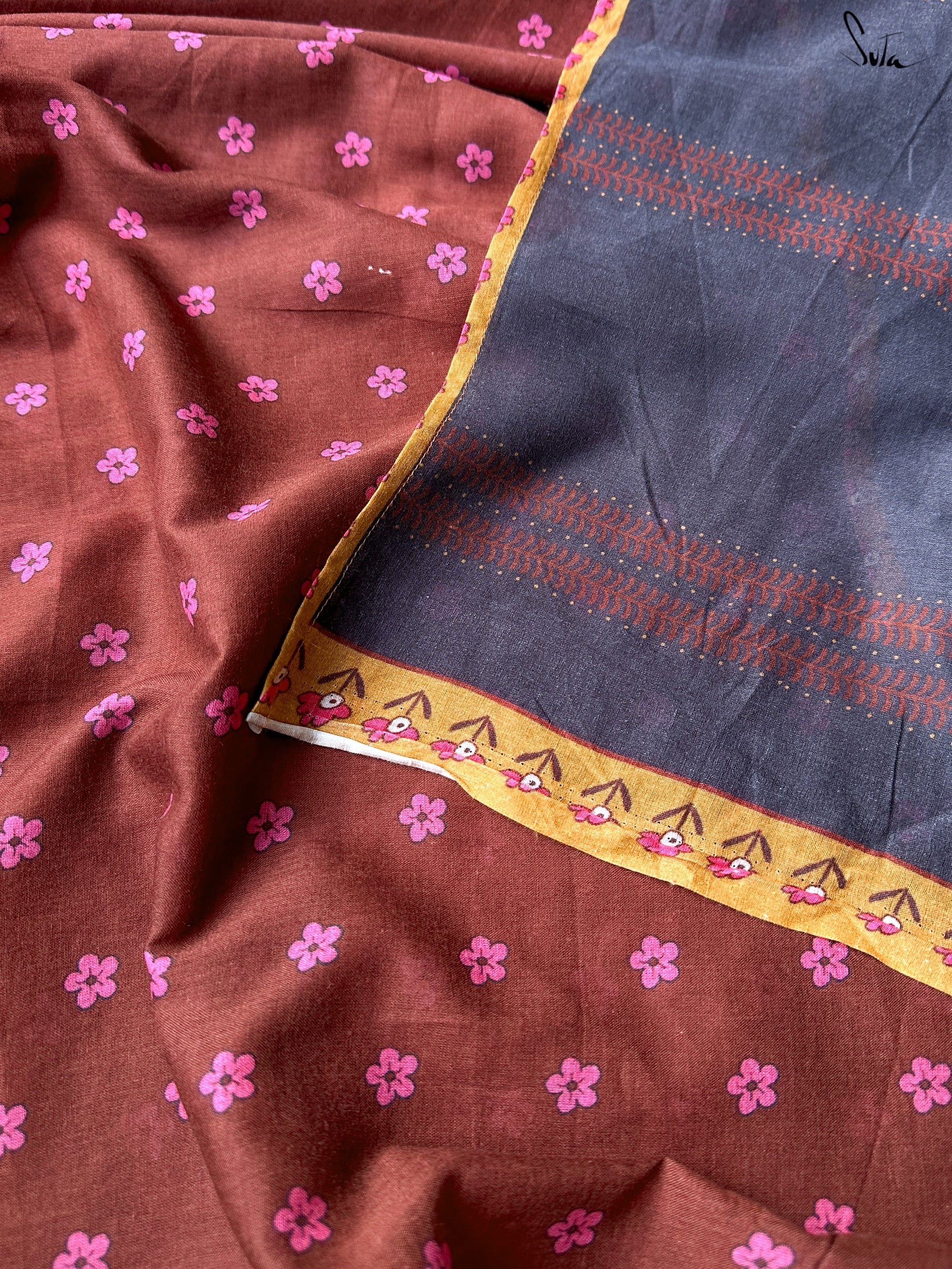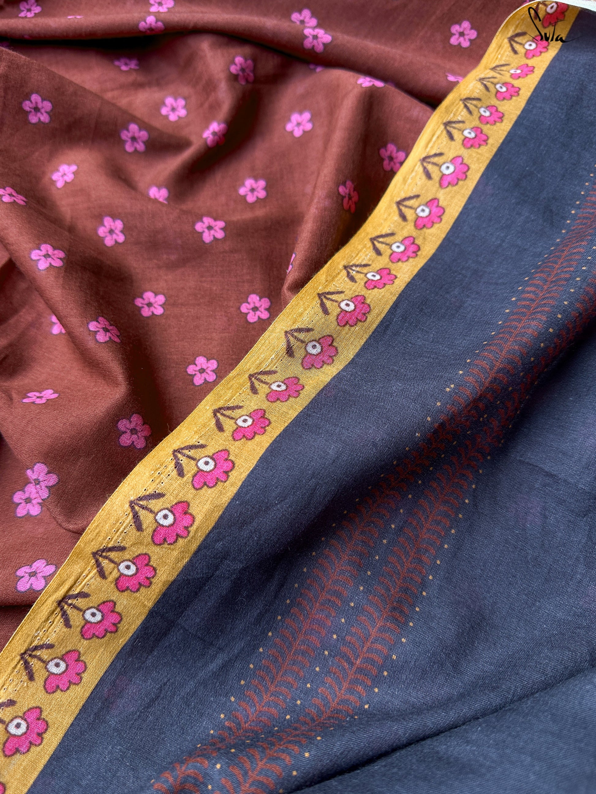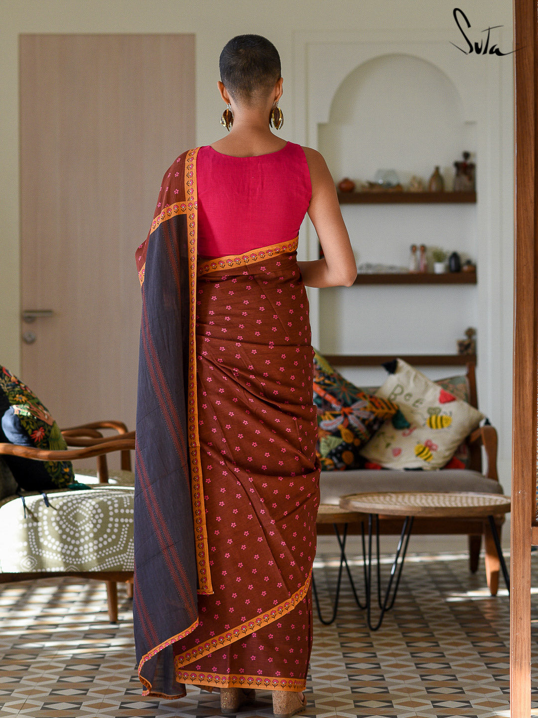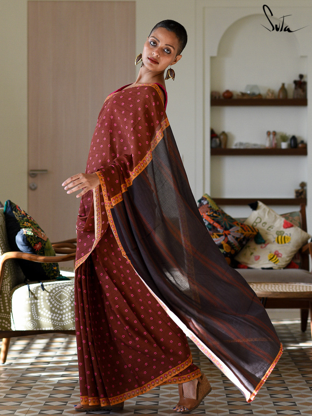 You say dramatic. We raise you to statement. You say beautiful. We raise you to head-turning. You say elegant. We raise you to timeless charm. This gorgeous brown and pink floral saree hits all the right notes with its evocative colour combination and soft, lightweight cotton fabric that makes draping it a dream.
