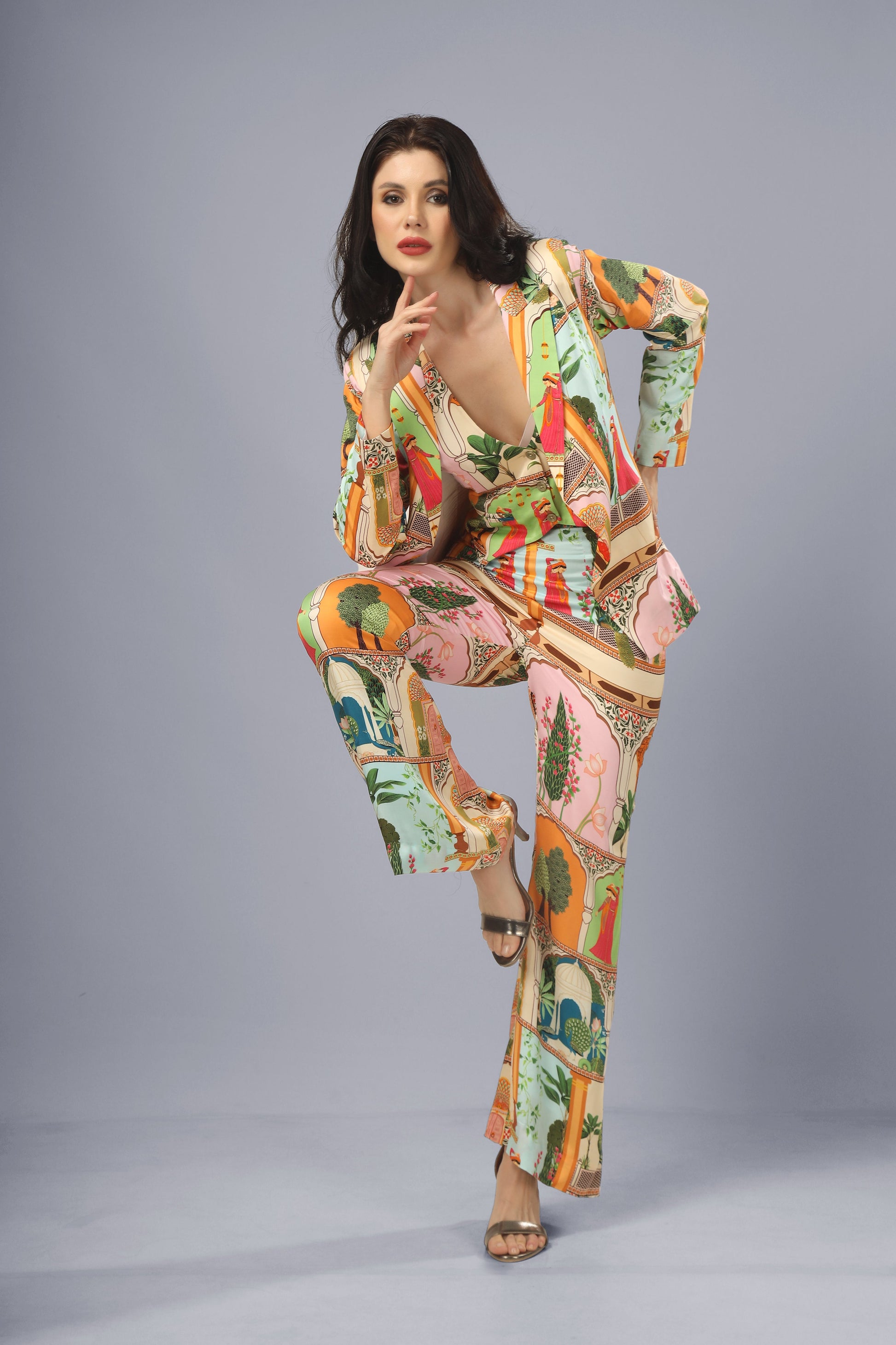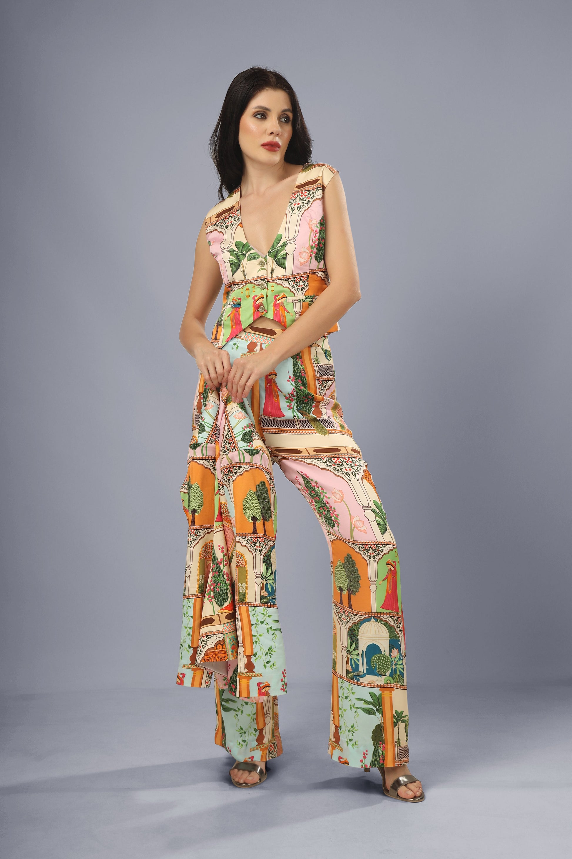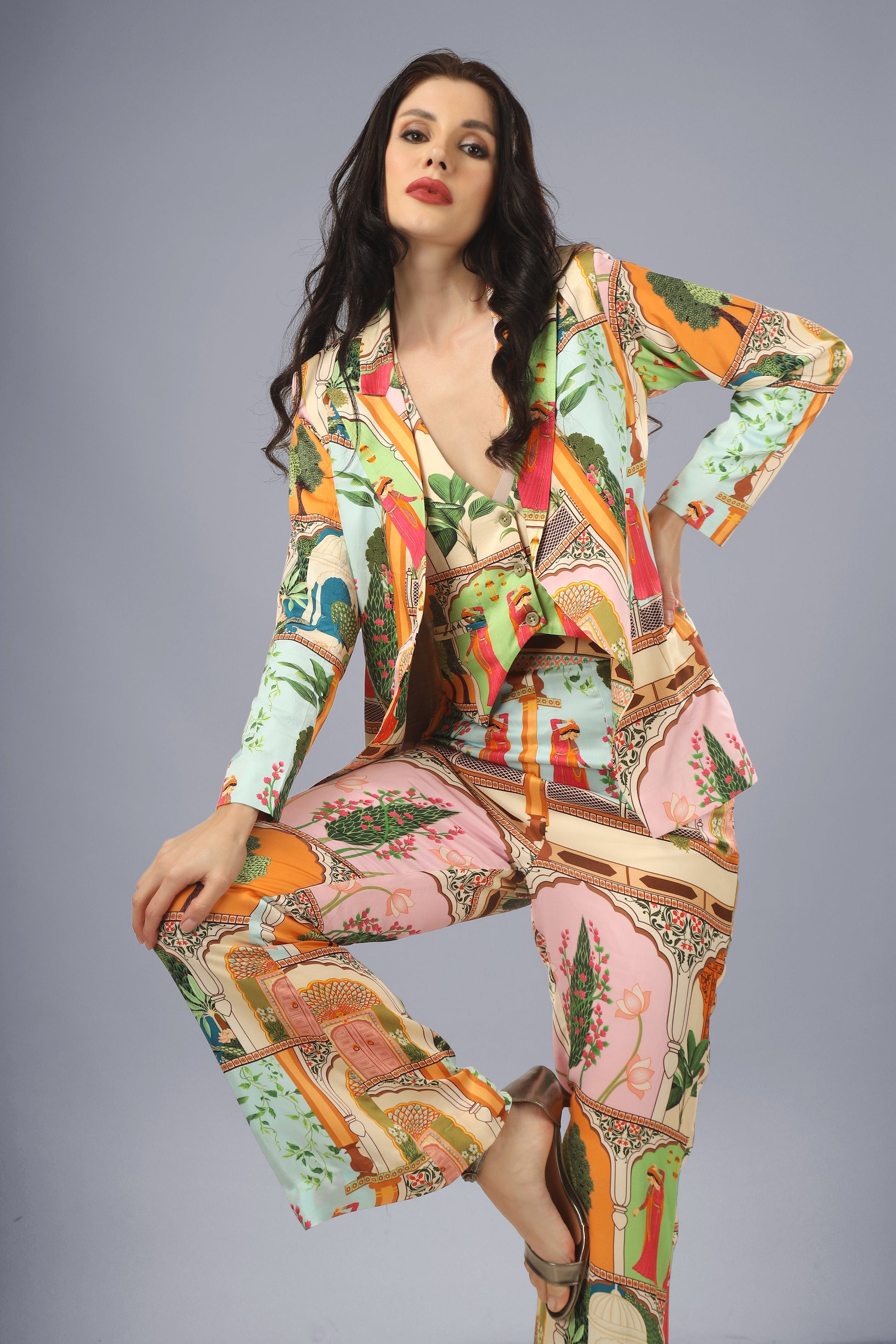 DETAIL- Printed blazer paired with printed bell bottoms and vest. Fully lined.