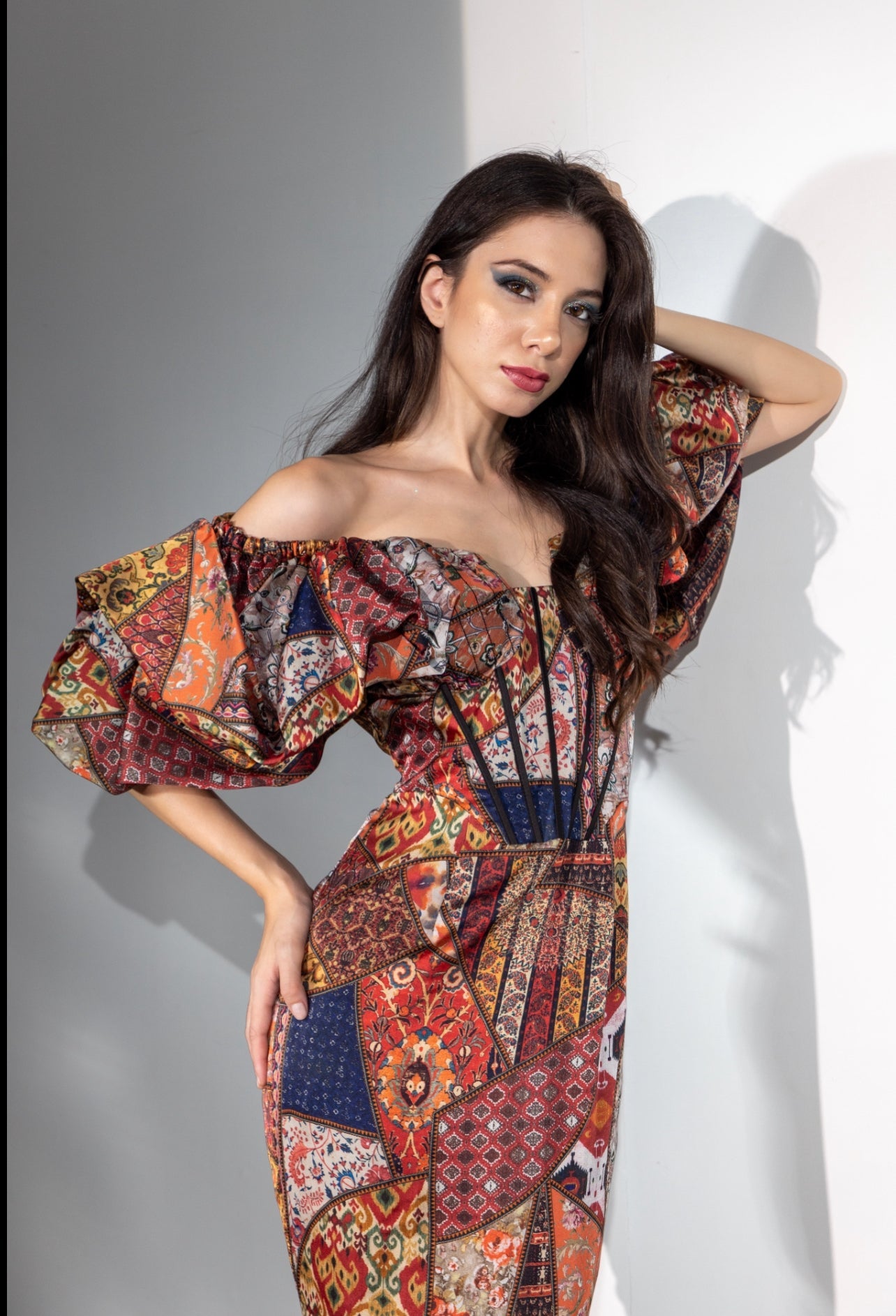 DETAIL- Printed midi dress with ruched bust and corset waist along with frilled sleeves. Padded and back zipper.